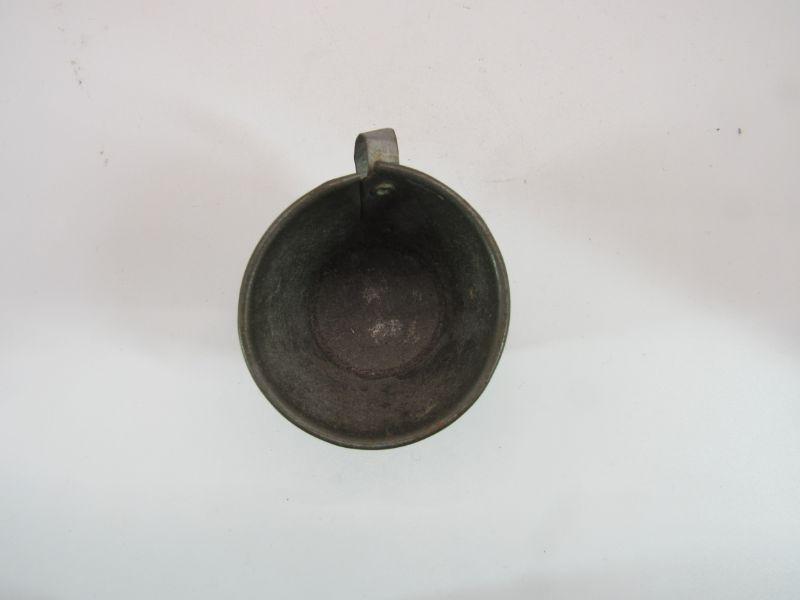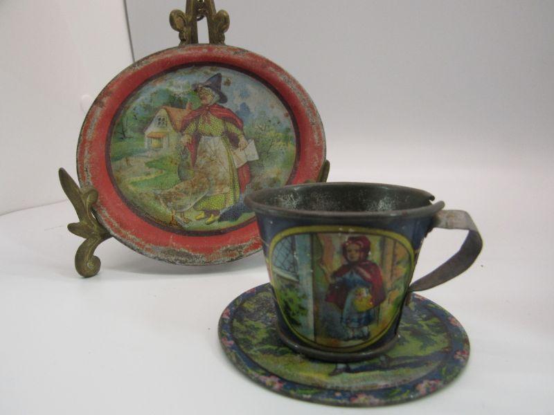 Antique children's tea lunch plate and cup set. Features Mother Goose and Red Riding Hood images. Two plates and a cup. All have signs of age, scratches, wear, discolor, and rust but display nice. #499a34