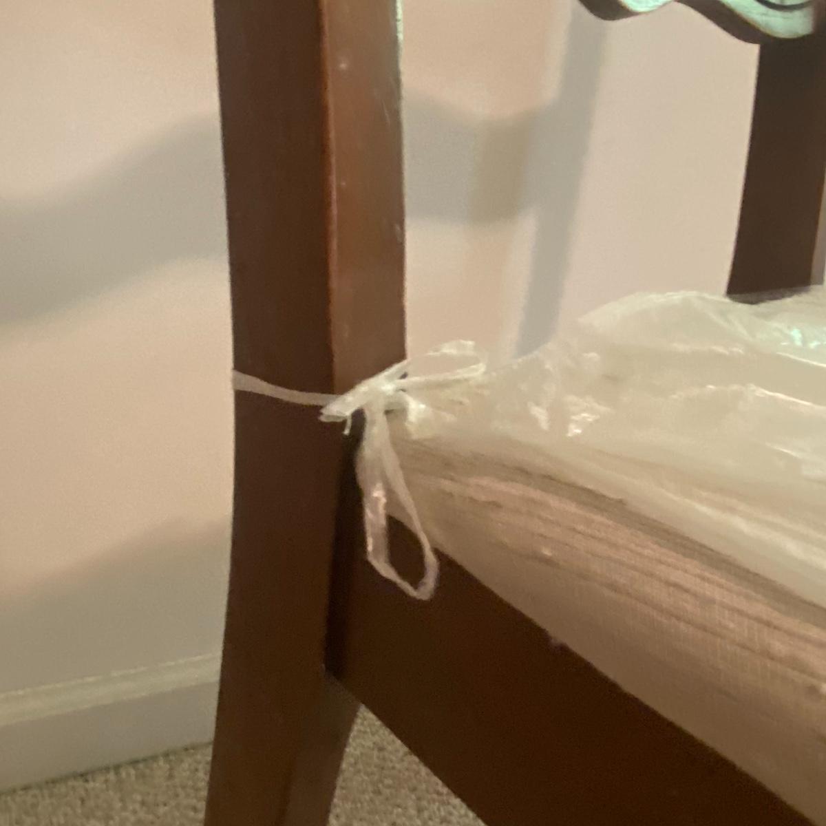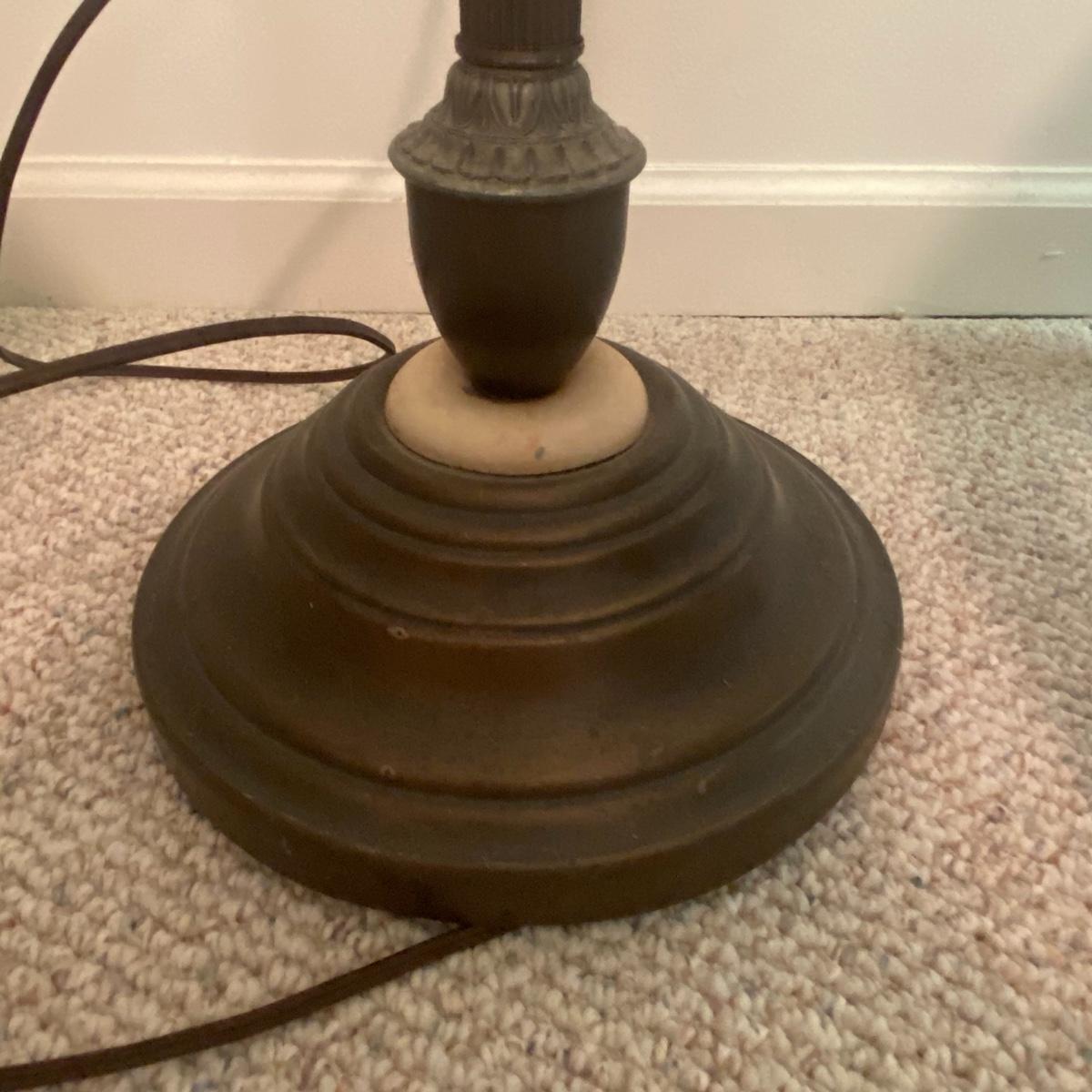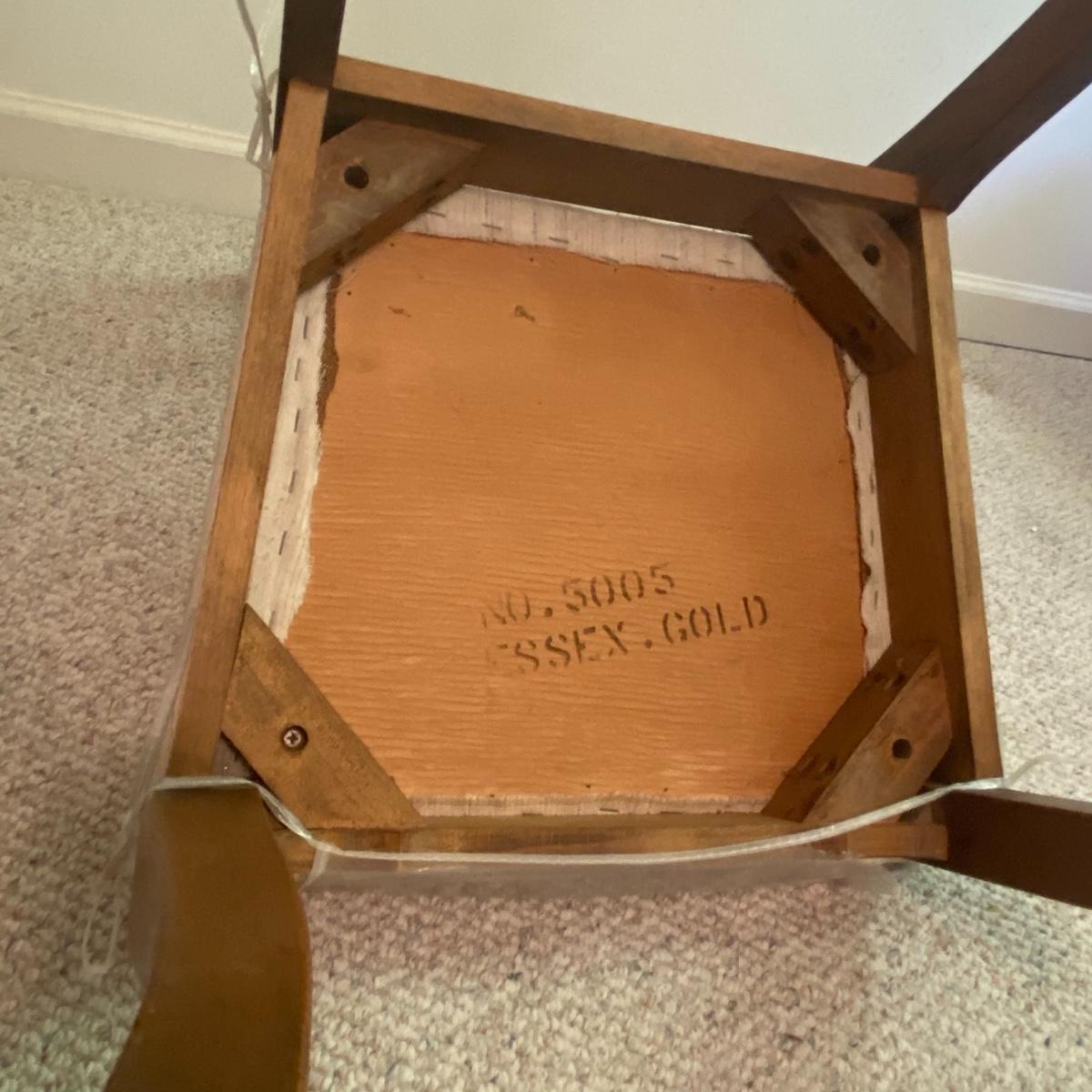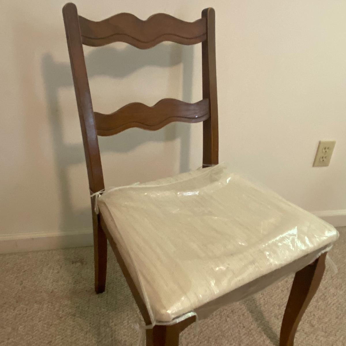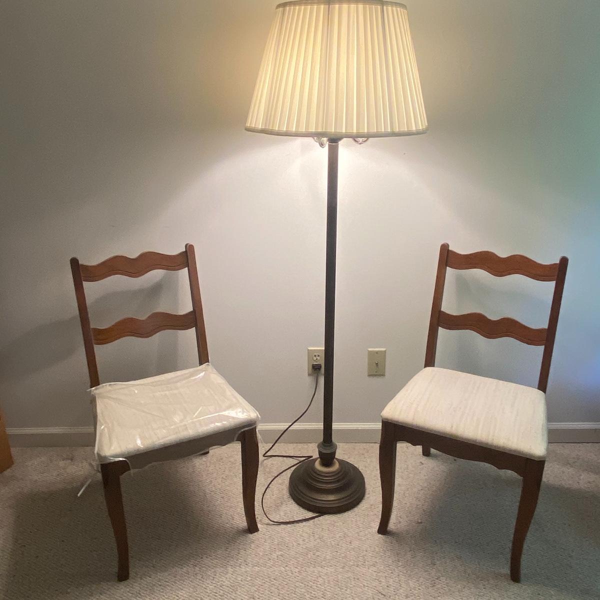 This lot includes a unique floor lamp with different lighting settings for any preference! Lamp includes large white shade. See photos. Lamp stands 61.5” tall. Two dining chairs match with cute curved wooden designs. Matching seat padding as well, one chair includes plastic seat cover. See photos. Measurements for the chairs are 18”x16”x17”. Including the back, chairs stand 32.5” tall. Local pickup only.