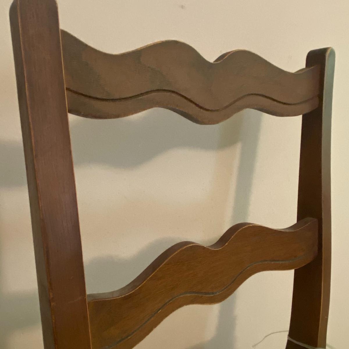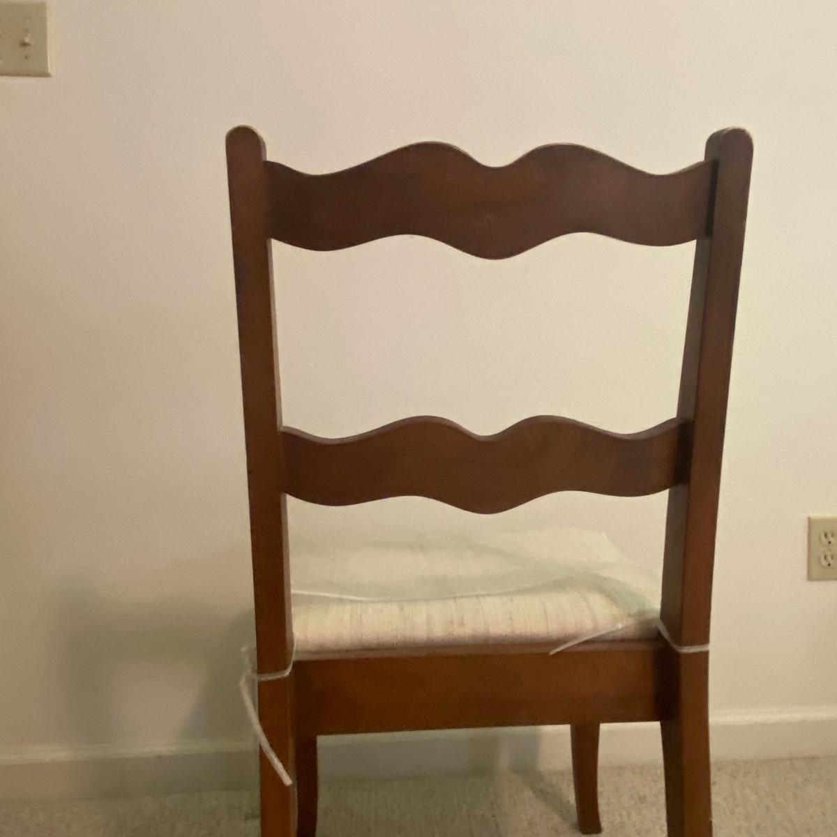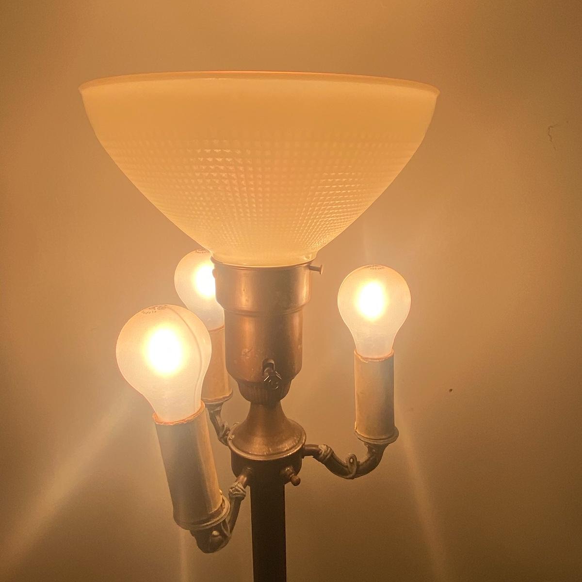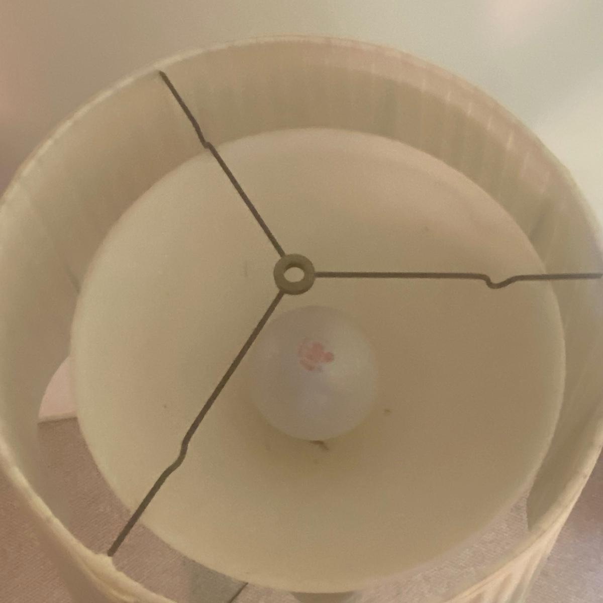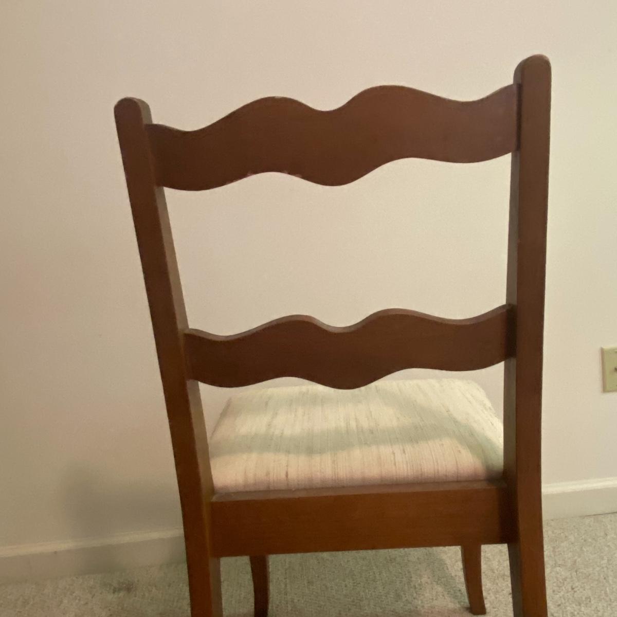 This lot includes a unique floor lamp with different lighting settings for any preference! Lamp includes large white shade. See photos. Lamp stands 61.5” tall. Two dining chairs match with cute curved wooden designs. Matching seat padding as well, one chair includes plastic seat cover. See photos. Measurements for the chairs are 18”x16”x17”. Including the back, chairs stand 32.5” tall. Local pickup only.