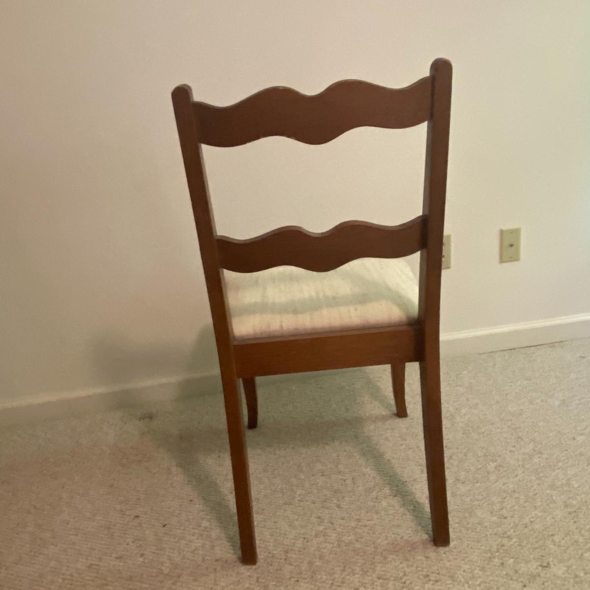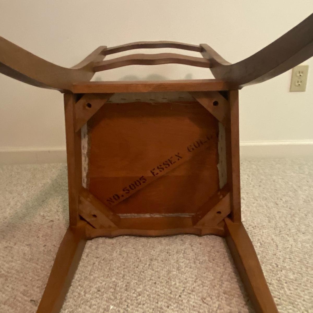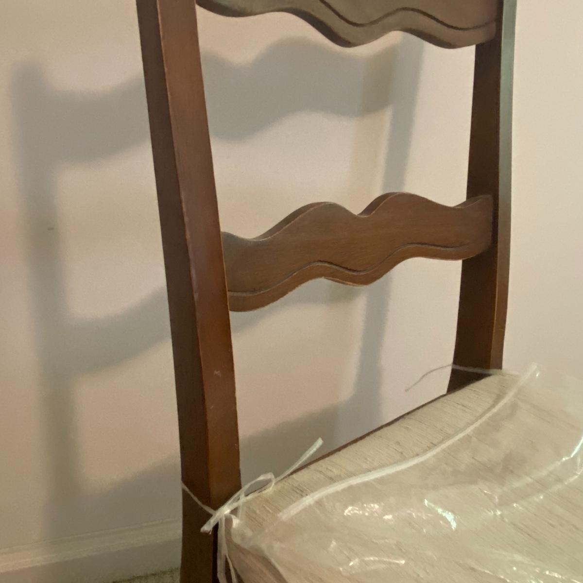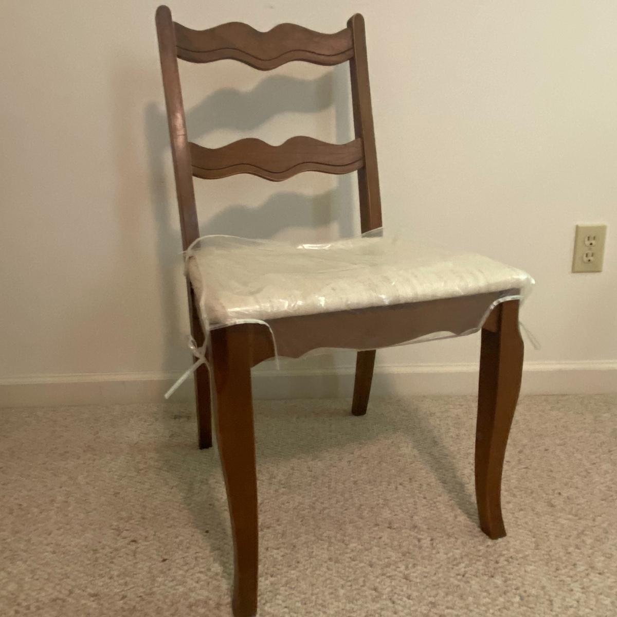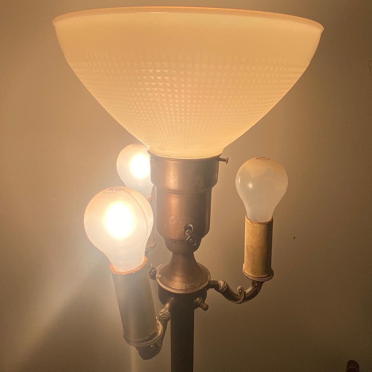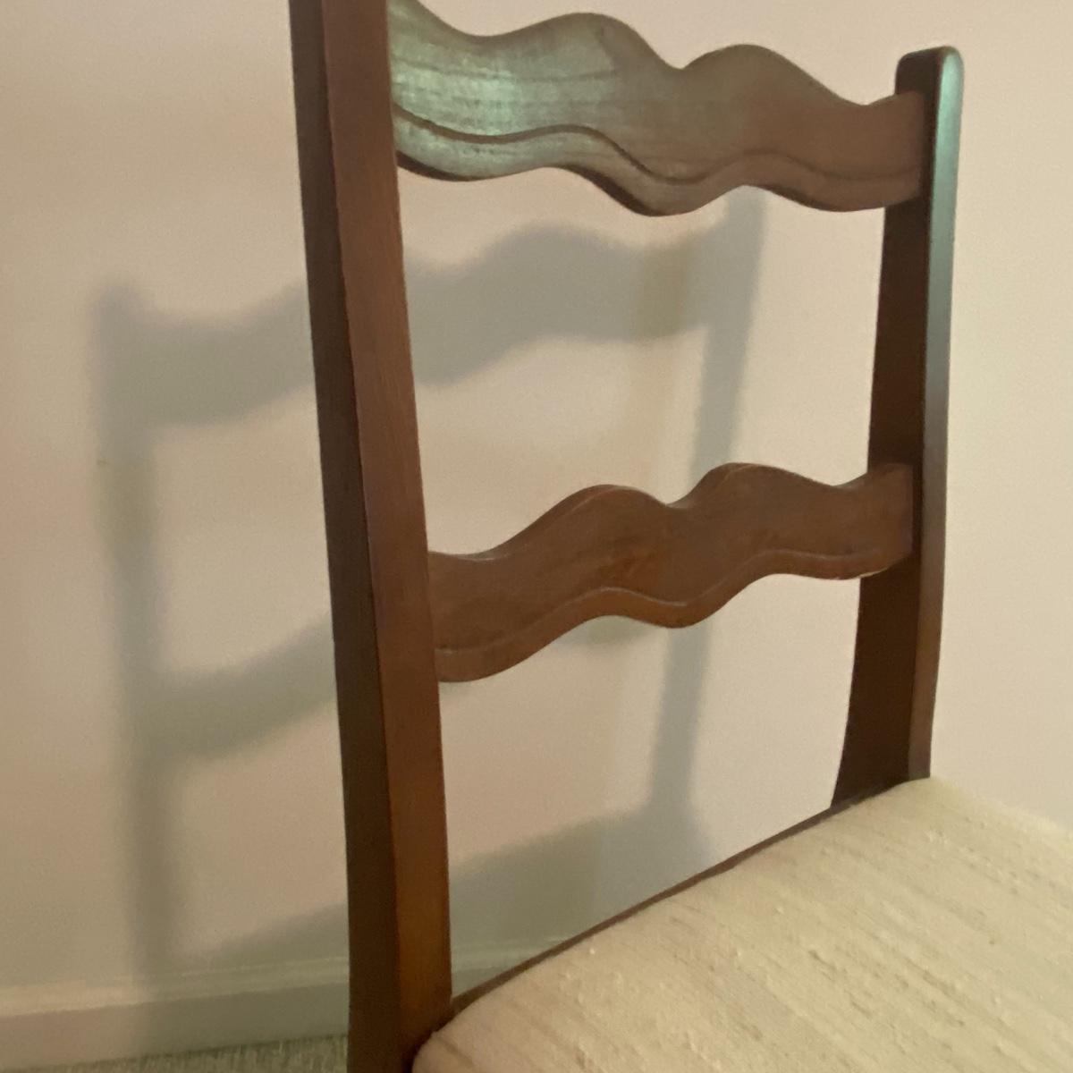 This lot includes a unique floor lamp with different lighting settings for any preference! Lamp includes large white shade. See photos. Lamp stands 61.5” tall. Two dining chairs match with cute curved wooden designs. Matching seat padding as well, one chair includes plastic seat cover. See photos. Measurements for the chairs are 18”x16”x17”. Including the back, chairs stand 32.5” tall. Local pickup only.