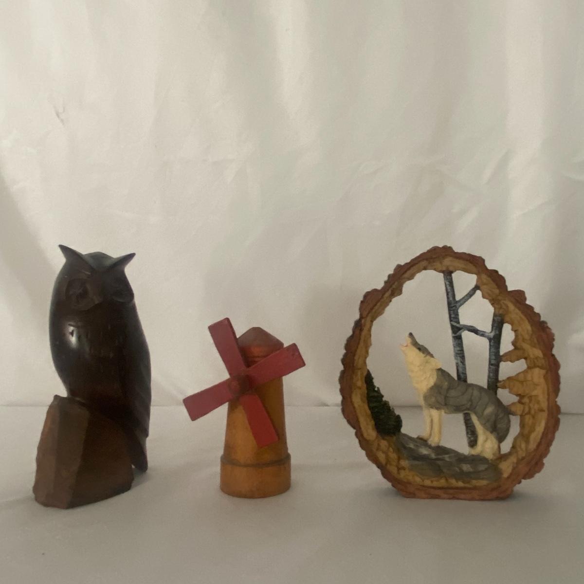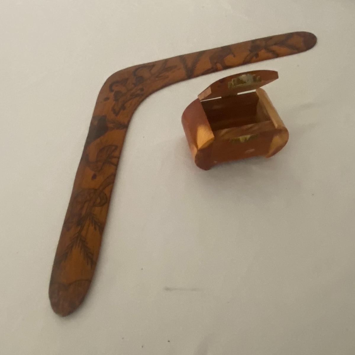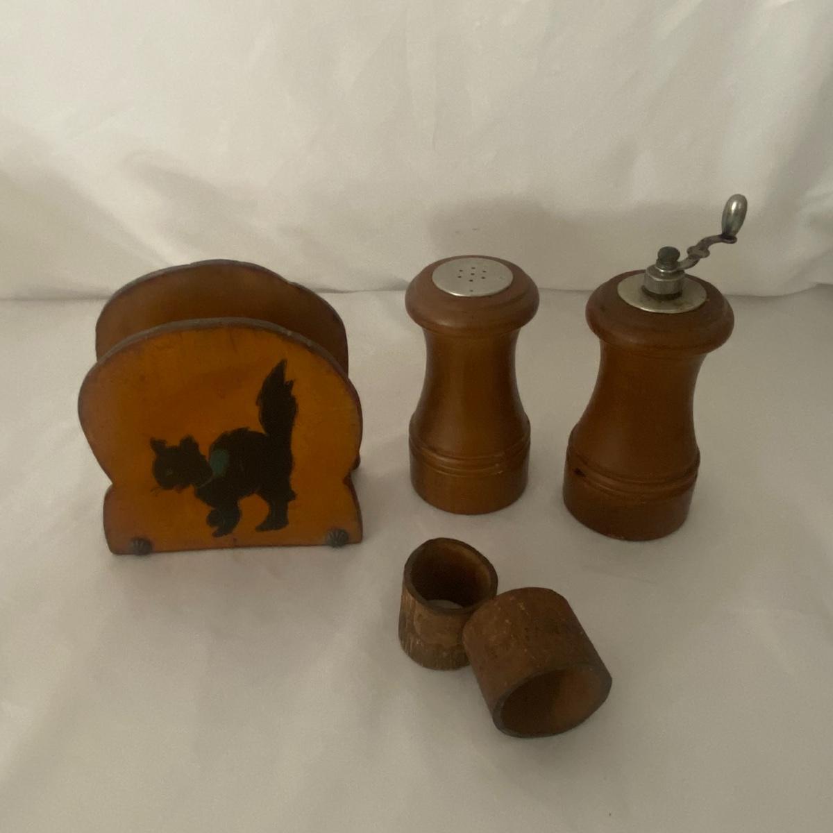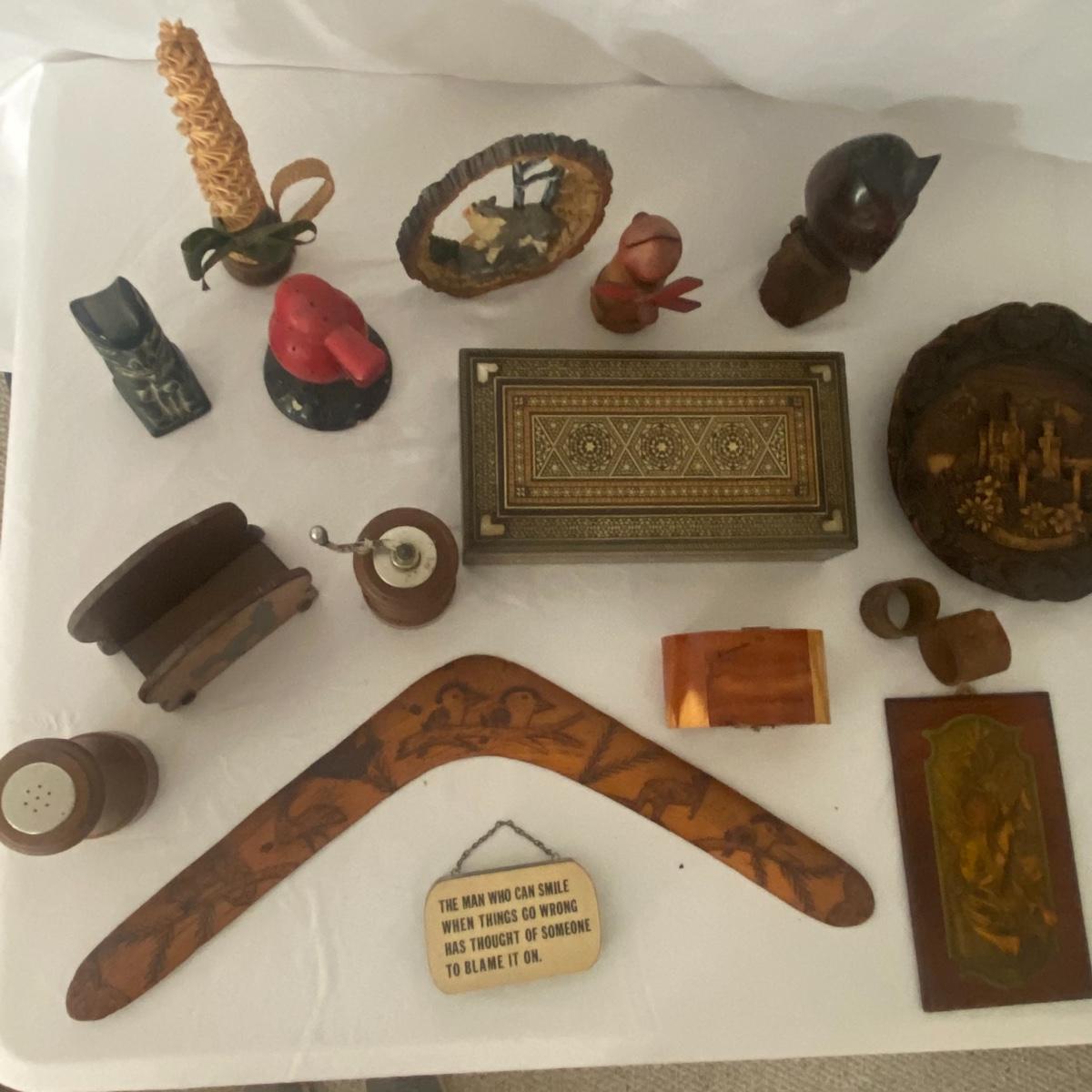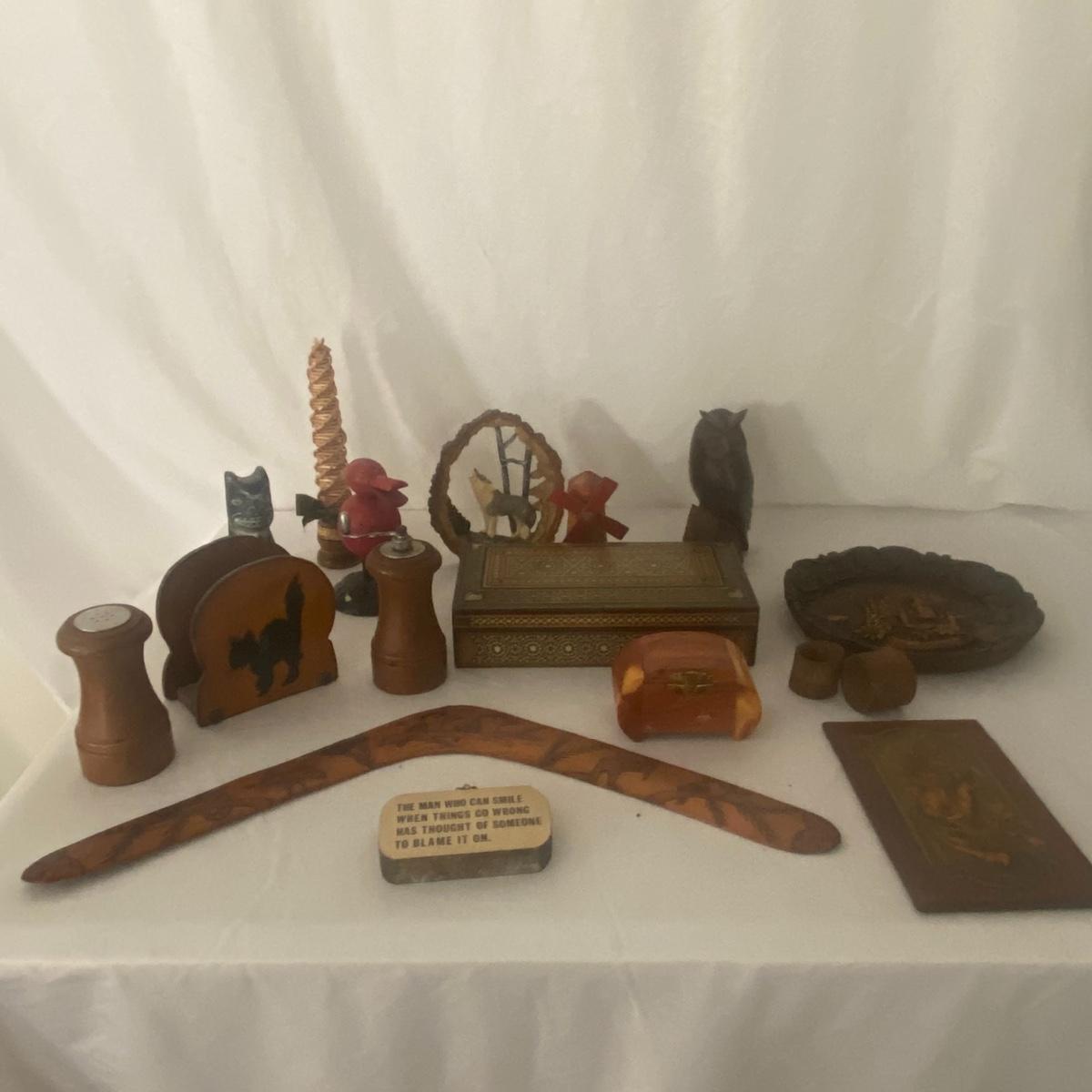 Enjoy this lot of many unique wood pieces! Lot includes wooden napkin holder, salt and pepper shakers, and table center pieces. Wooden wall art, a boomerang, and a small windmill coin bank included as well! See photos. See photos of adorable wooden boxes, larger box with a fabulous design and red lining measures 10.5”x5.5”. Local pickup only.