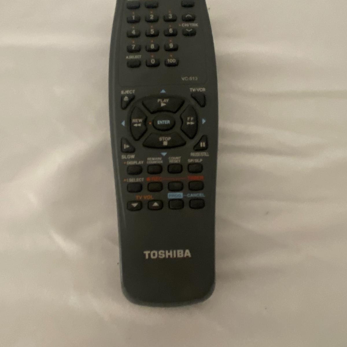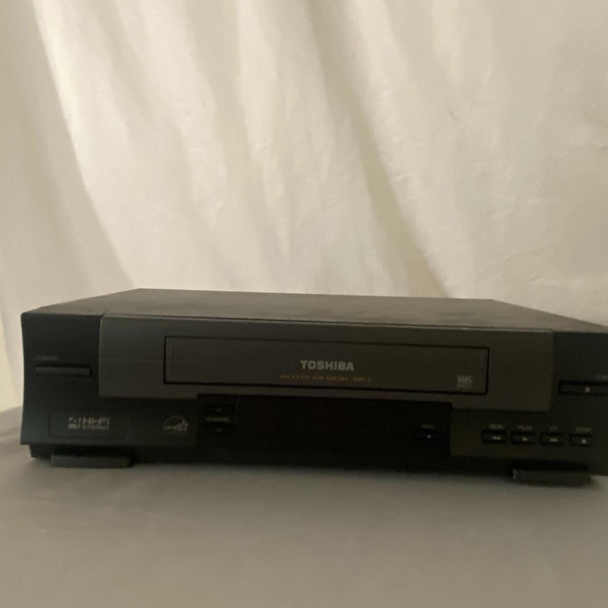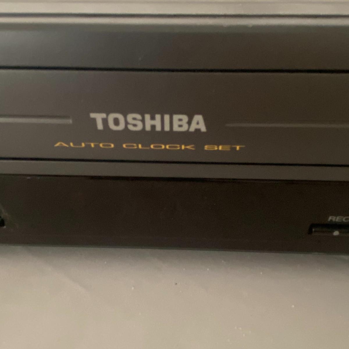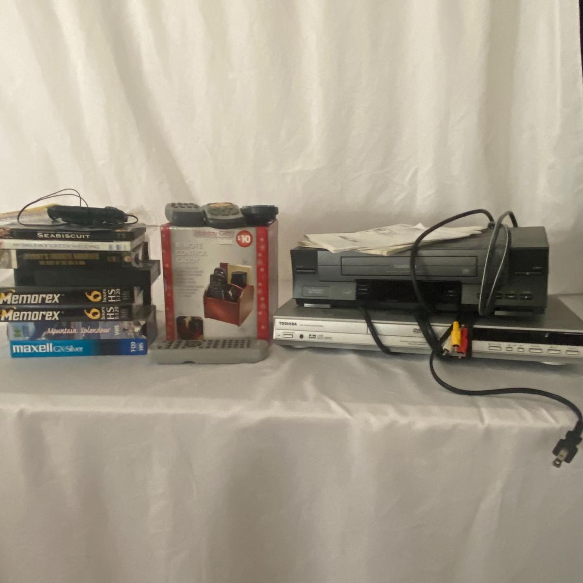 Lot includes silver Toshiba DVD player, turns on when tested. Second black Toshiba VCR player that turns on when tested. Manuals and remotes included, see photos. Blank VCRs for recording are included. DVDs are in their case and included in this lot, see photos! Packaged remote control caddy included to help organization! MagicEar hearing device included as well. Local pickup only. See photos.