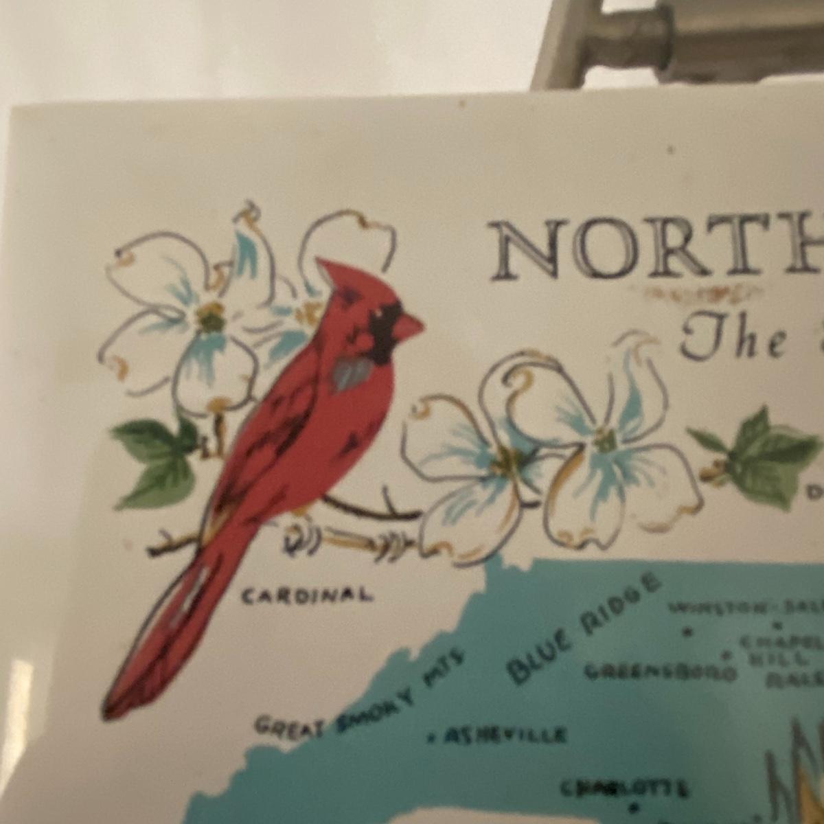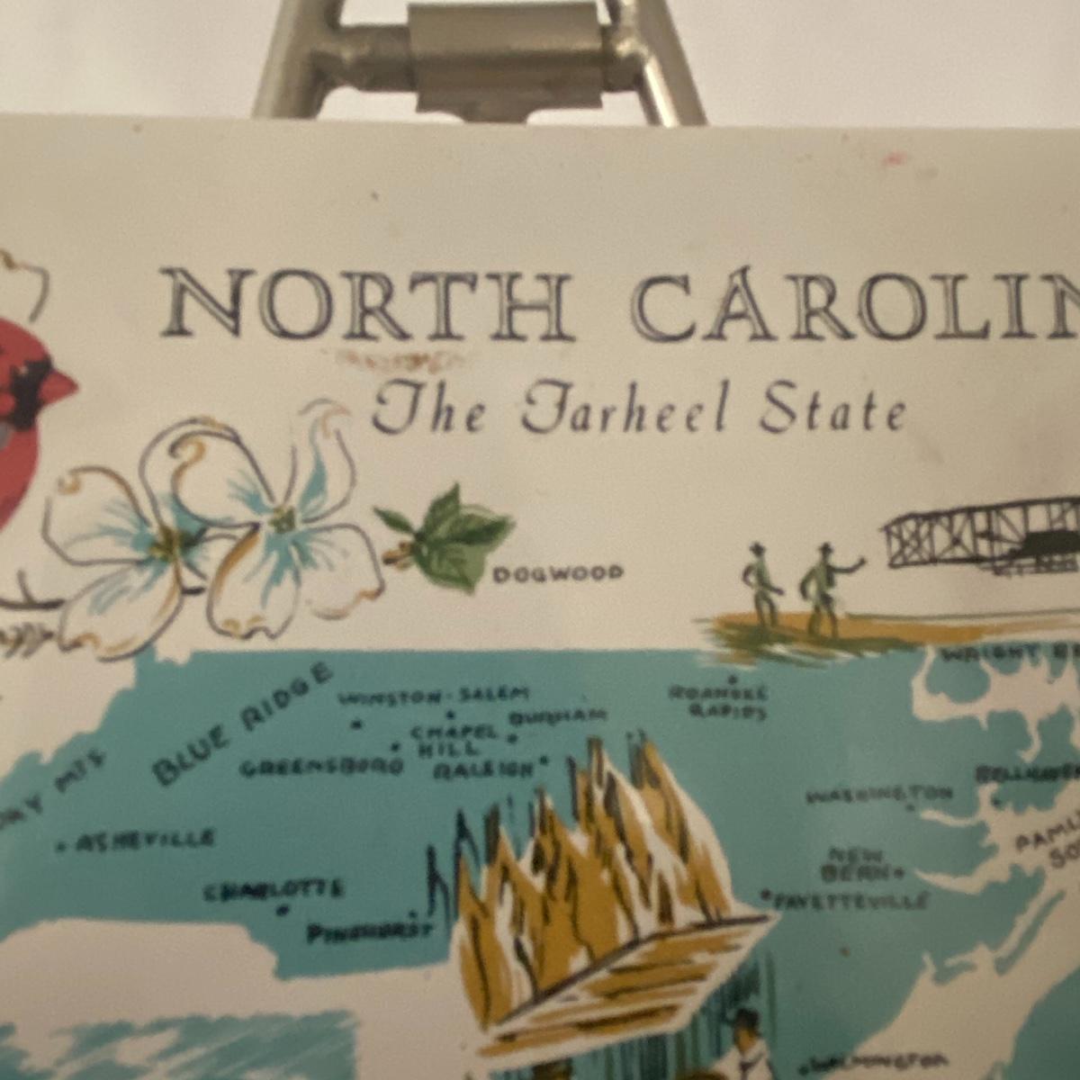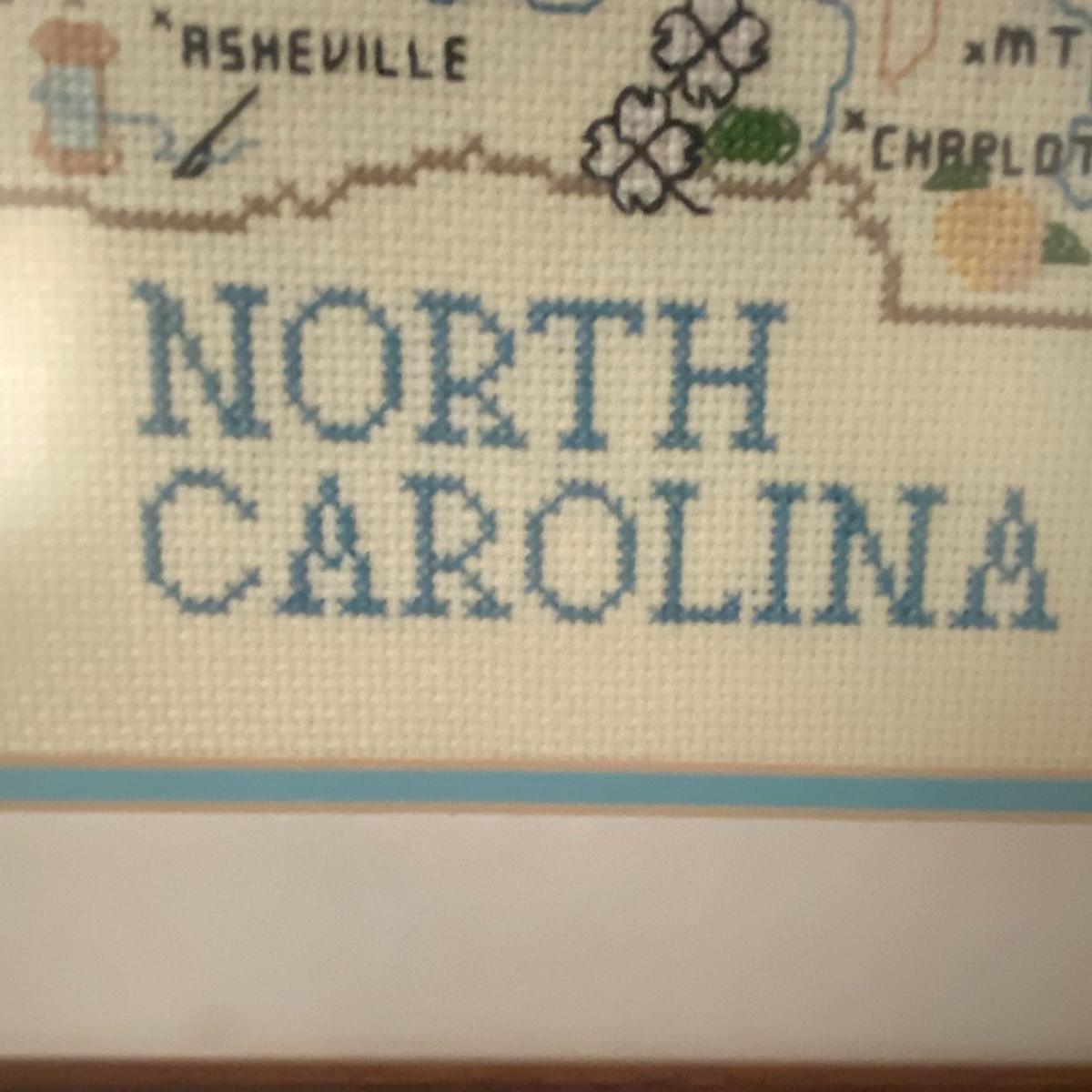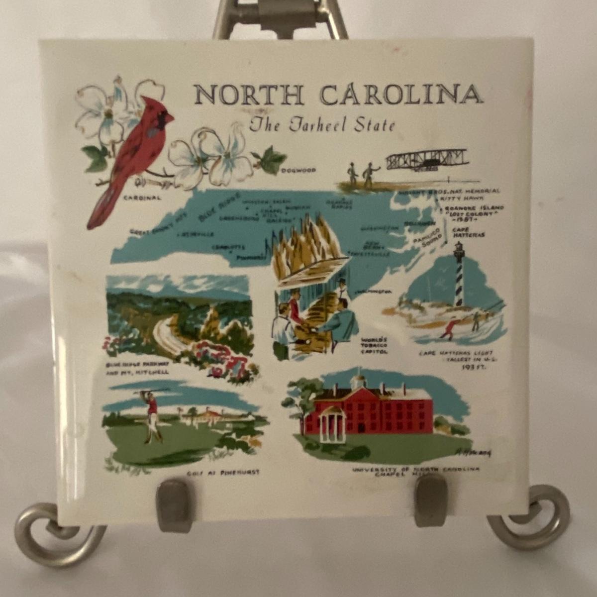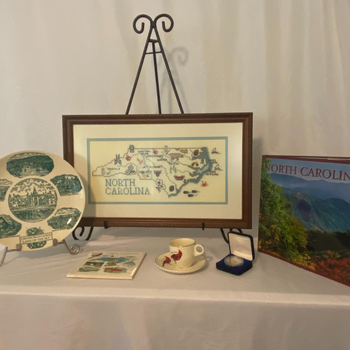 Charming North Carolina lot will bring decor and historical talking points into your home! 1789-1989 North Carolina Bicentennial medal included. The medal is made of fine silver. Enclosed in its protective case and sits in its own box. See photos Two pieces of North Carolina art included, a framed North Carolina cross stitch map with highlights from across the state. Measurements are 21.5”x12.5”. North Carolina tile included, see photos. Small cardinal North Carolina tea cup and plate included. Asheville North Carolina land of the sky landmark highlights plate with a diameter of 10”,see photos. North Carolina by Whitecap Books included in this lot as well.