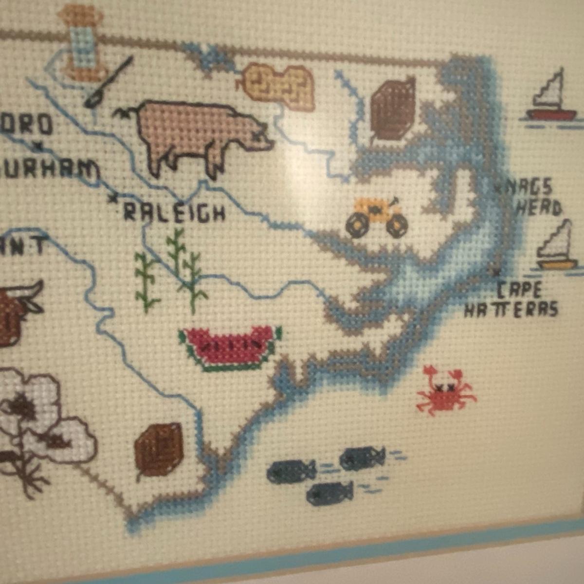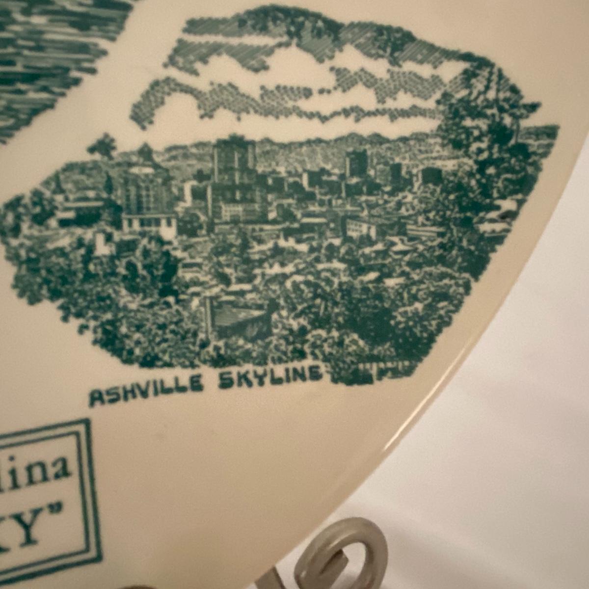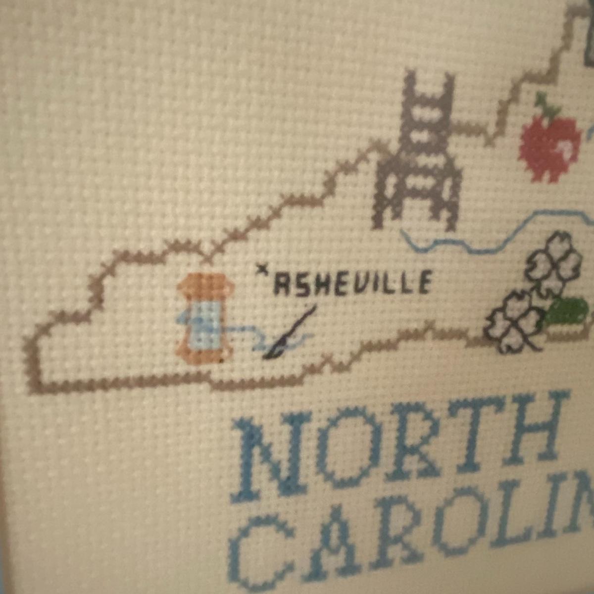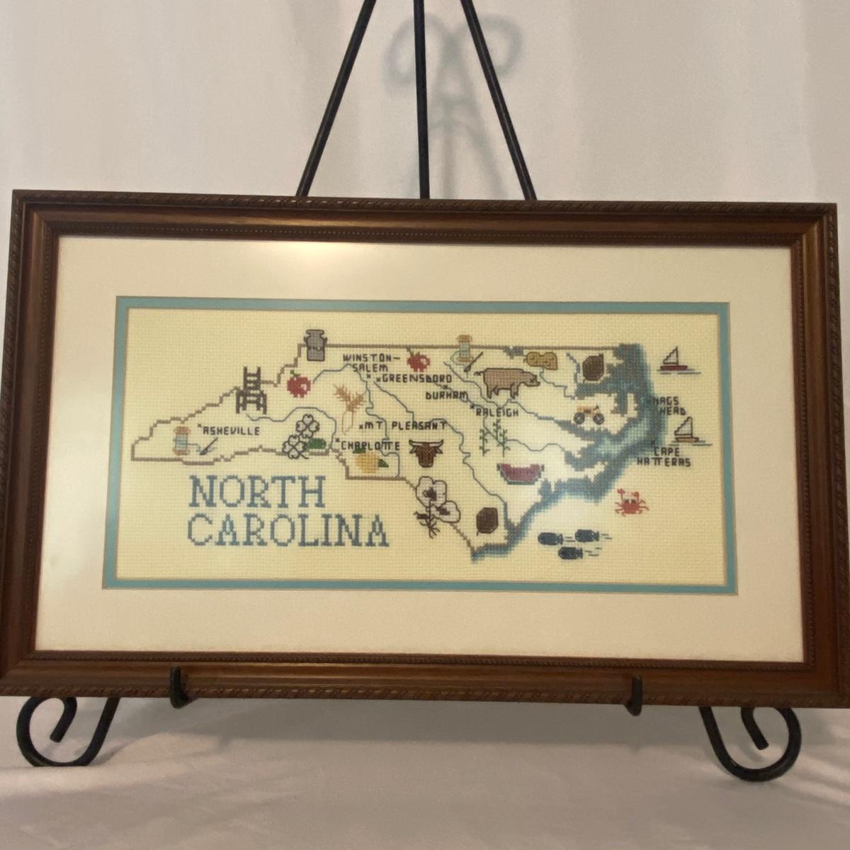 Charming North Carolina lot will bring decor and historical talking points into your home! 1789-1989 North Carolina Bicentennial medal included. The medal is made of fine silver. Enclosed in its protective case and sits in its own box. See photos Two pieces of North Carolina art included, a framed North Carolina cross stitch map with highlights from across the state. Measurements are 21.5”x12.5”. North Carolina tile included, see photos. Small cardinal North Carolina tea cup and plate included. Asheville North Carolina land of the sky landmark highlights plate with a diameter of 10”,see photos. North Carolina by Whitecap Books included in this lot as well.