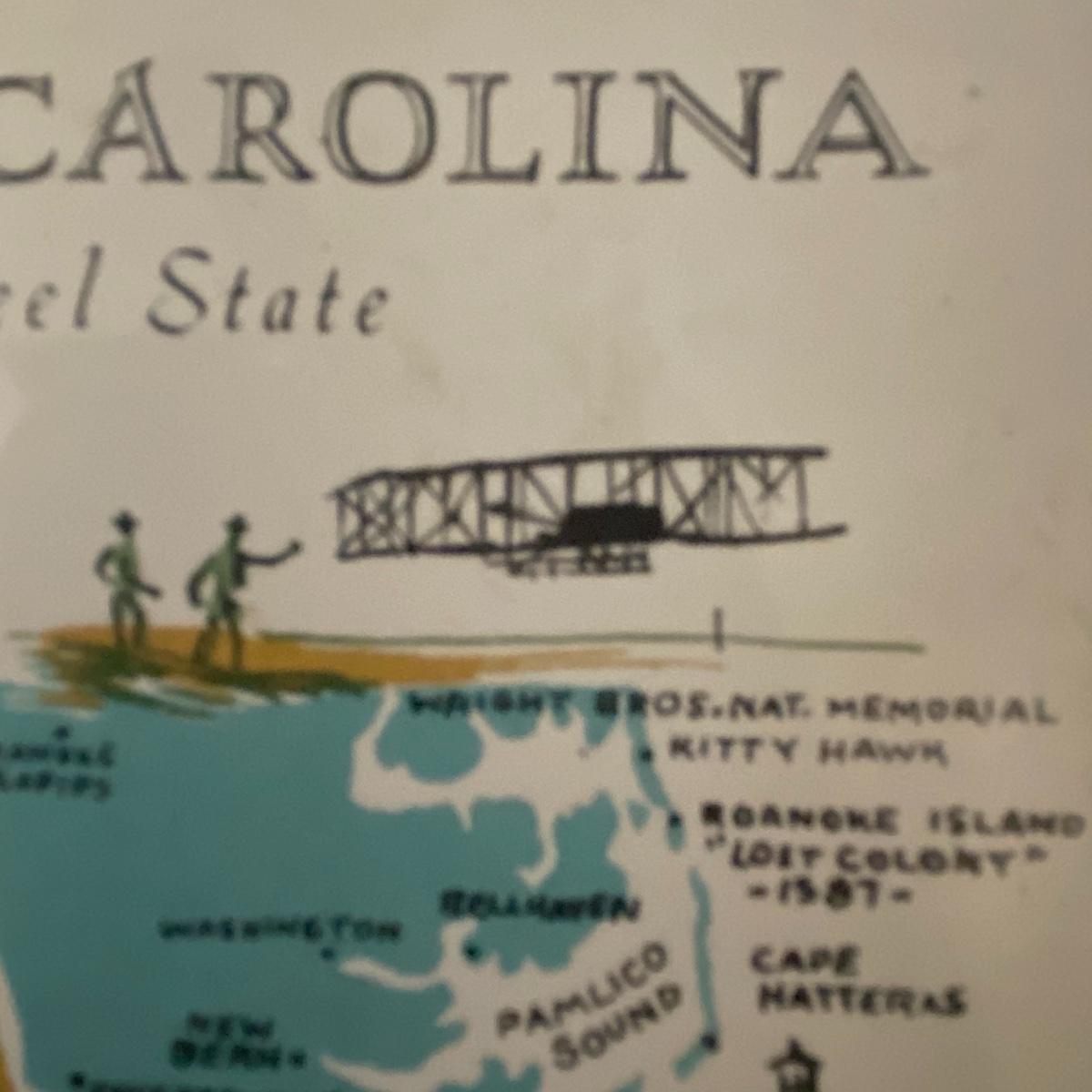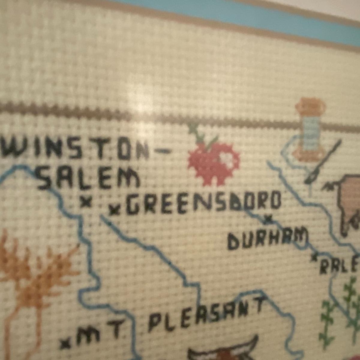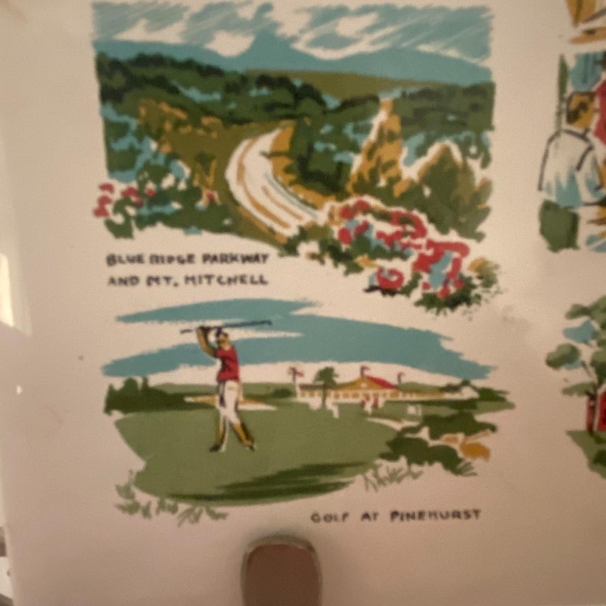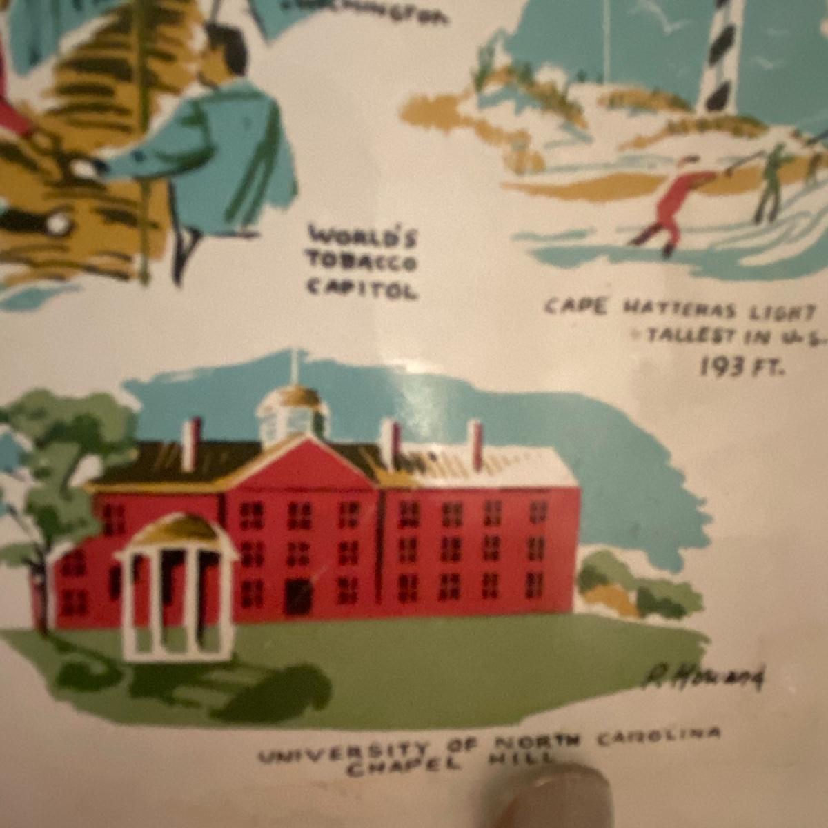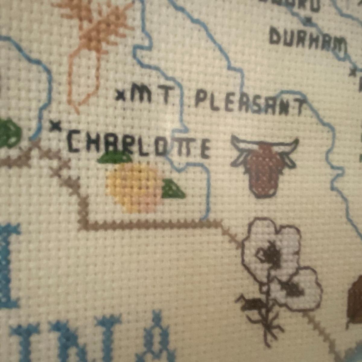 Charming North Carolina lot will bring decor and historical talking points into your home! 1789-1989 North Carolina Bicentennial medal included. The medal is made of fine silver. Enclosed in its protective case and sits in its own box. See photos Two pieces of North Carolina art included, a framed North Carolina cross stitch map with highlights from across the state. Measurements are 21.5”x12.5”. North Carolina tile included, see photos. Small cardinal North Carolina tea cup and plate included. Asheville North Carolina land of the sky landmark highlights plate with a diameter of 10”,see photos. North Carolina by Whitecap Books included in this lot as well.