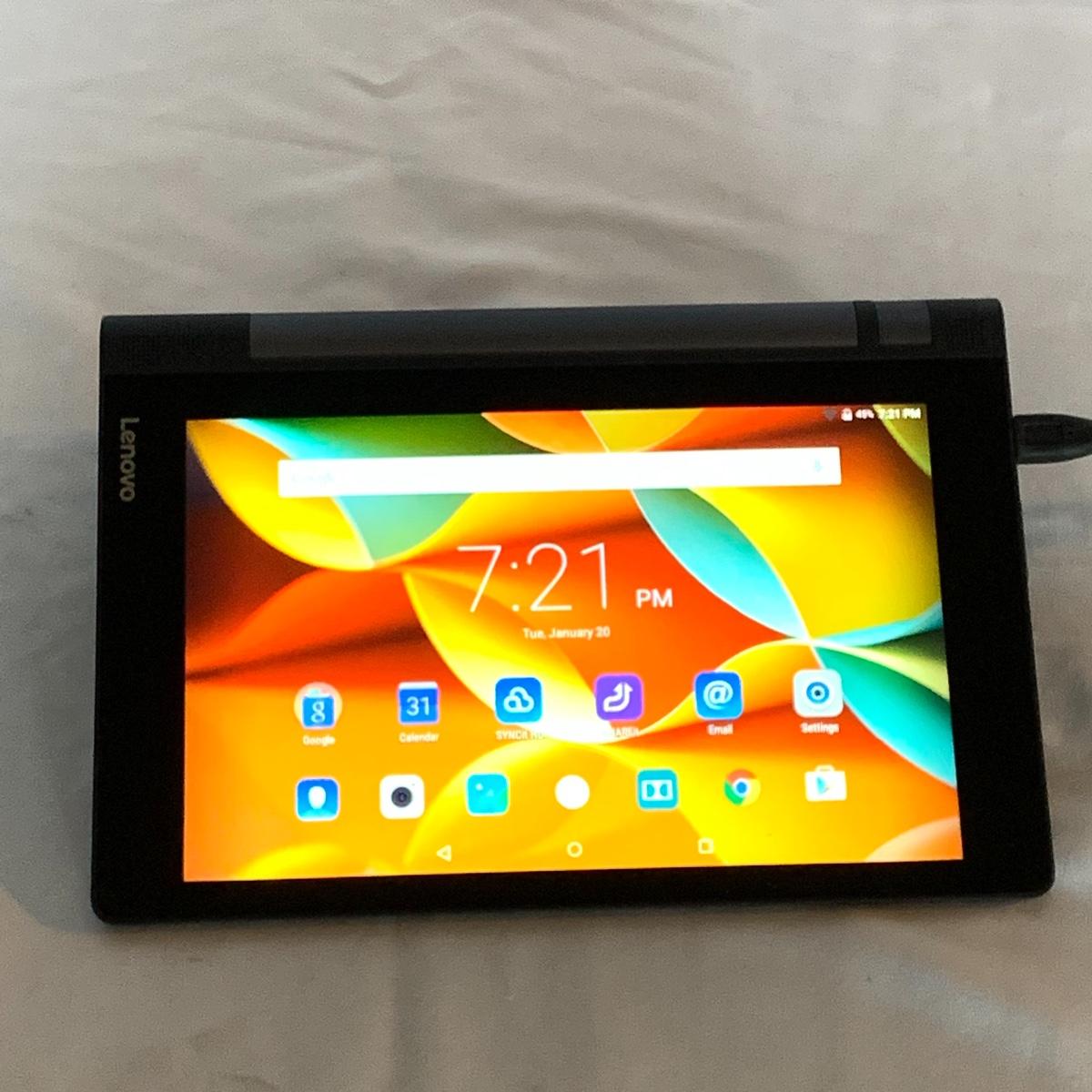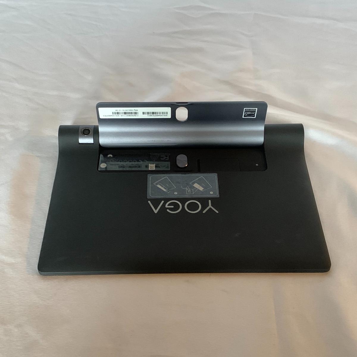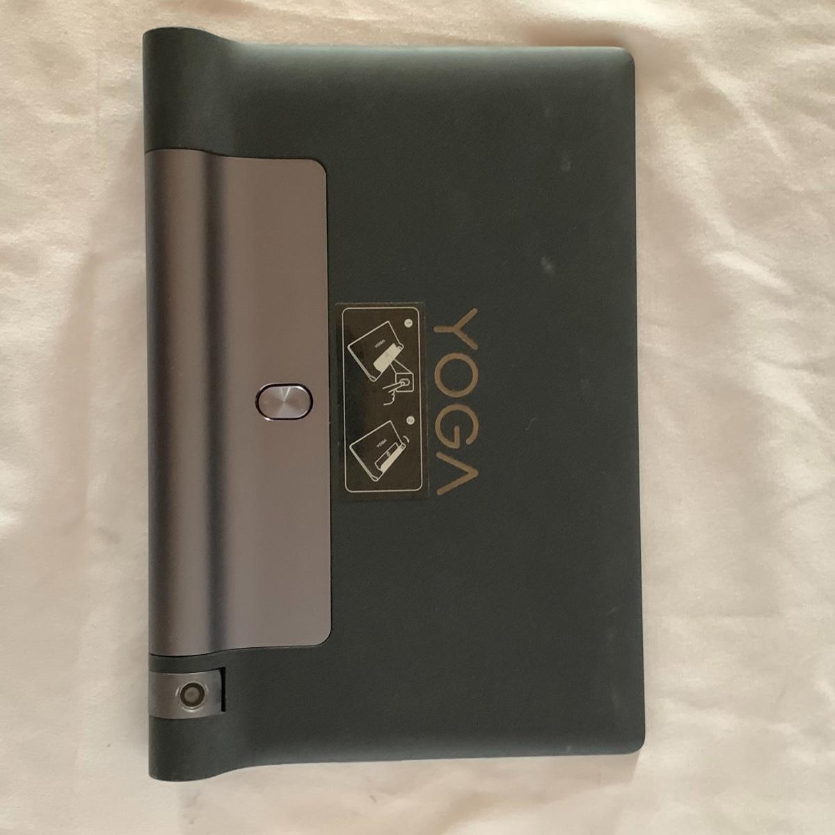 This Lenovo Yoga Portable Tablet Computer appears to be in excellent condition. It has just a few tiny scratches on the screen, but otherwise looks like new. Its model is: Lenovo YT3-850F. It turns on an everything appears to function perfectly. It has a camera and a retractable stand. There is a port for a headphone set to be plugged in. There is not a power cord included and will require a Micro USB cable to charge it, which can easily be found online or you probably already have one at home for another device. The tablet measures 8.25” x 6”. Shipping available.