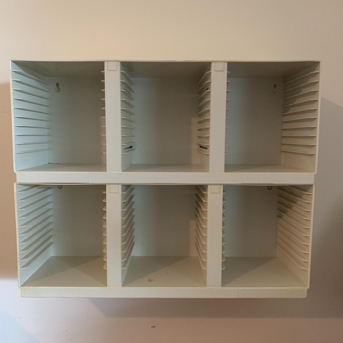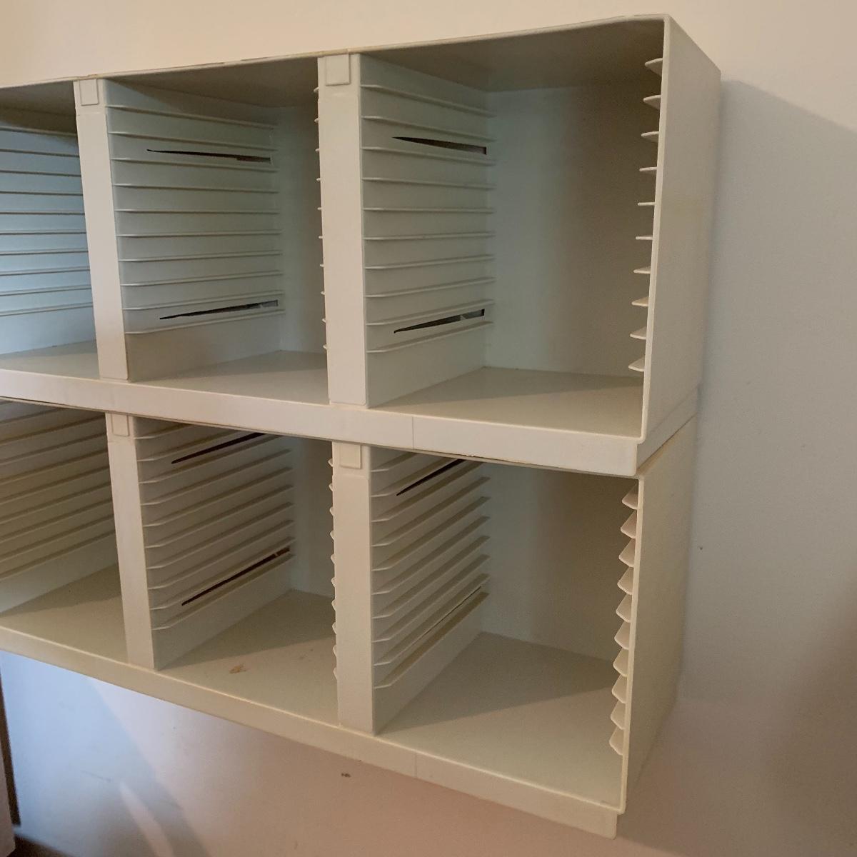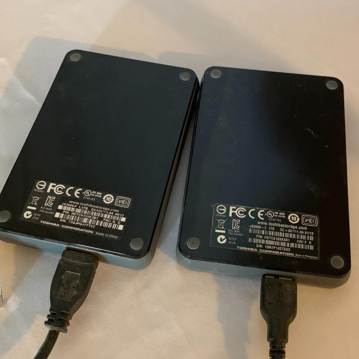This lot includes storage items, both digital external hard drives and physical storage of CD/DVD jewel cases. There are five external hard drives. All come with cords and power on when plugged in. There are two small Toshiba external hard drives. Model v63600-C has storage capacity of 1 TB and the model v63600-F has 1.5 TB. These both come with only a USB cord. There is a WD external hard drive that is model WD6000H1U-00. It has a power cord and USB cord. Storage capacity is not specified. The next external hard drive is a Seagate 9BD862-560. It comes with a power cord and USB cord and also does not have storage capacity specified. The final external hard drive included is a LaCie N2870. It has a power cord and USB cord and the storage capacity is not specified. The two jewel case storage units easily mount on the wall. They each hold about 30 jewel cases and they each measure 17.5” x 5.5” x 7”. Shipping available.