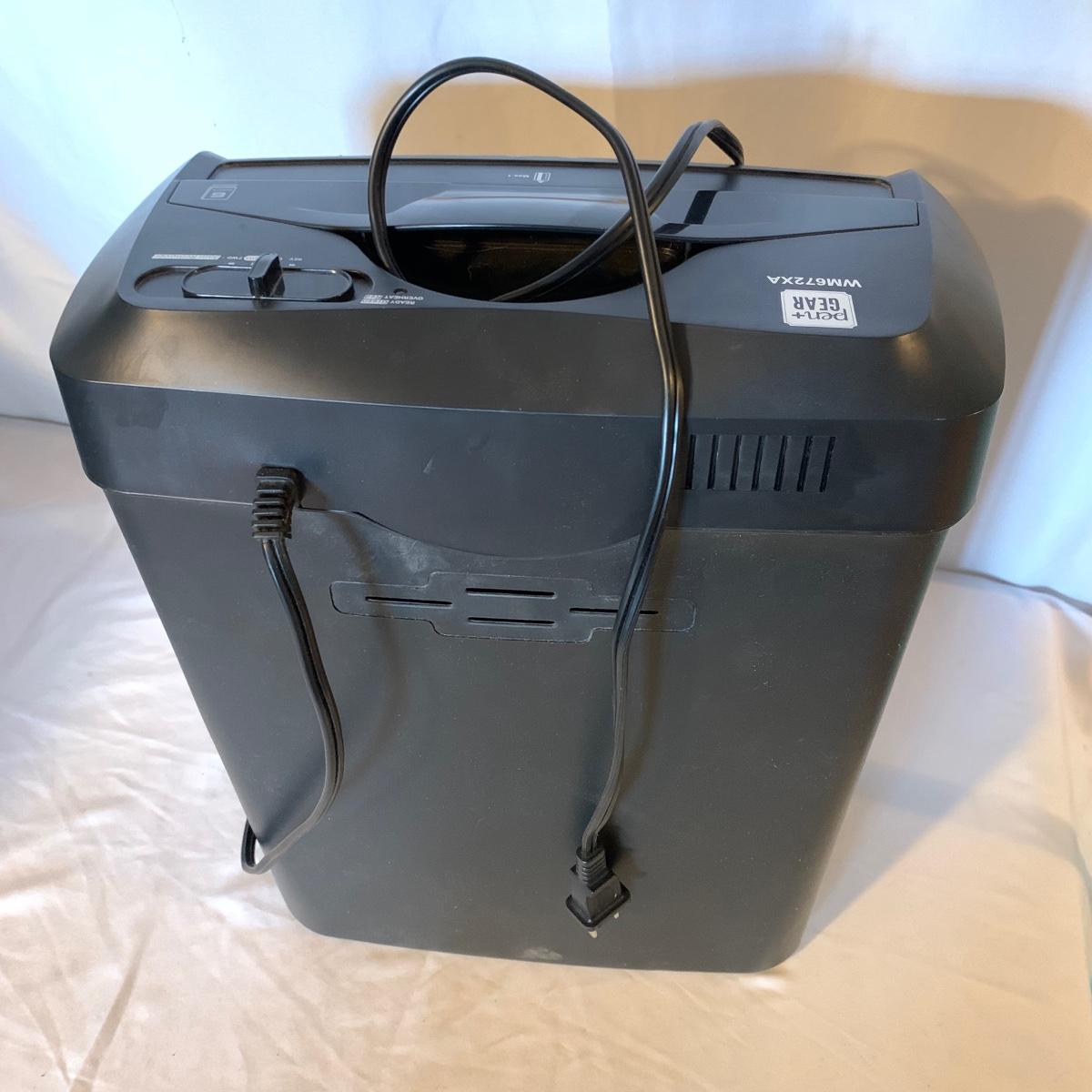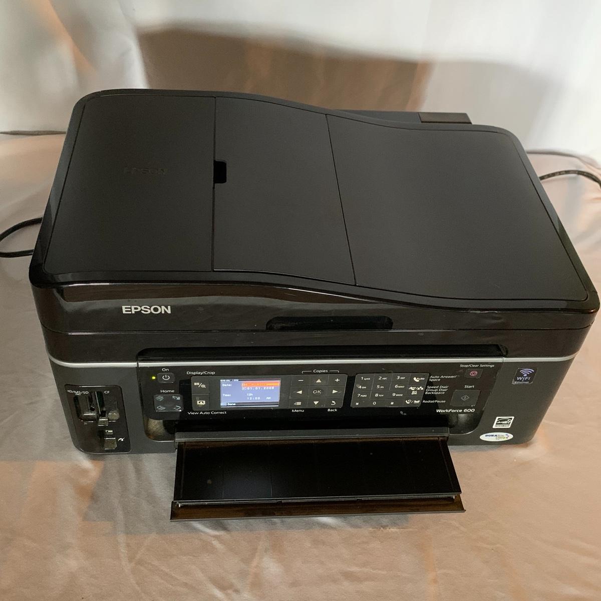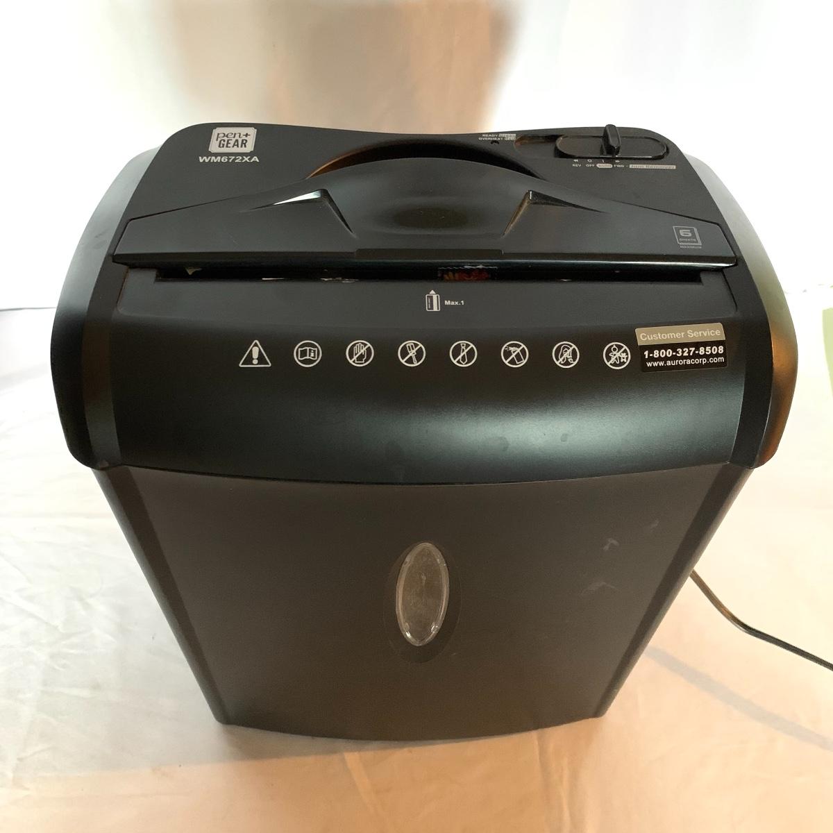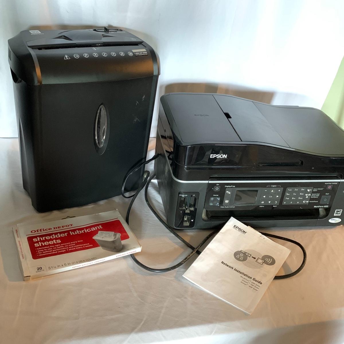 Set up your office with these office electronic necessities. There is an Epson WorkForce 600 All-In-One printer. It has wireless printing, scanning, copying, and faxing functions. When plugged in the screen turned on and it appears to function. It has collected a little bit of dust, but otherwise appears to be in excellent condition. The printer comes with a network installation guide. There is also a Pen & Gear WM672XA paper and credit card shredder. It is capable of shredding up to 6 sheets of paper at a time. When plugged in, it powered on and made a sound, so seems to function. There is also a box of shredder lubricant sheets included to help with maintenance of the shredder. Local pickup only.