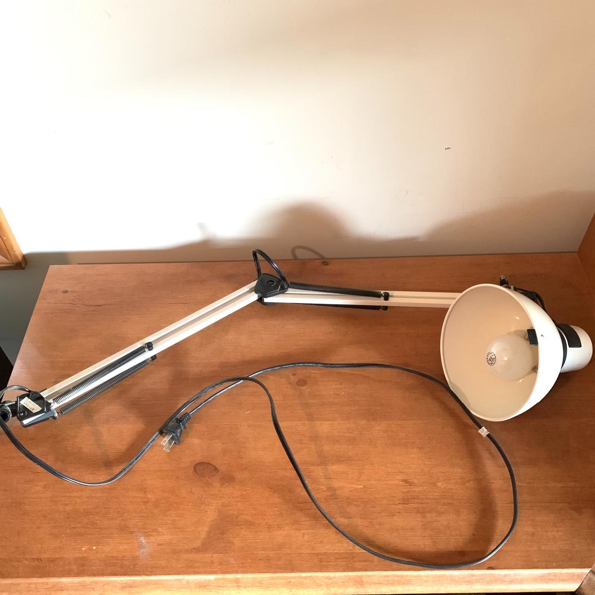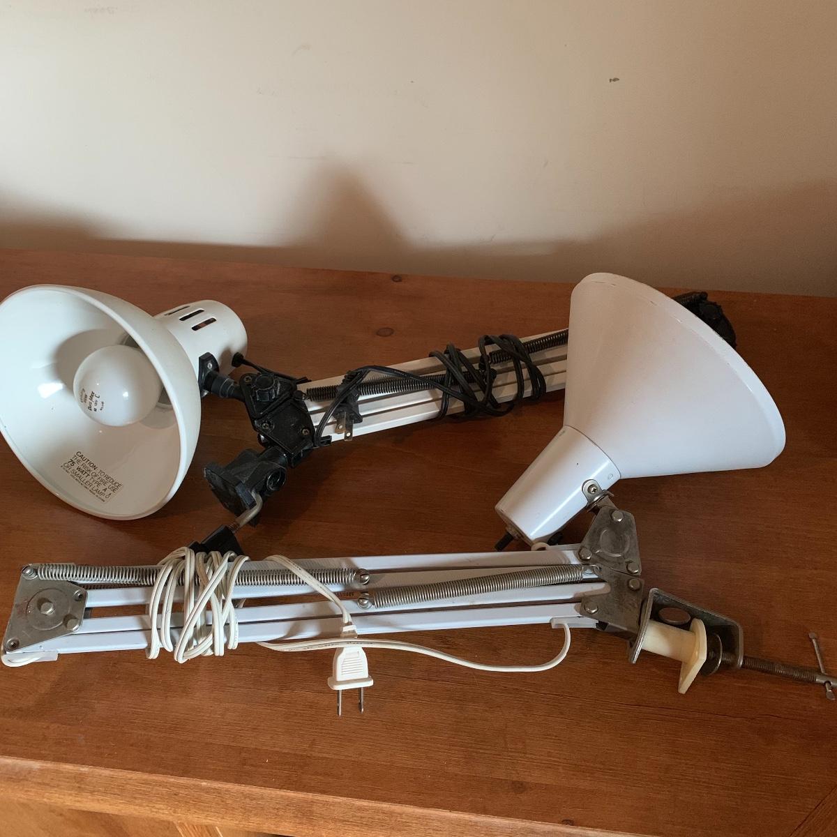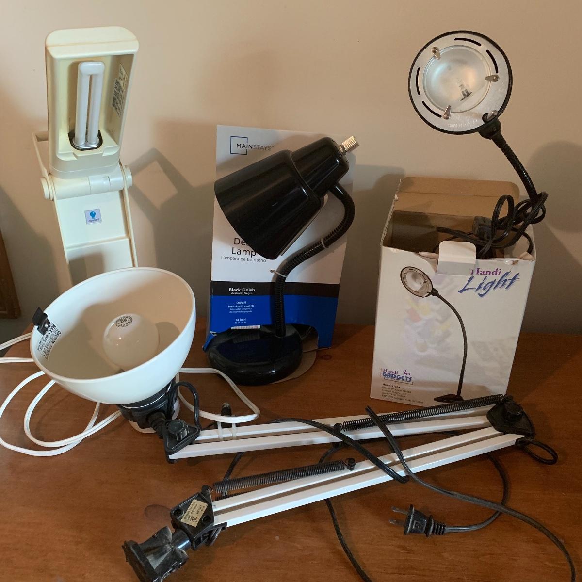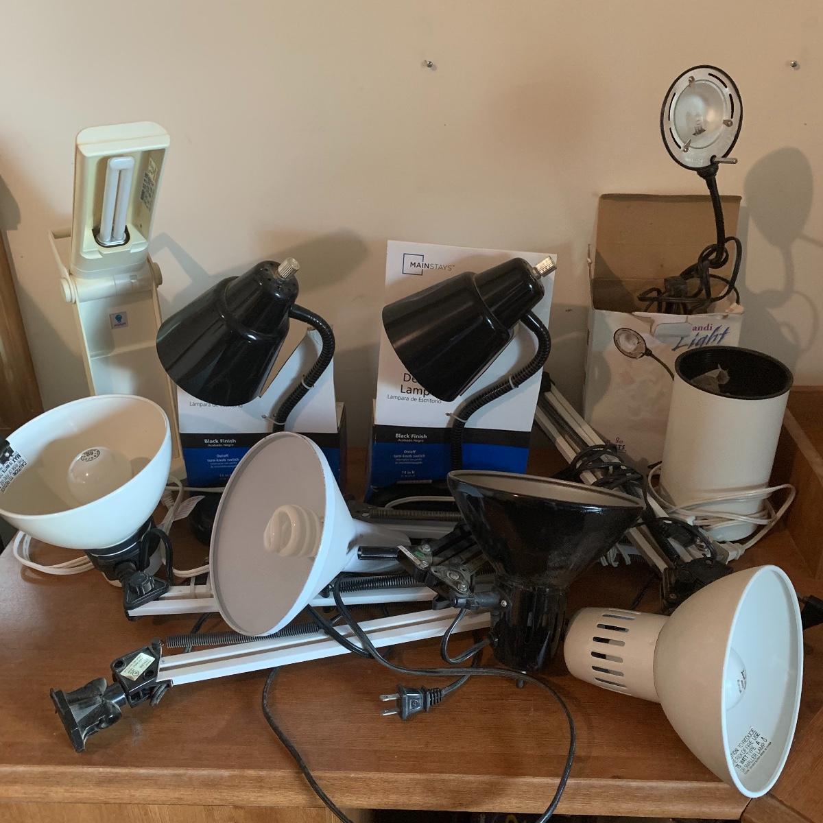 In this lot you’ll find a variety of 9 different desk lamps. One is a Daylight lamp that opens to turn on and closes to turn off. It has a handle and is about 13” tall when closed. It has a long lightbulb in it that is still burning brightly! There are two Mainstays brand 14” black desk lamps that are still new in their original packaging. There is a 17.5” Handi Gadgets Handi Light with a halogen bulb that is a clip on lamp. It currently functions well when plugged in, with a nice bright light. There are four long hinged lamps. Three are white and clamp/screw on to a base. One is missing the clamp/screw part and needs a replacement. There is also a hinged black lamp. When all the way open it is about 35”. It functioned when plugged in. It’s mount is not attached, but included. The final lamp is a 7.5” white cylindrical lamp that functions. Local pickup only.