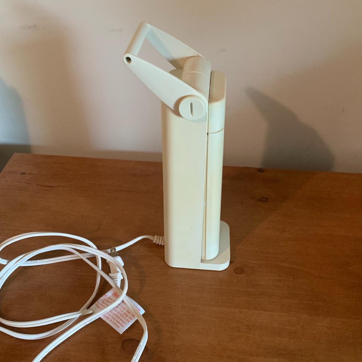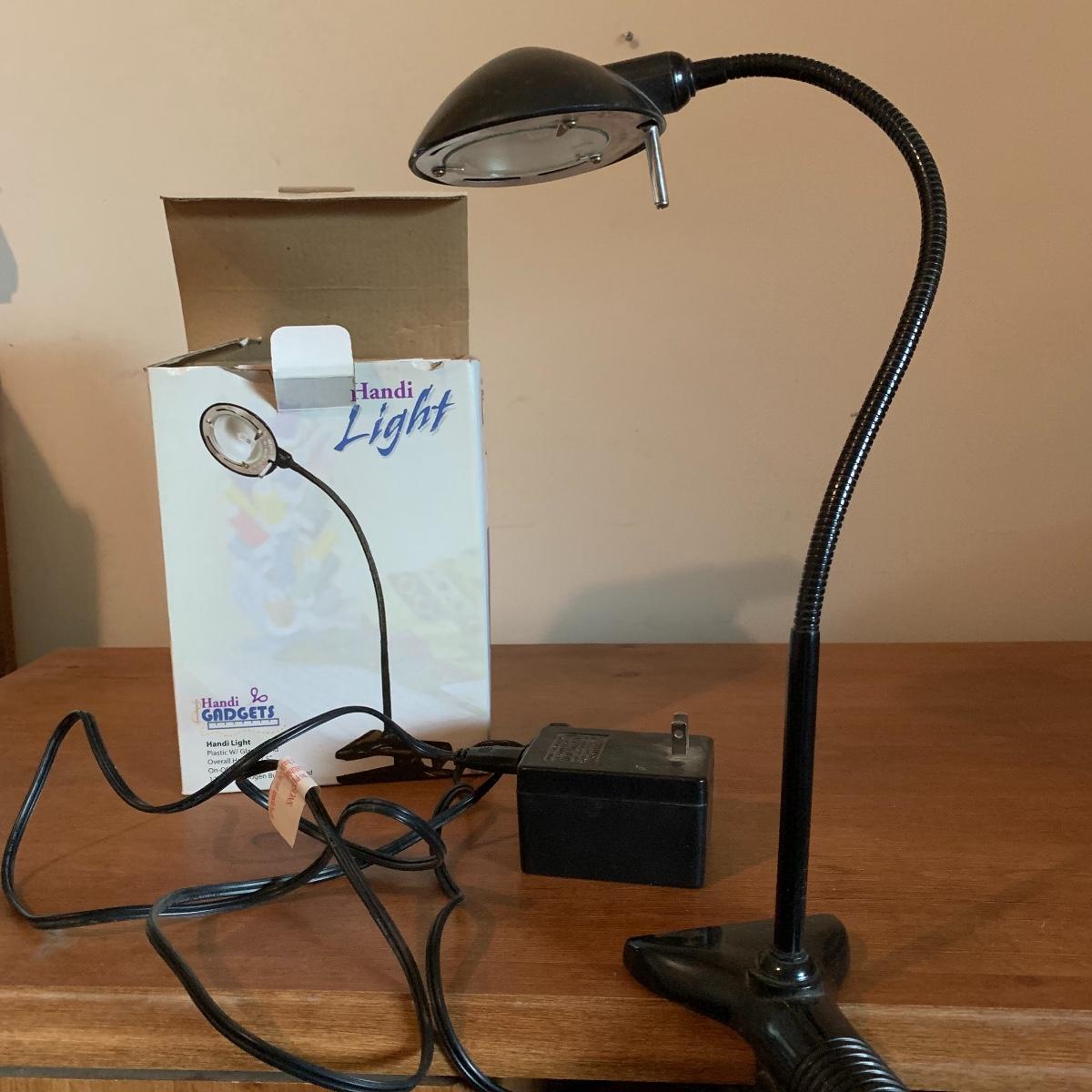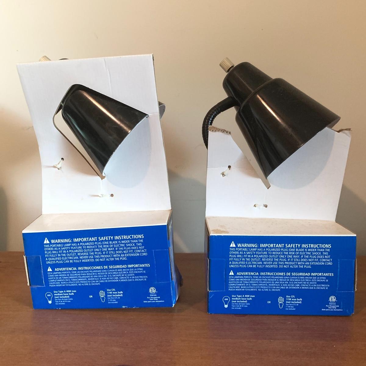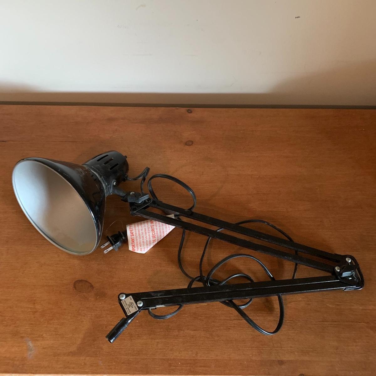 In this lot you’ll find a variety of 9 different desk lamps. One is a Daylight lamp that opens to turn on and closes to turn off. It has a handle and is about 13” tall when closed. It has a long lightbulb in it that is still burning brightly! There are two Mainstays brand 14” black desk lamps that are still new in their original packaging. There is a 17.5” Handi Gadgets Handi Light with a halogen bulb that is a clip on lamp. It currently functions well when plugged in, with a nice bright light. There are four long hinged lamps. Three are white and clamp/screw on to a base. One is missing the clamp/screw part and needs a replacement. There is also a hinged black lamp. When all the way open it is about 35”. It functioned when plugged in. It’s mount is not attached, but included. The final lamp is a 7.5” white cylindrical lamp that functions. Local pickup only.
