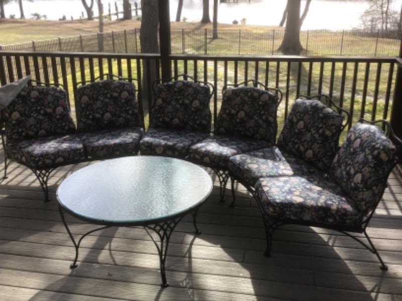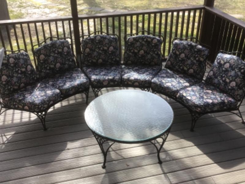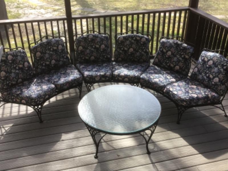 L - 653   3pc. Curved Sectional Wrought Iron Sofa with Cushions / Coffee Table