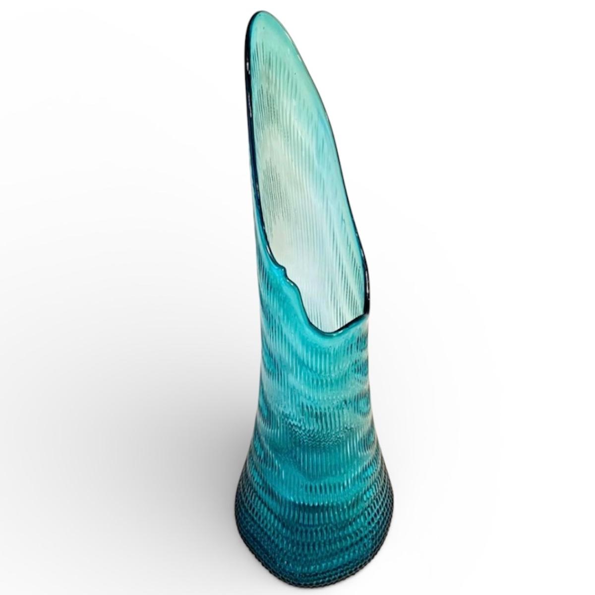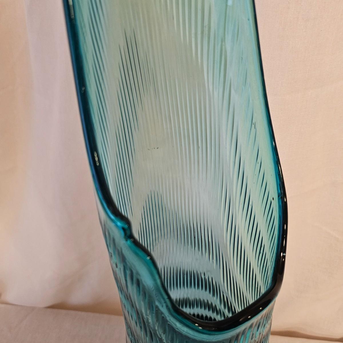 This item appears to be a blue/teal glass vase in the 'nubby butt swung glass' style often attributed to L.E. Smith. Glass has unique open top style which tapers down to a nubby surface at the bottom. Vase measures 8" x 9" x 26.5"H. See photos for details. Shipping available.