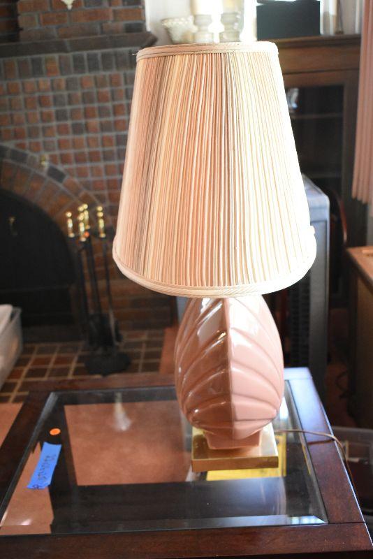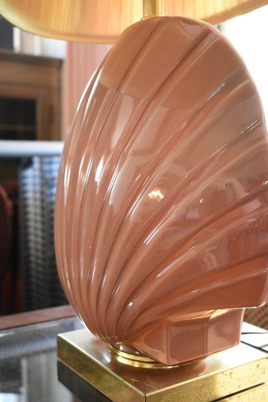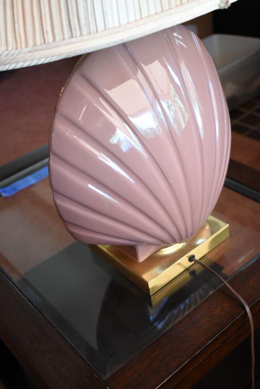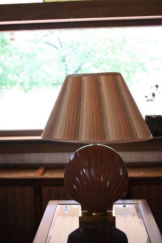 Ceramic seashell lamp with striped shade. The back of lamp is faded from the sun. Working.