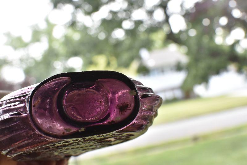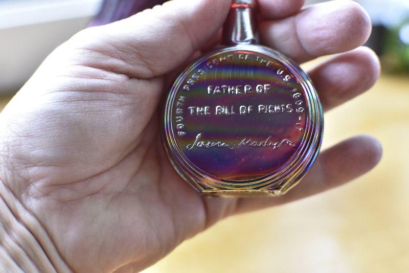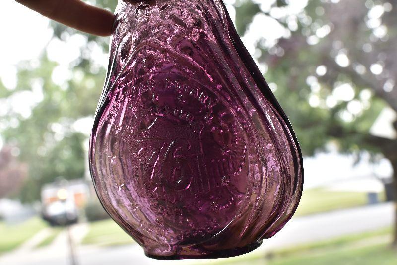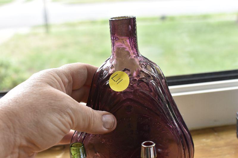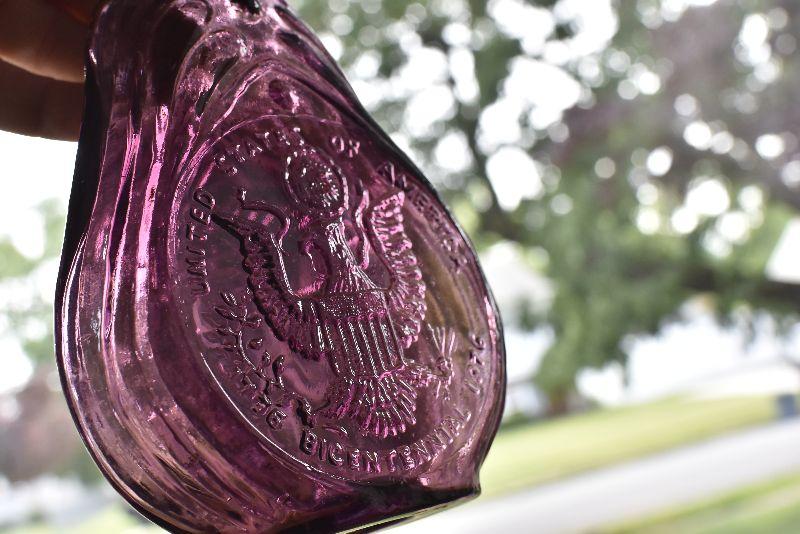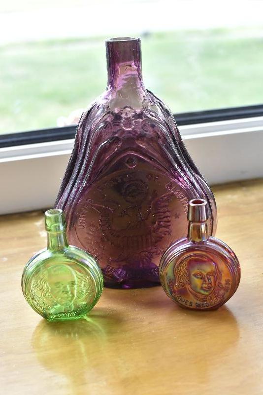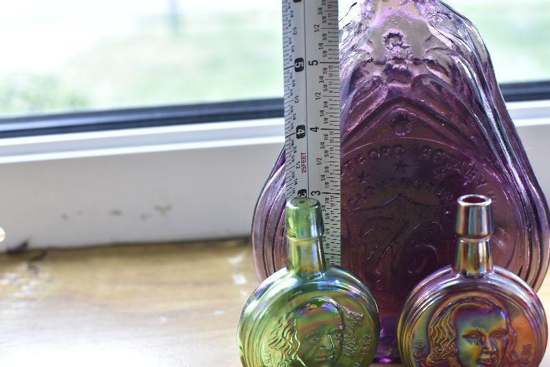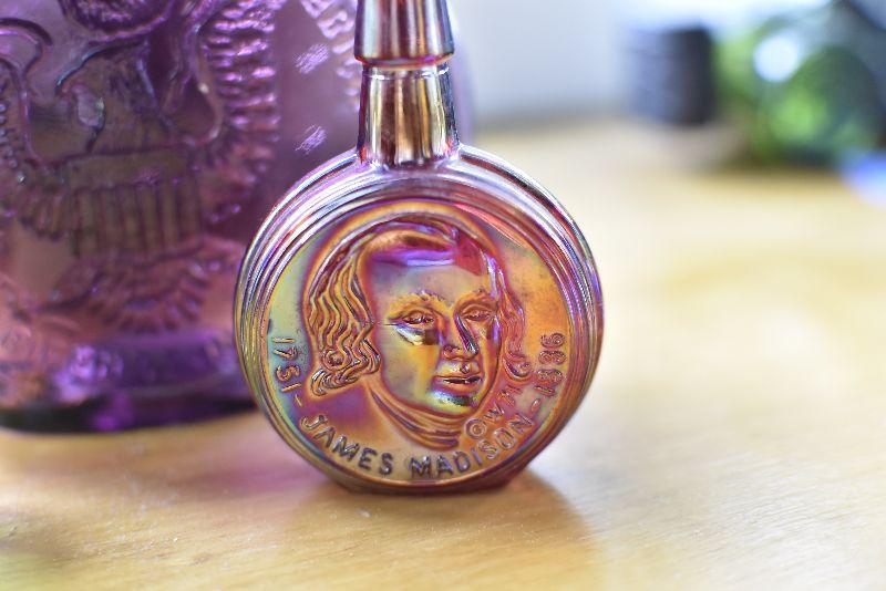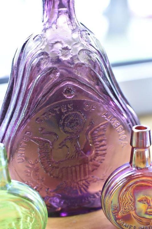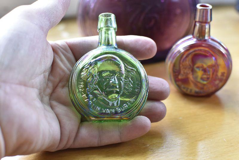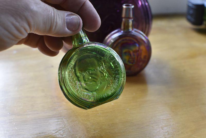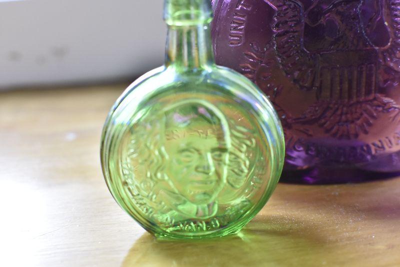 Colored glass bottles with presidents' likeness, and a purple bottle with the American Eagle. No chips.