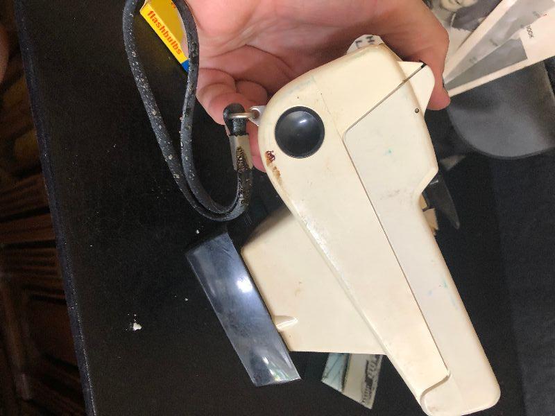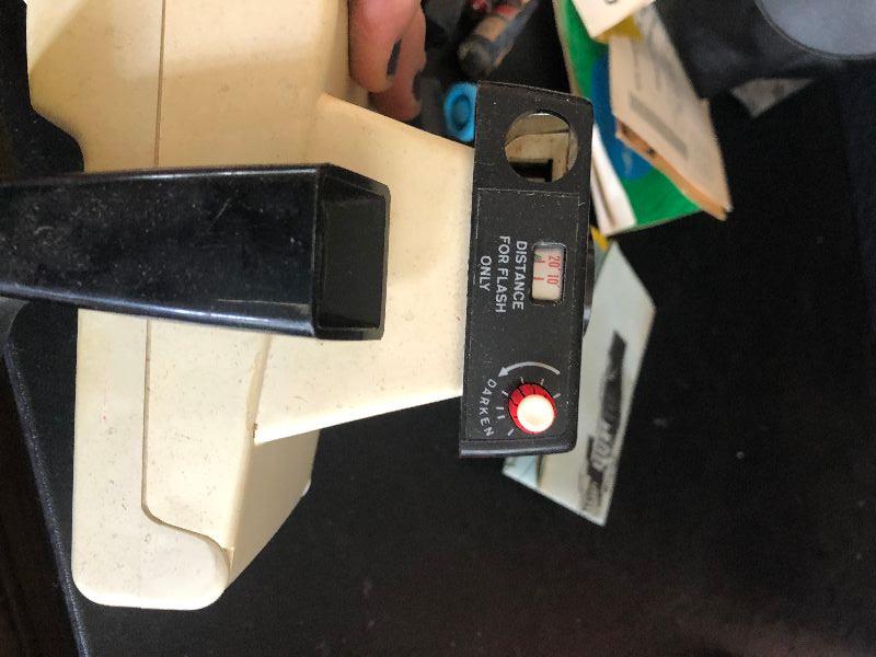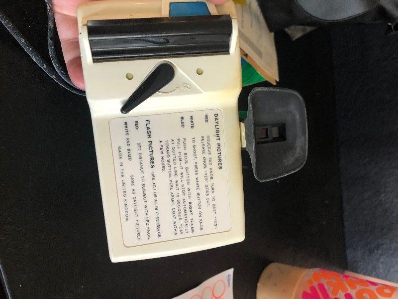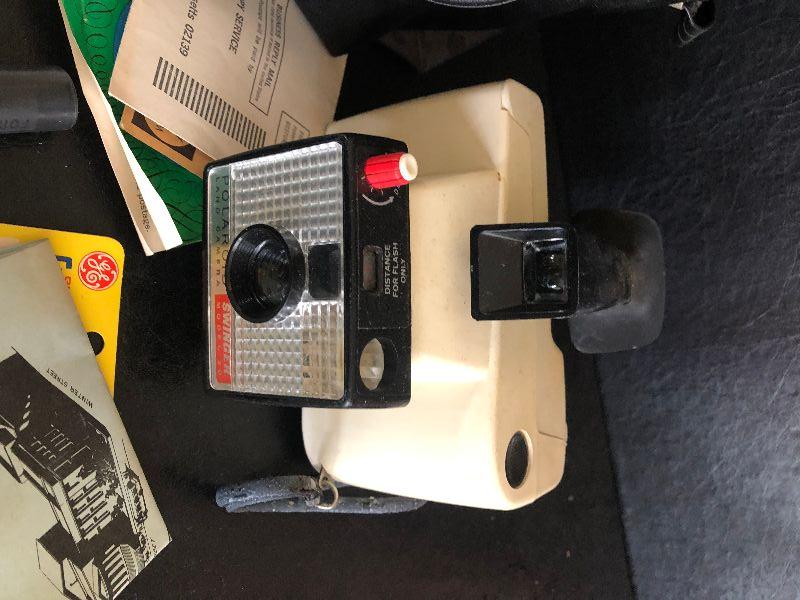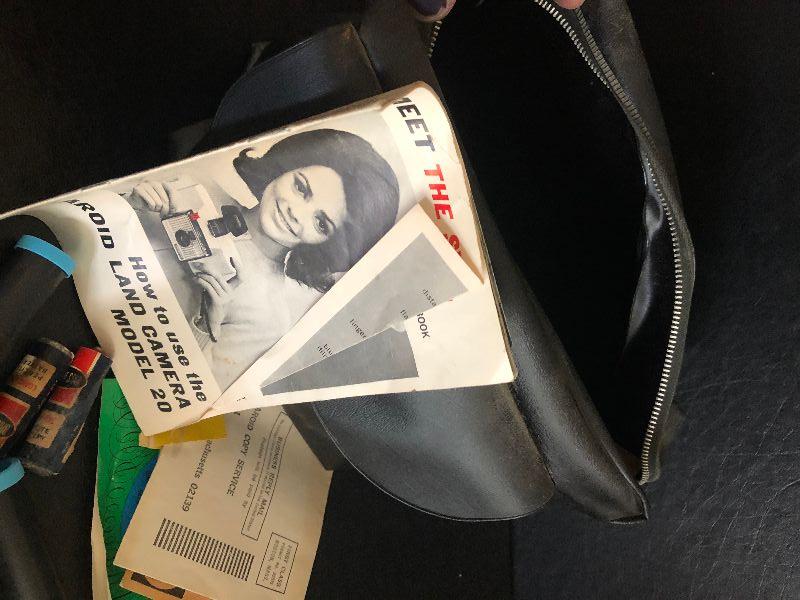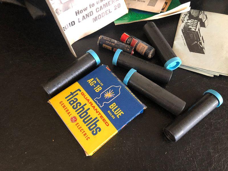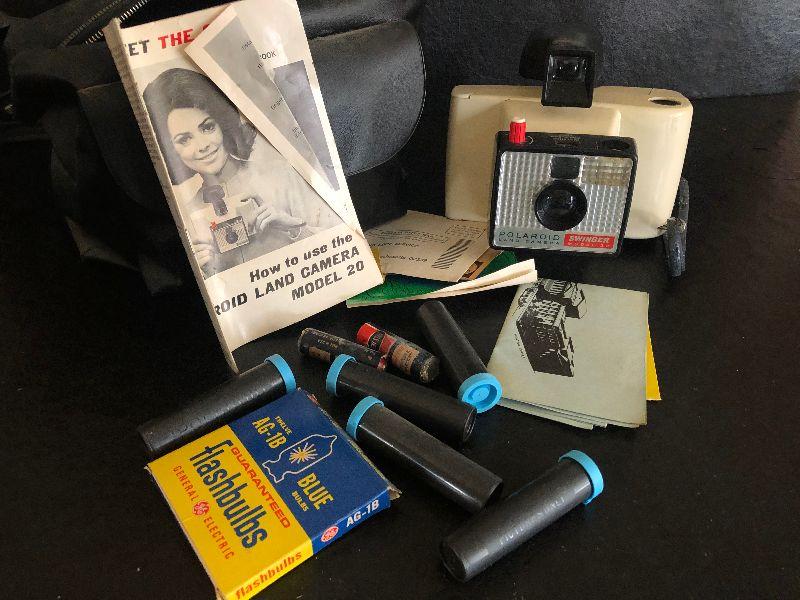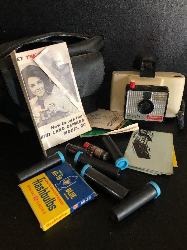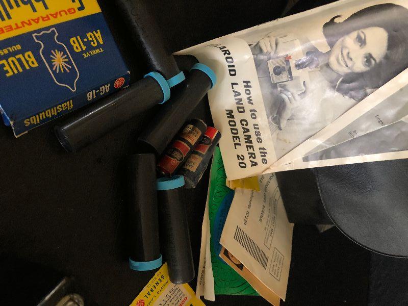 Camera comes with case, that is damaged, manual, flashbulbs, and plastic tubes. Untested. Bring box to move.