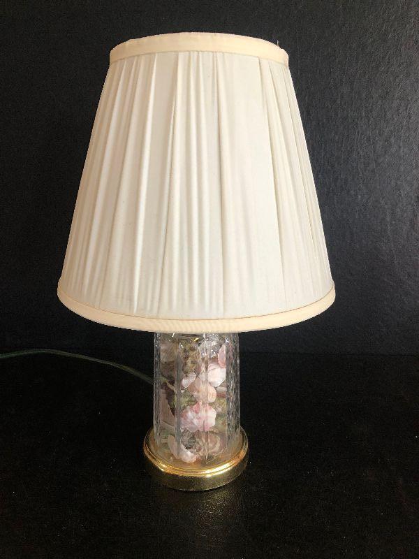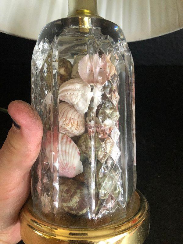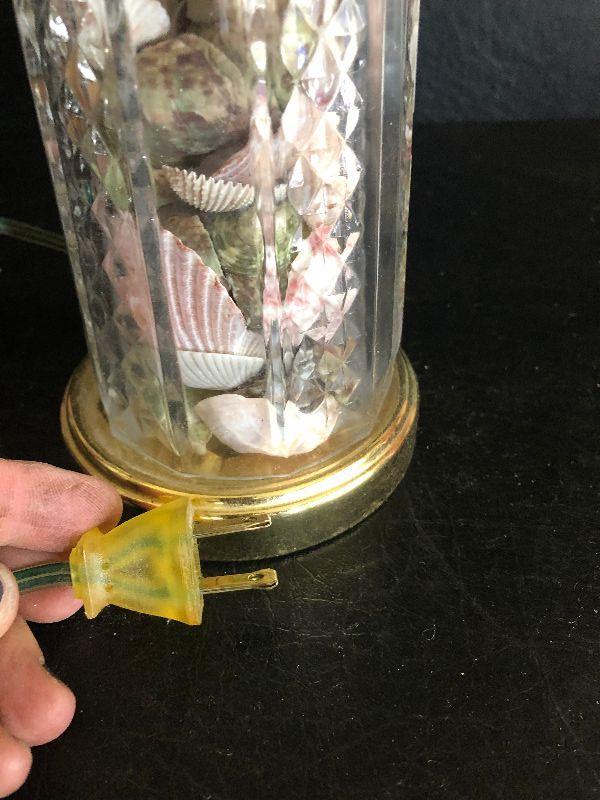 Glass lamp filled with sea shells, and a silk like shade. Untested.