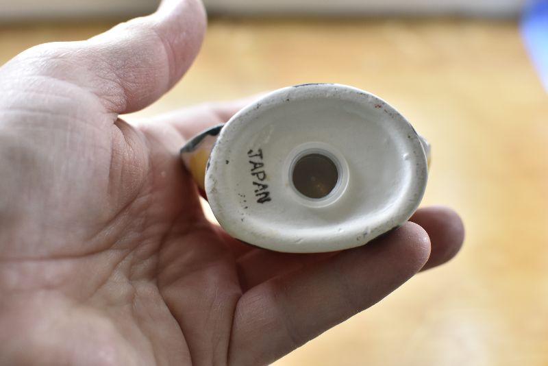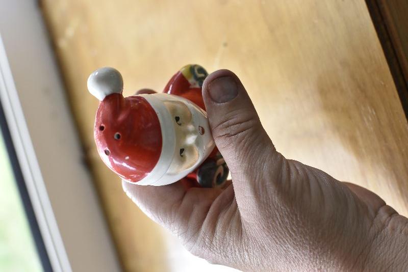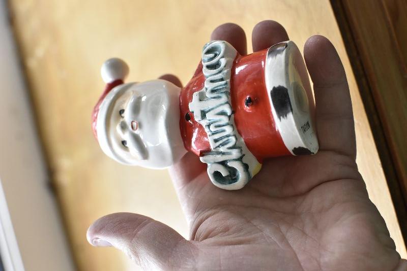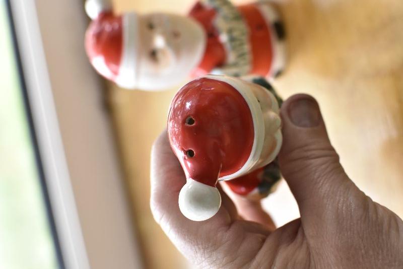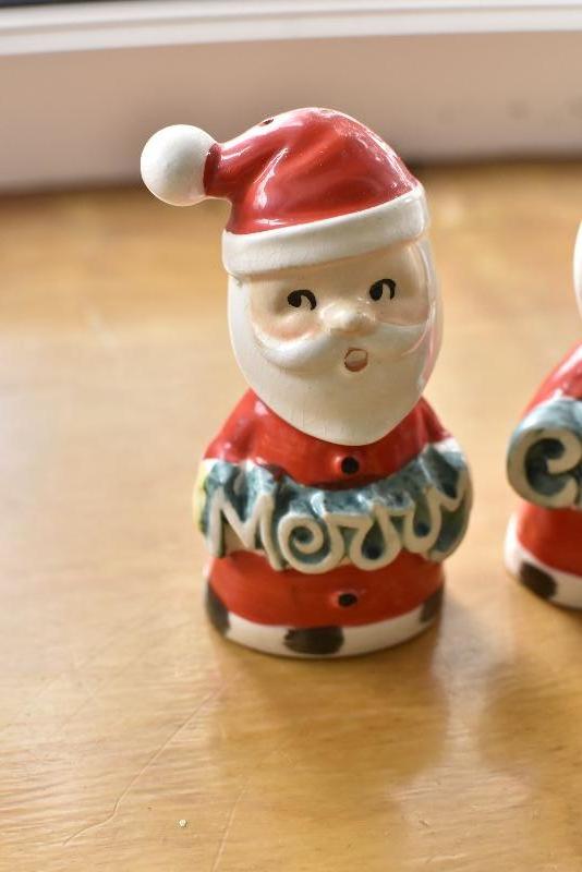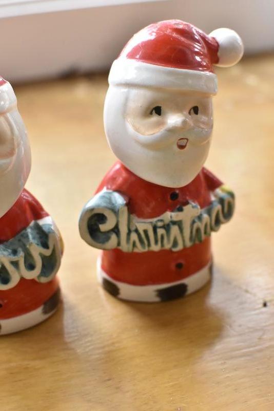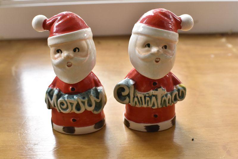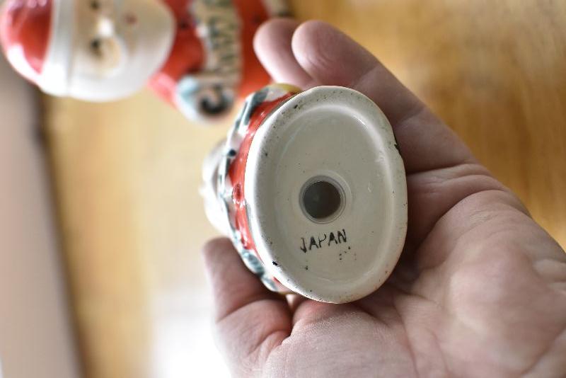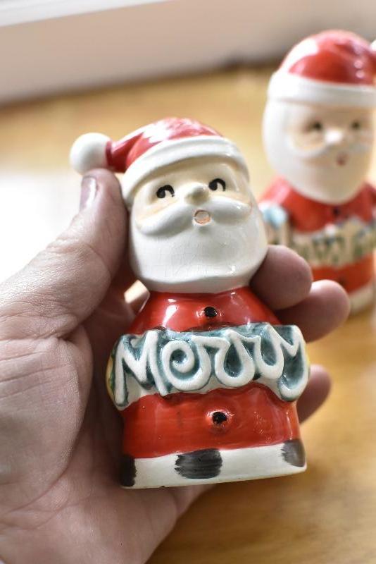 Two Santas, made in Japan, holding Merry Christmas. No chips.