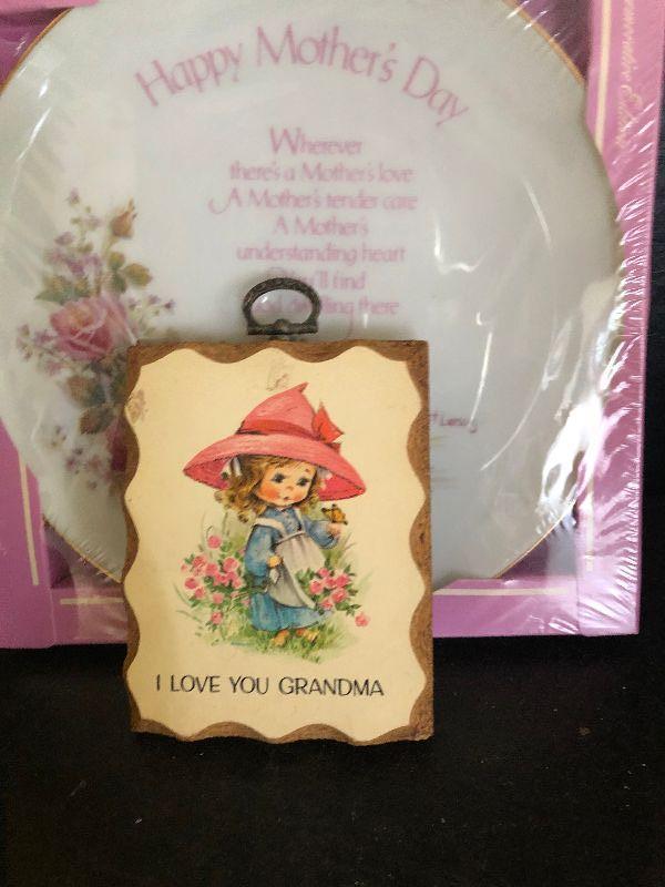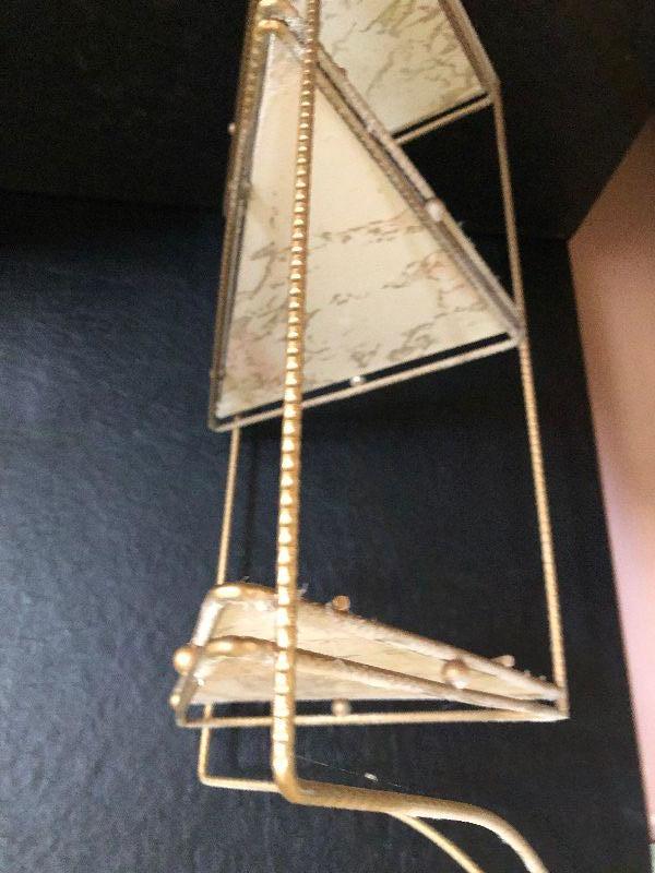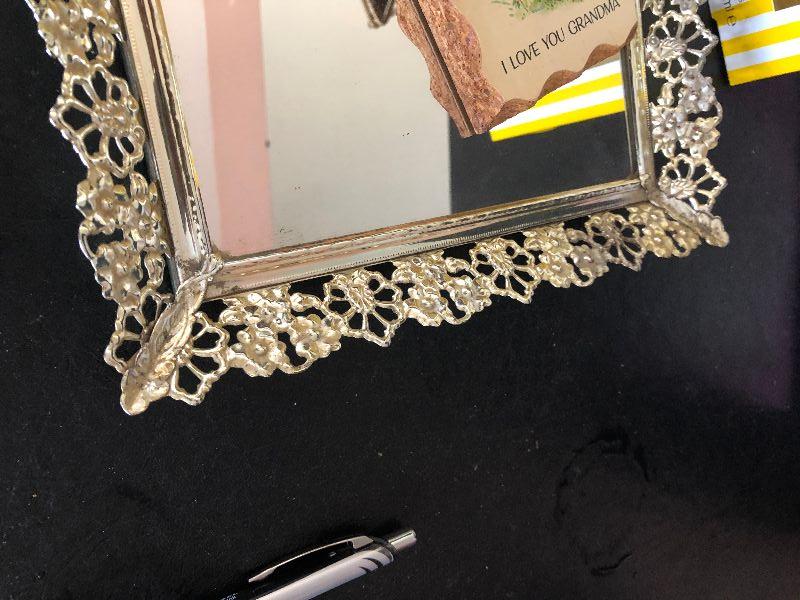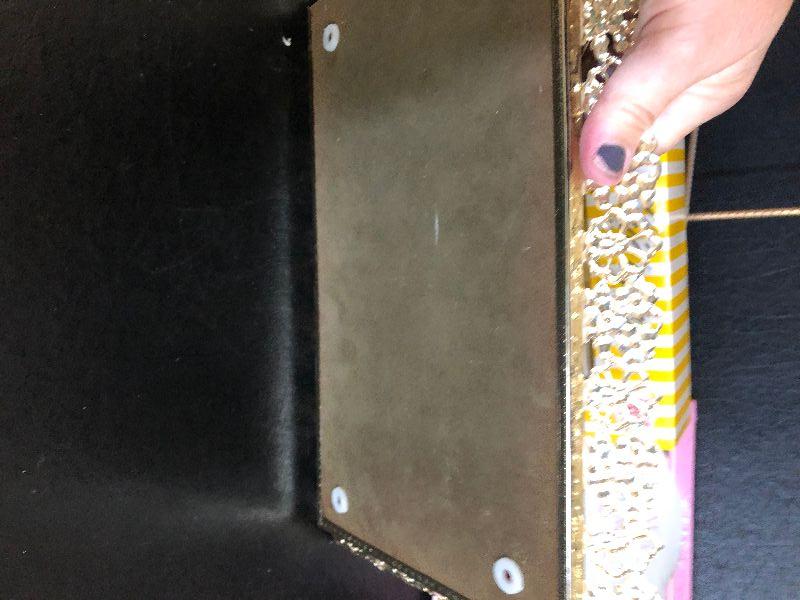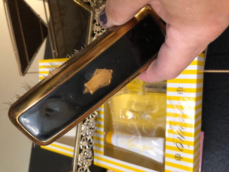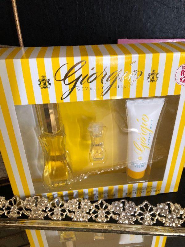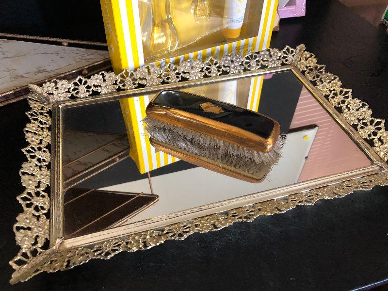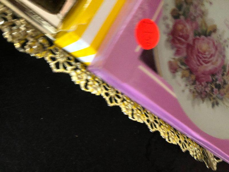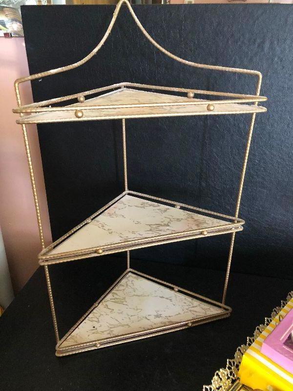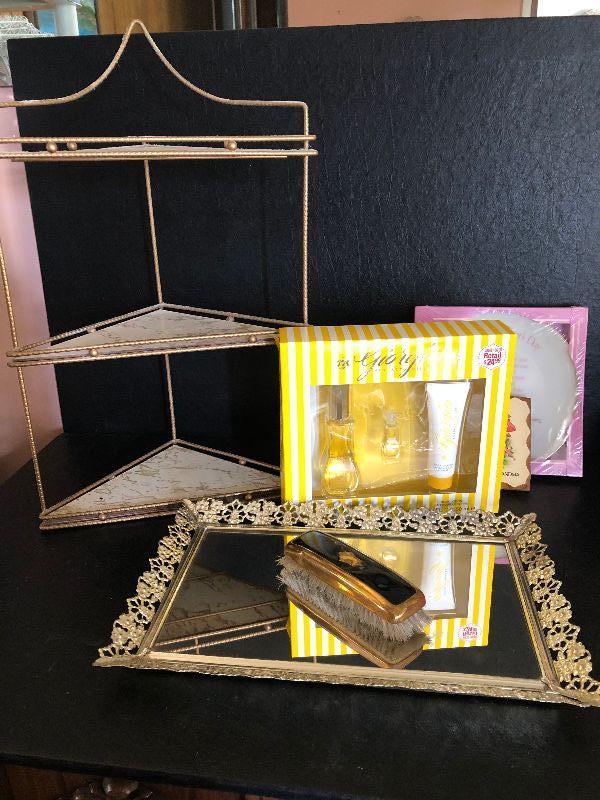 Giorgio perfume set, unopened, glass tray with metal rims, a corner hanging shelf, and more. Bring box to move.