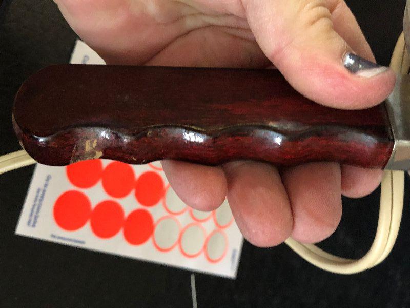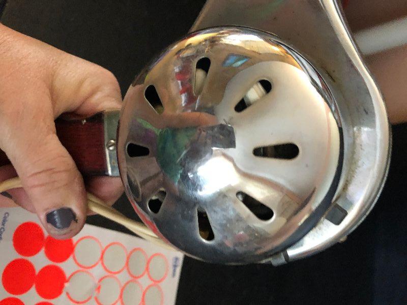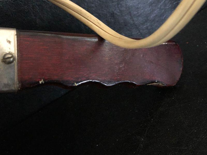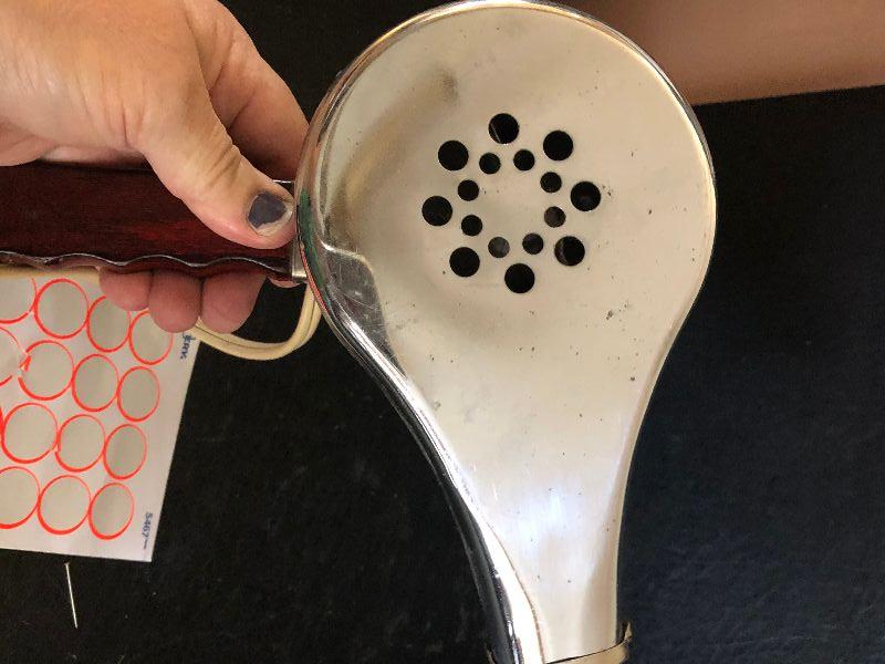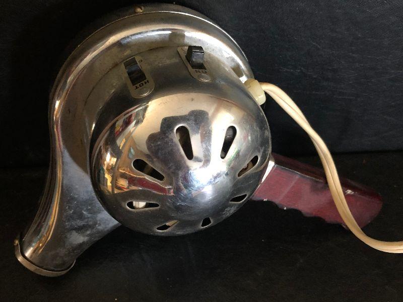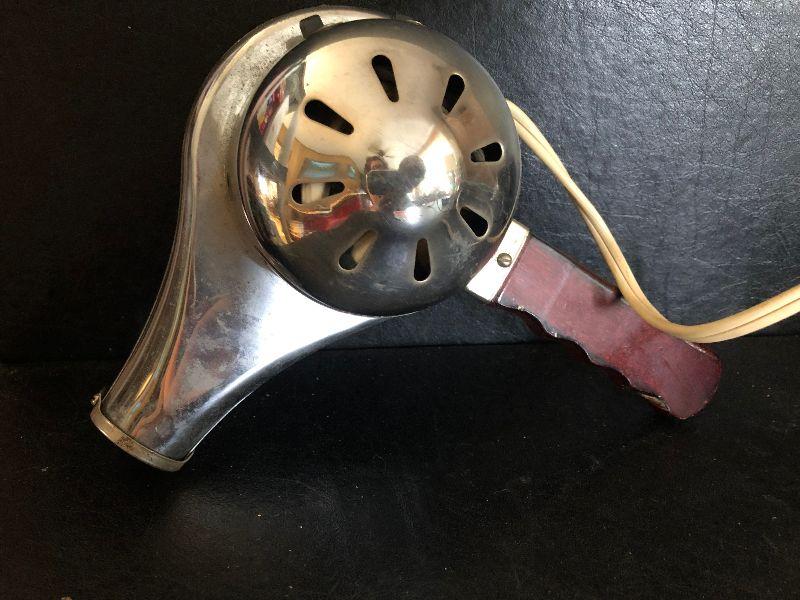 Vintage metal hair dryer with wood handle. Untested.