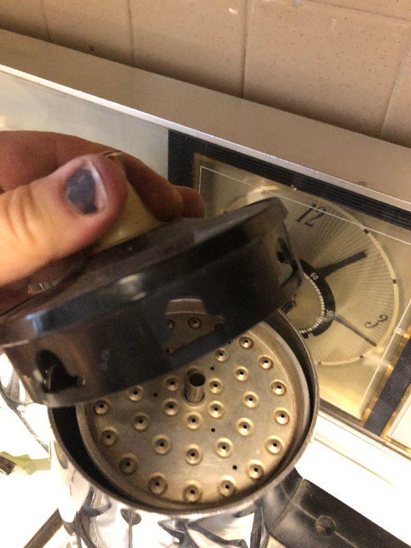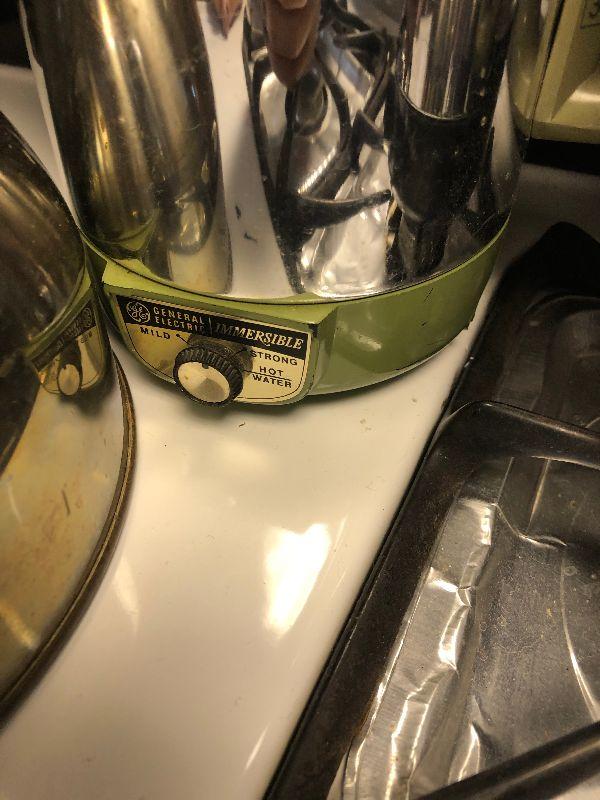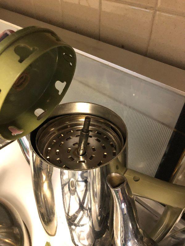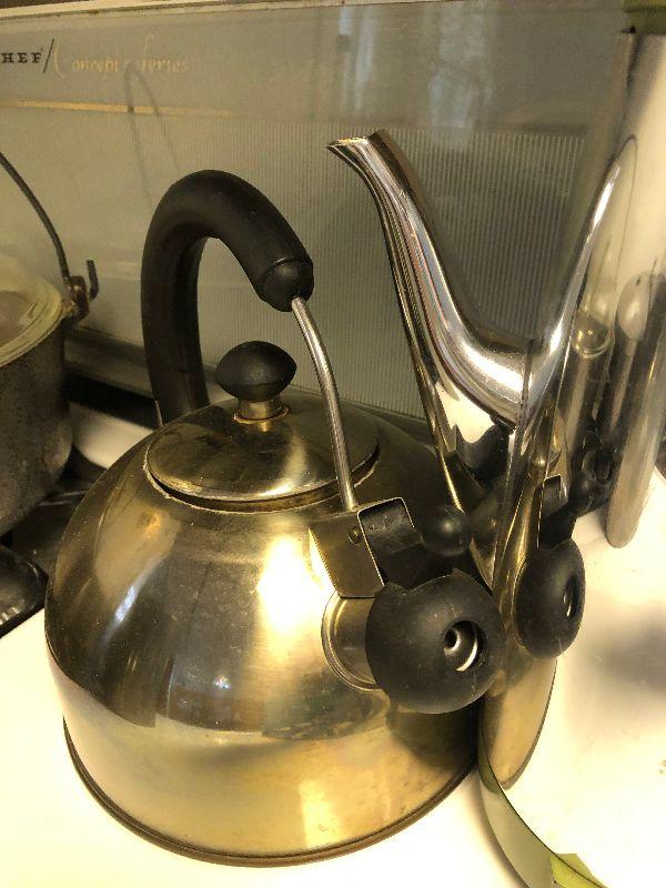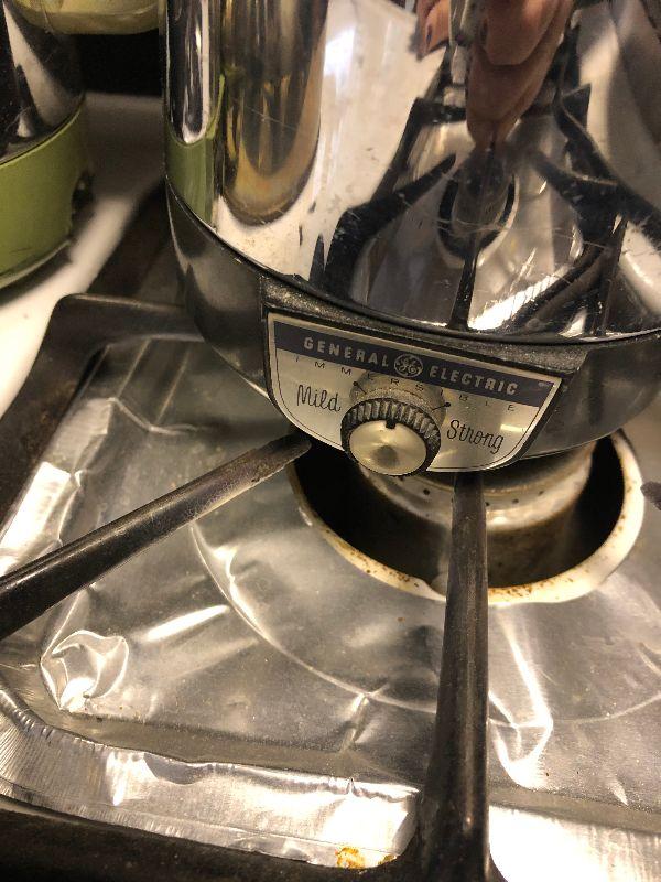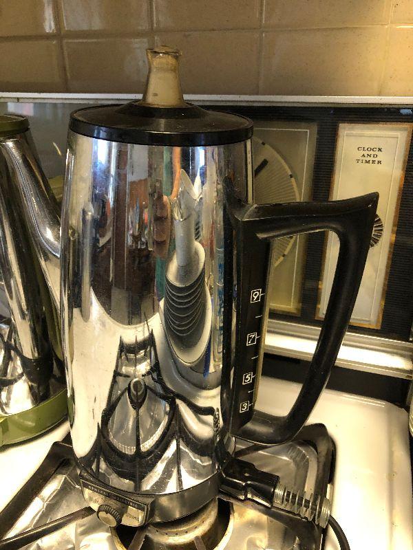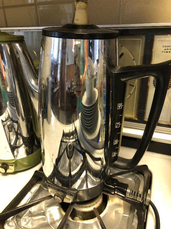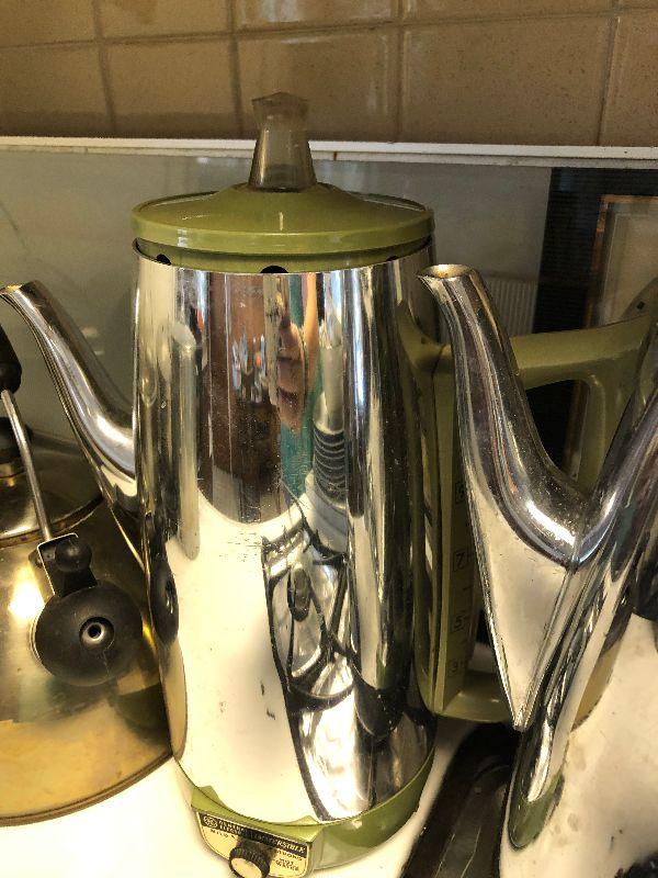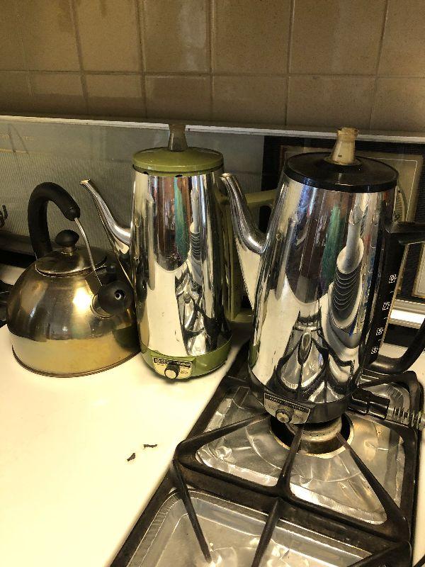 A stainless, stove top tea kettle, and two electric coffee perculators by General Electric. Untested.