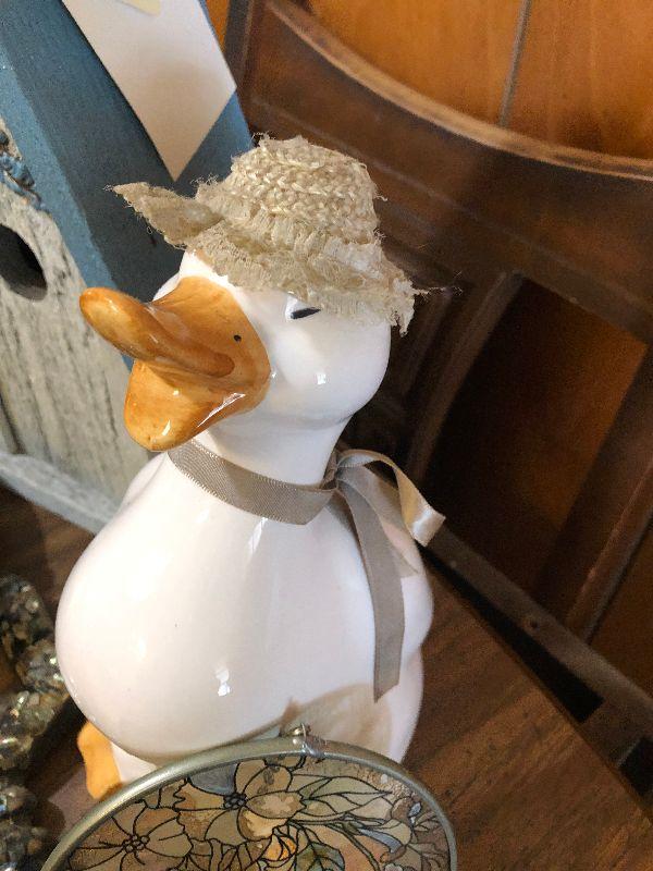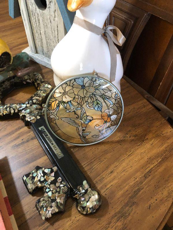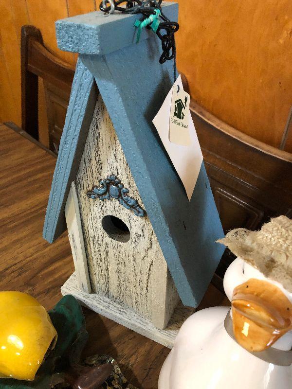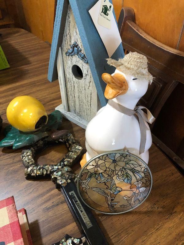 A hanging, hummingbird ornament, a laughing duck, a birdhouse, and more. Bring box for moving,