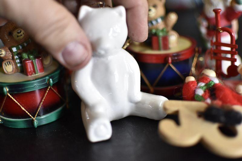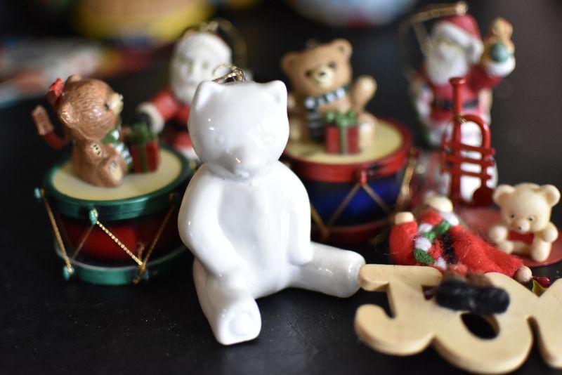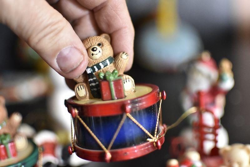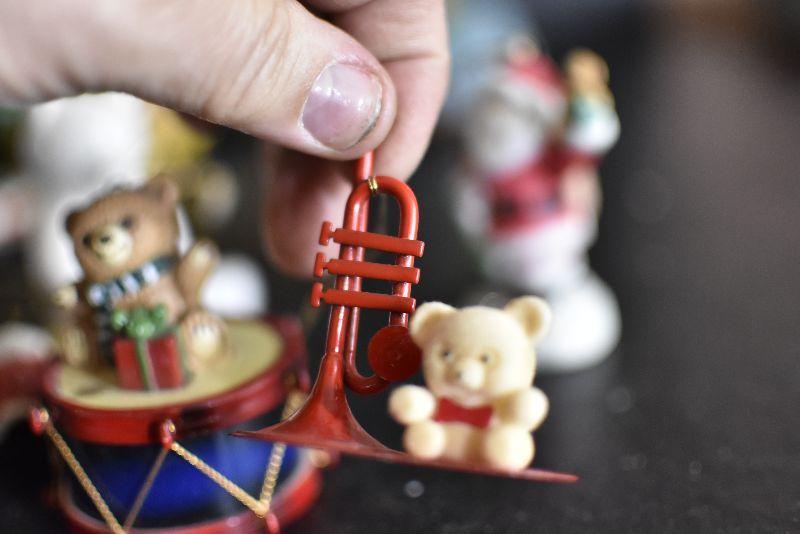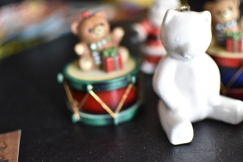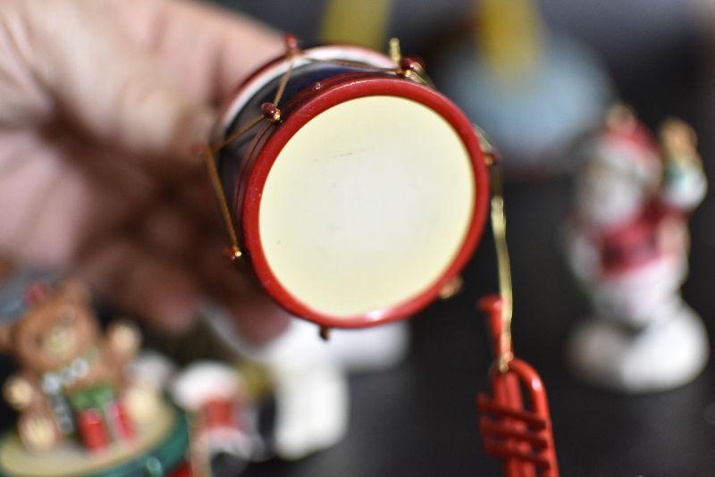 Cheerful Teddy Bears on drums, bear with Joy sign, and Santa with his teddy bear.