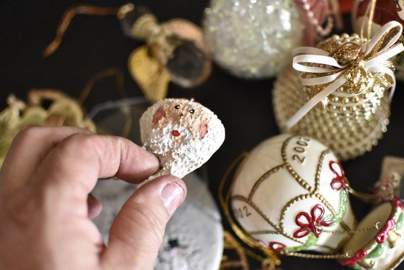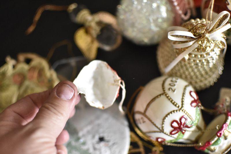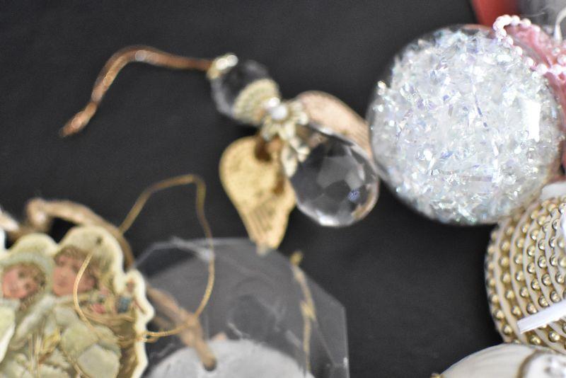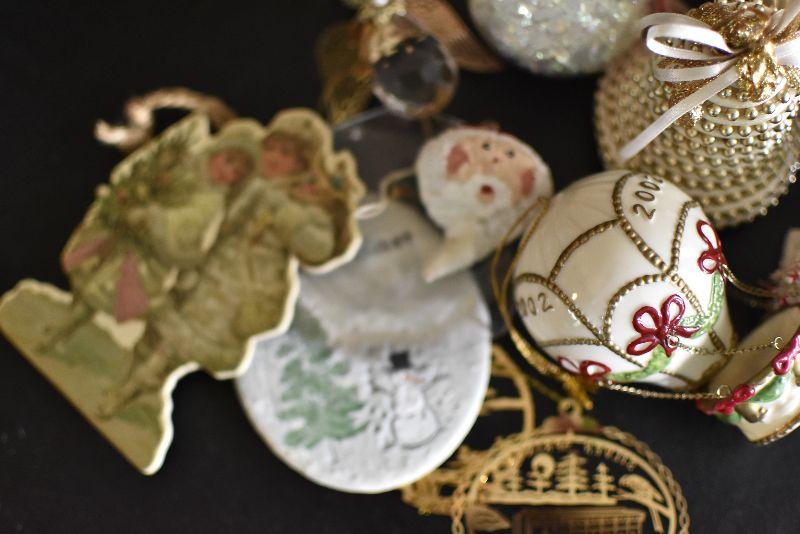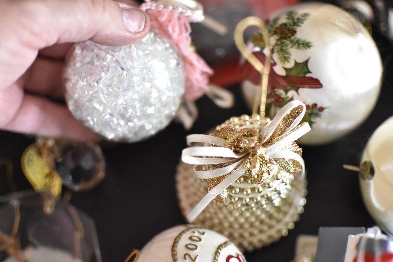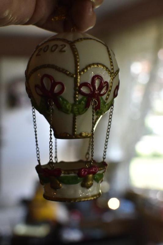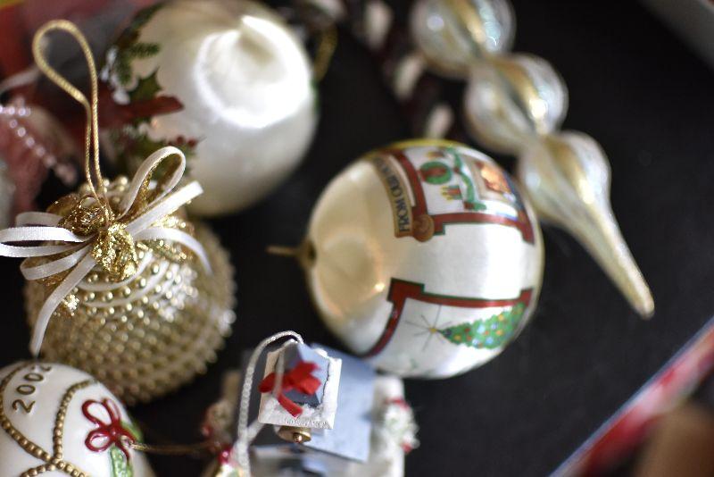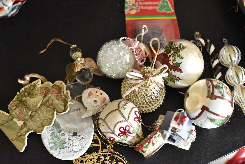 For the tree, satin like balls with Cardinal, hot air balloon, an angel and more. Bring box for moving.