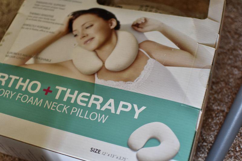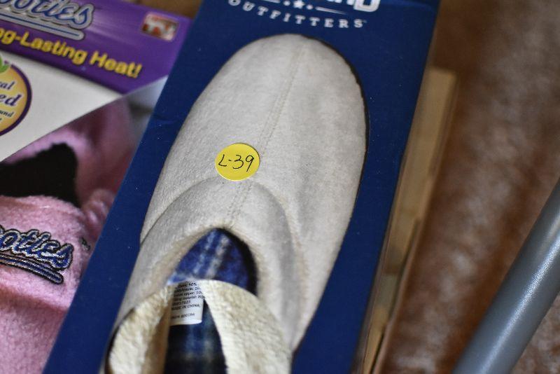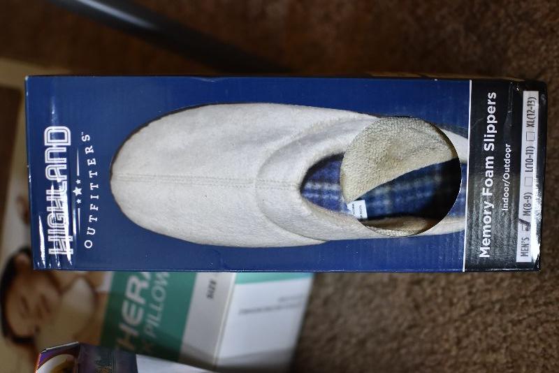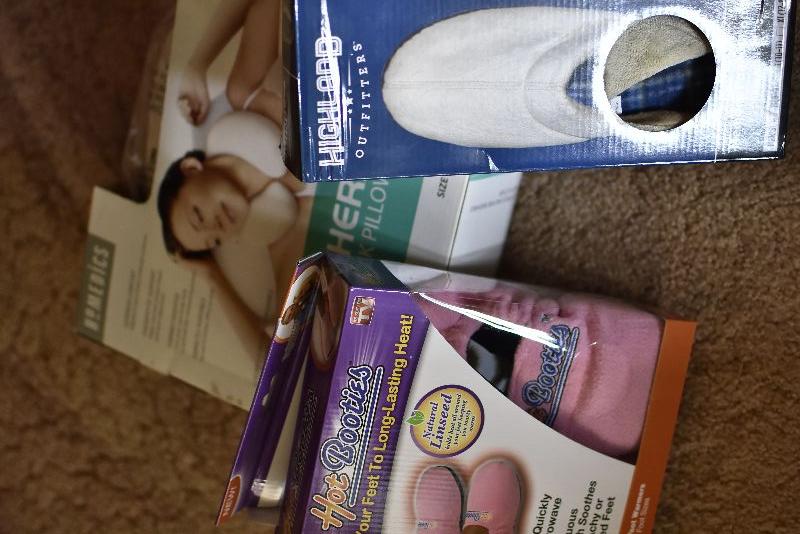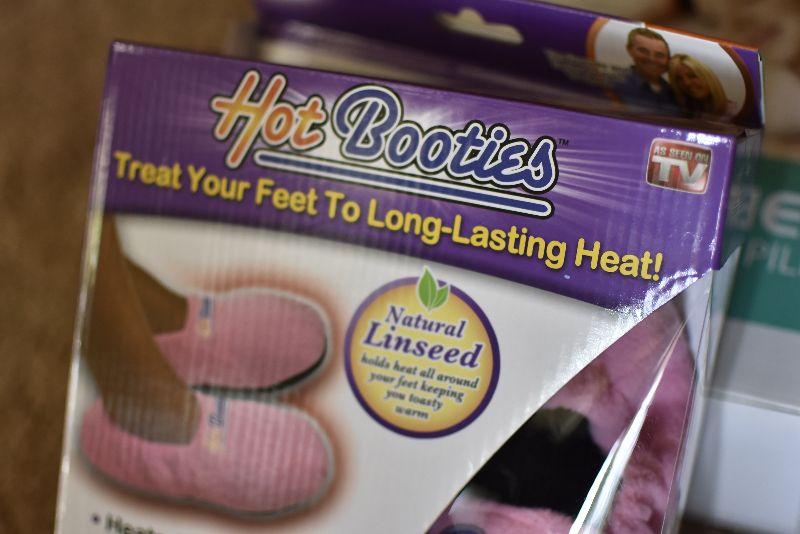 Hot Booties to keep your feet warm, a memory foam neck pillow, and a pair of slippers.