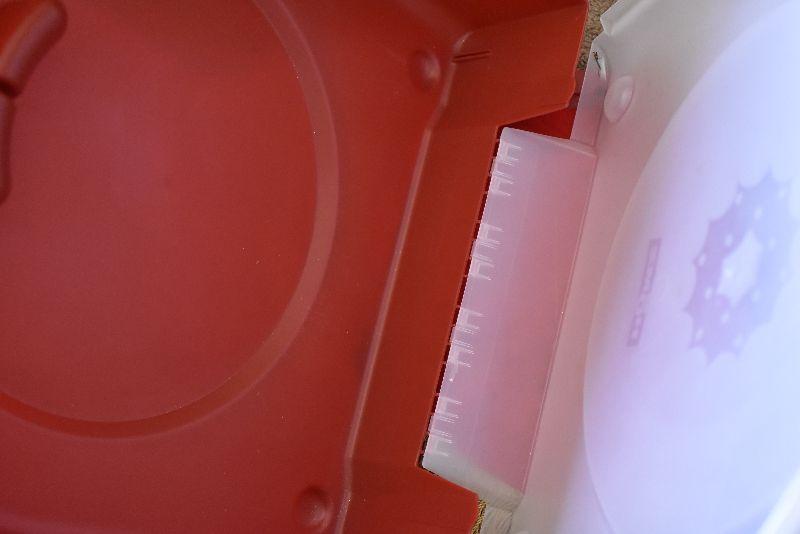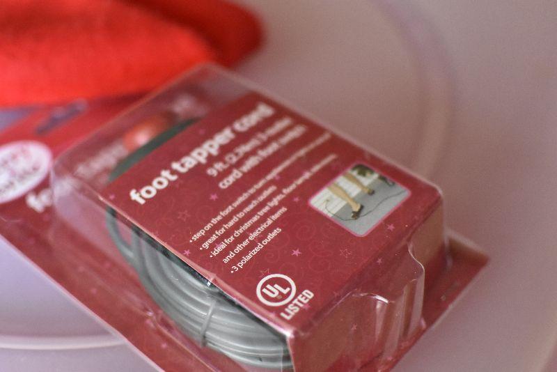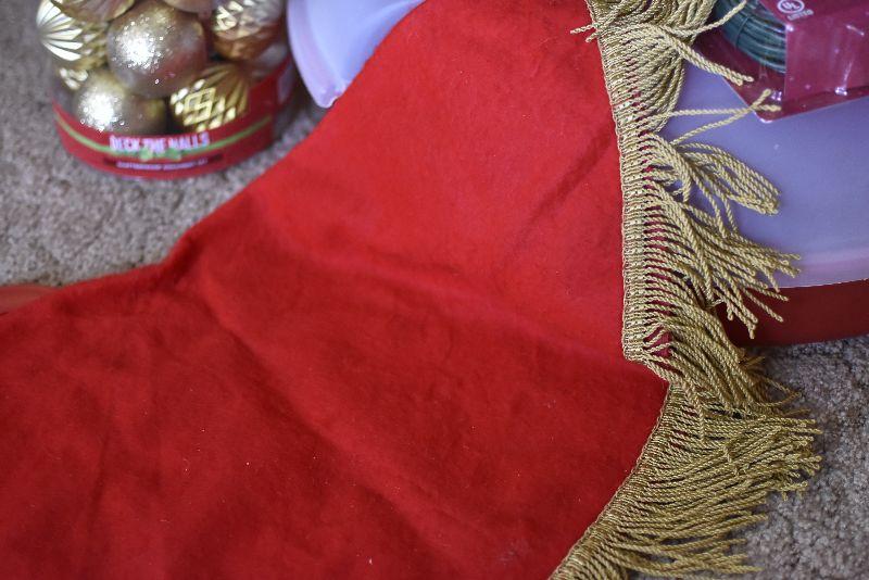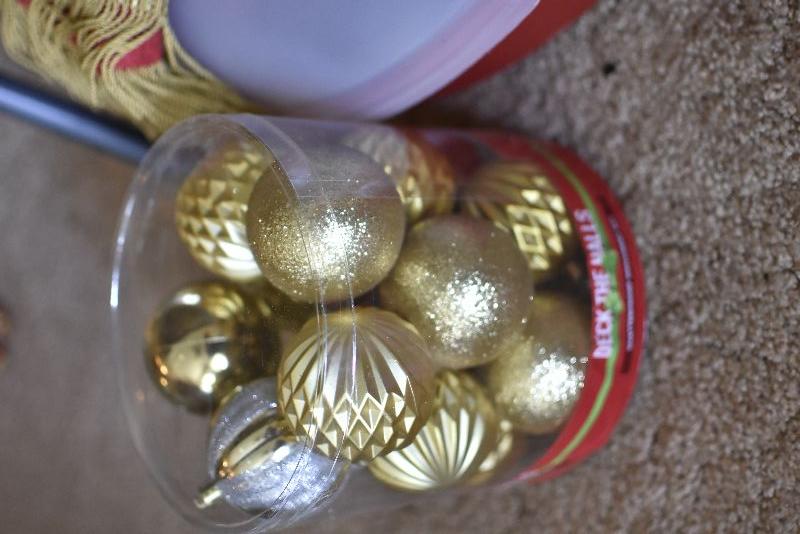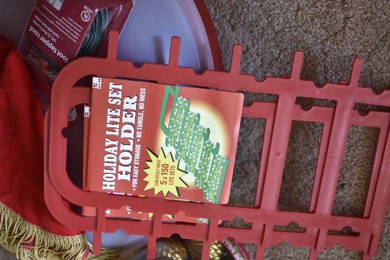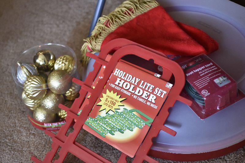 Gold balls, a tree skirt, a storage container for a wreath, and a lite holder.