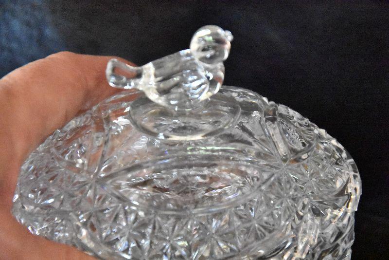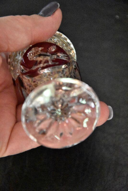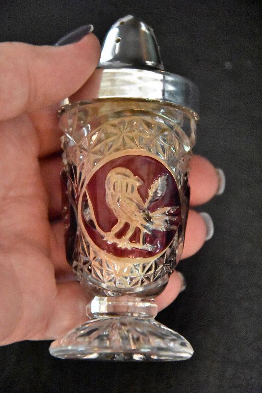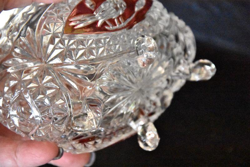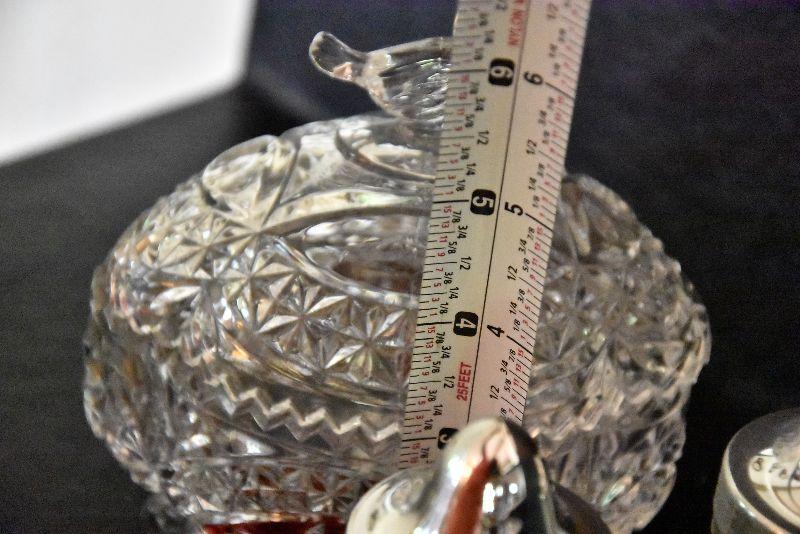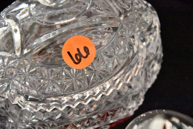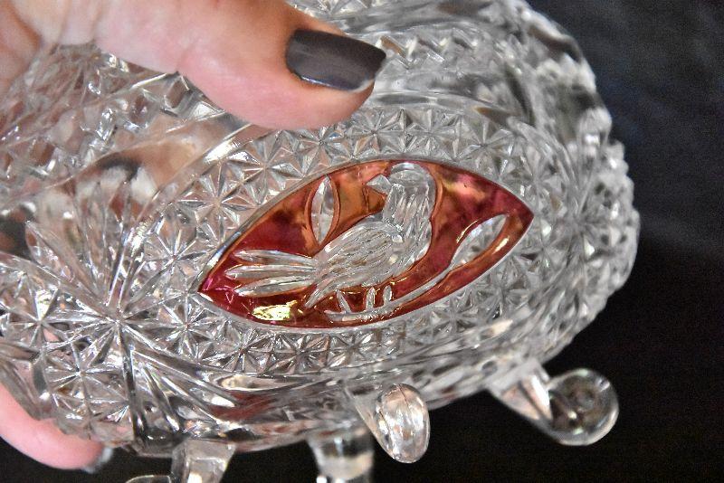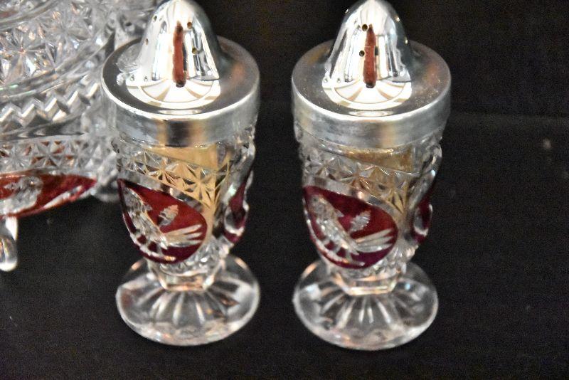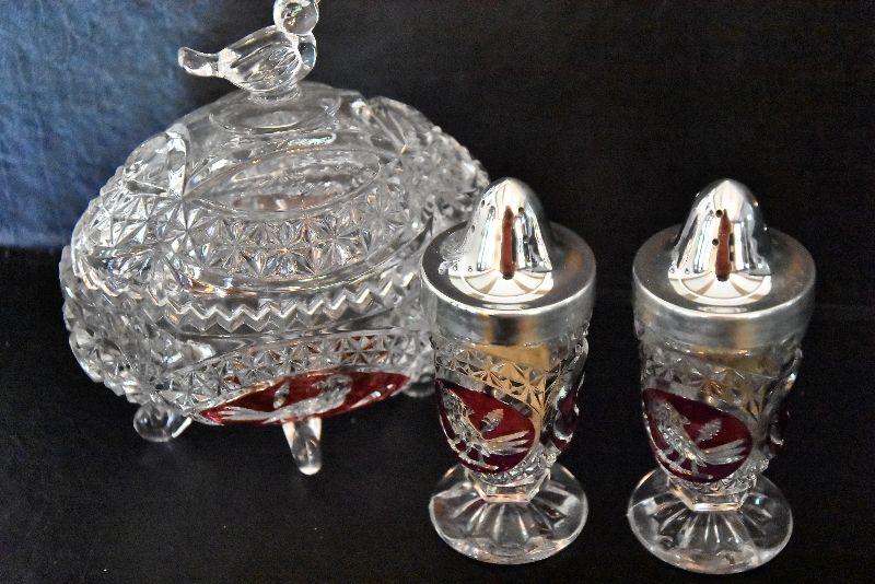 Lead crystal, ruby. red, salt and pepper shakers, a candy dish with bird handle.