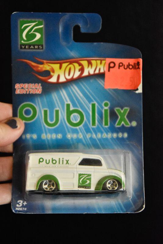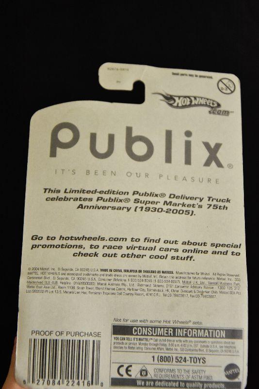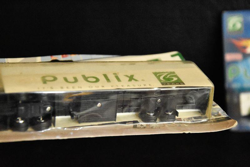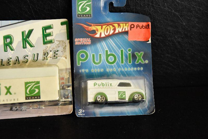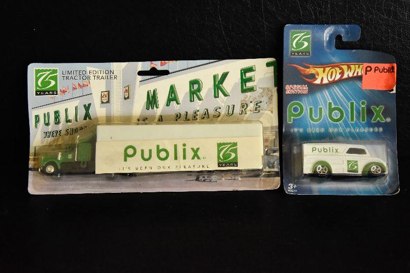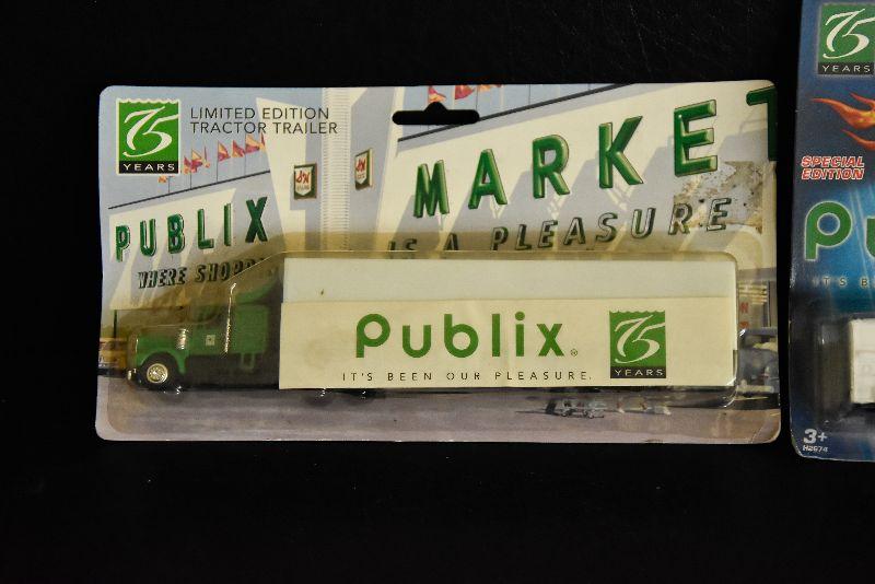 Publix Market collectable tractor and trailer, and Hot Wheel Publix truck. Both in original packaging.
