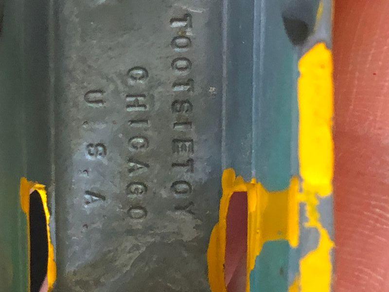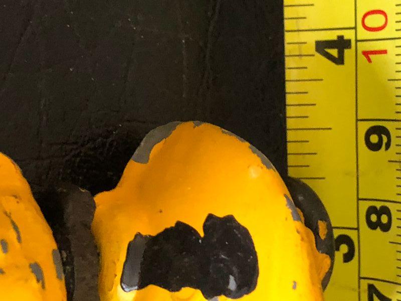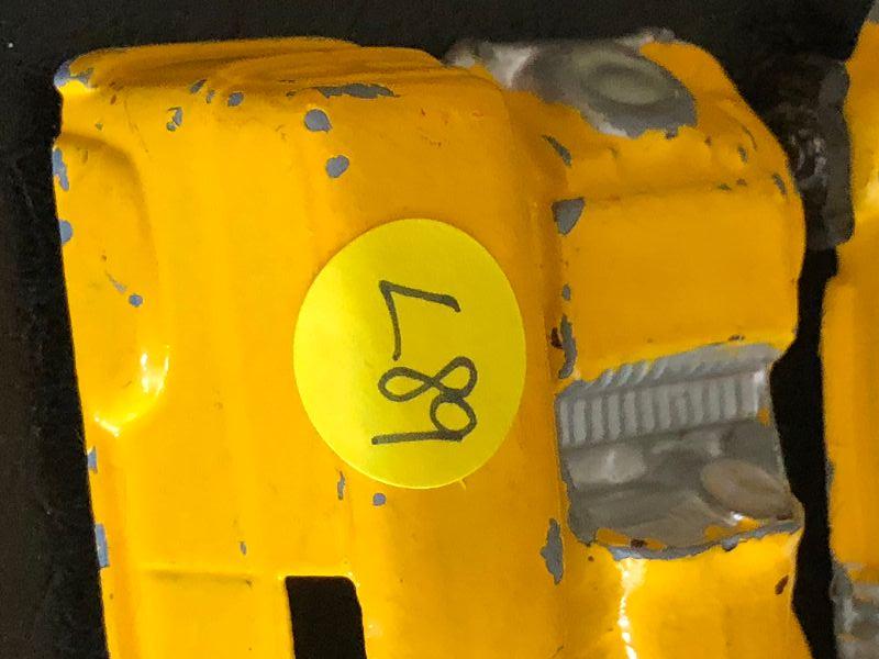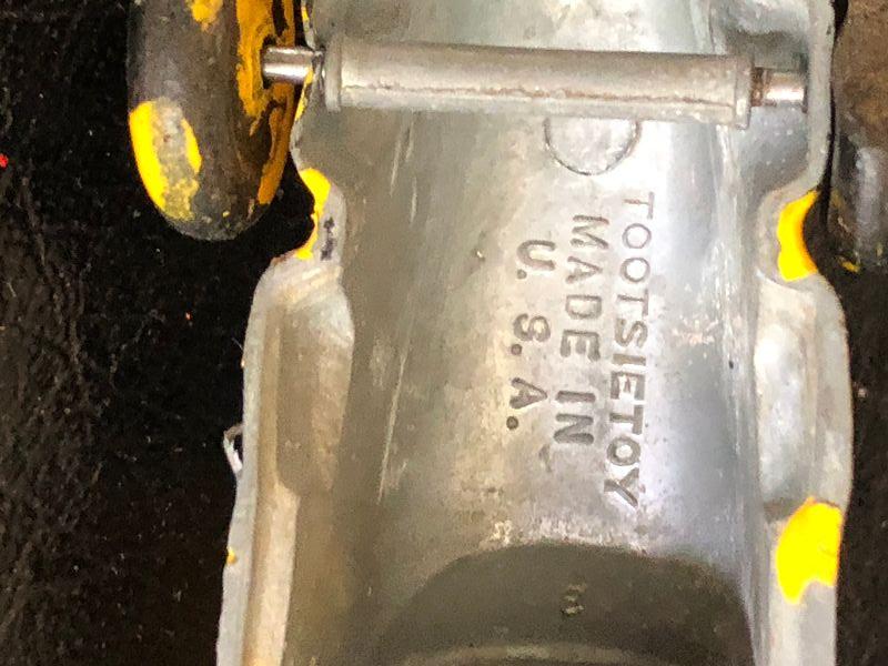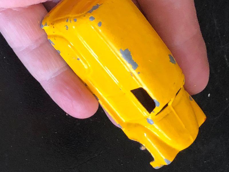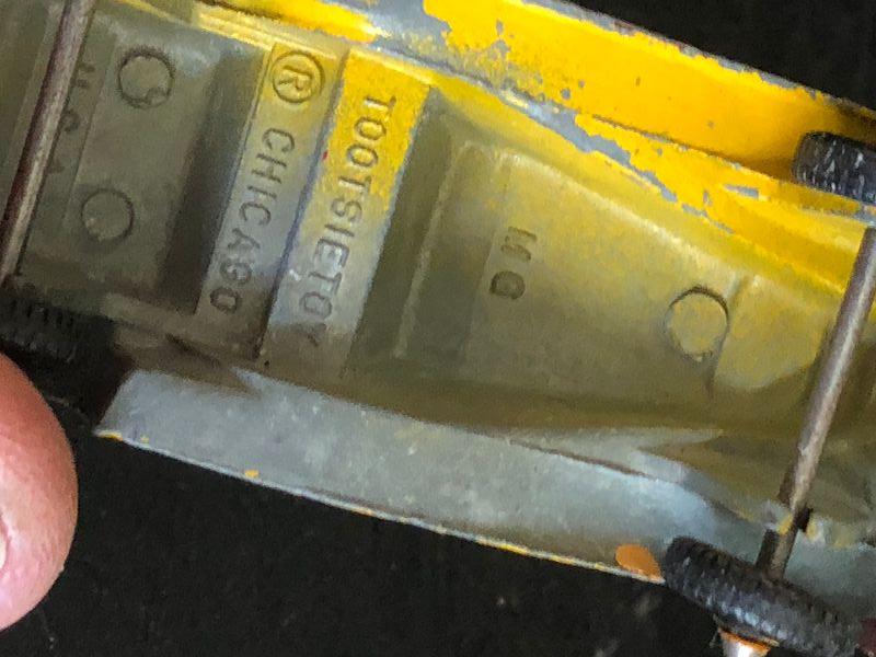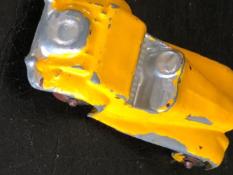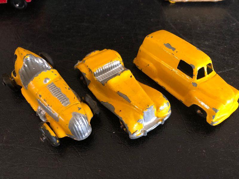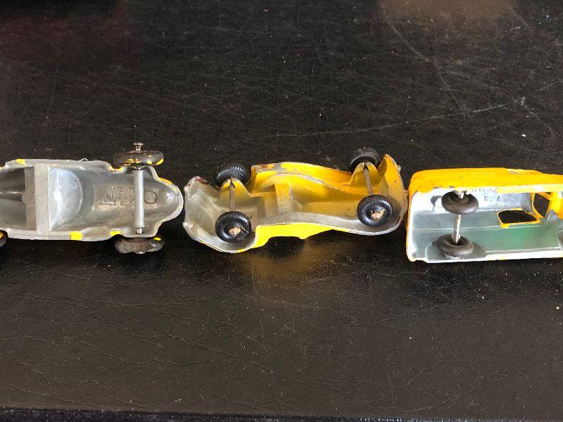 Three bright yellow Tootsie Toys cars. Wheels are still attached, one has damage. Paint loss.