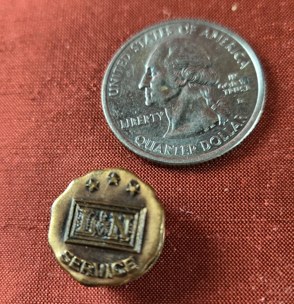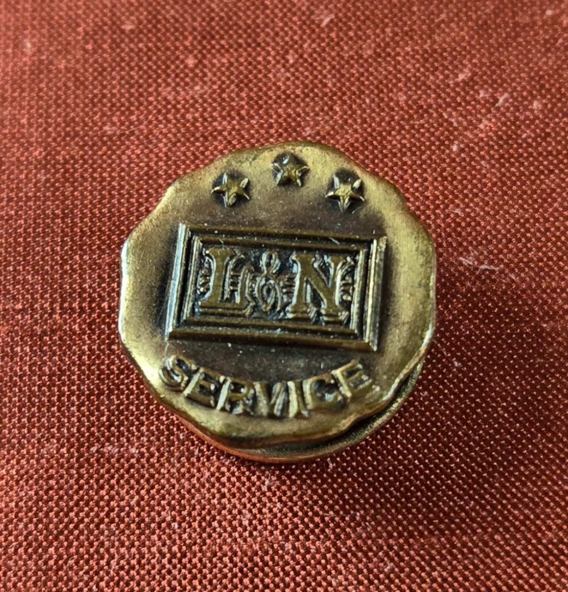 This auction lot is for a vintage L & N Service Pin. This is a collectible, brass Louisville & Nashville Railroad Service Pin. It is in good condition. The metal is not marked.