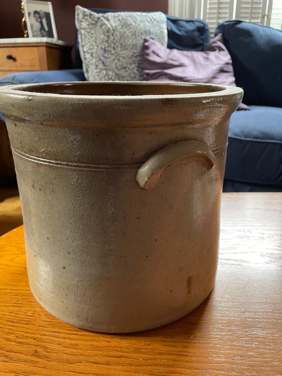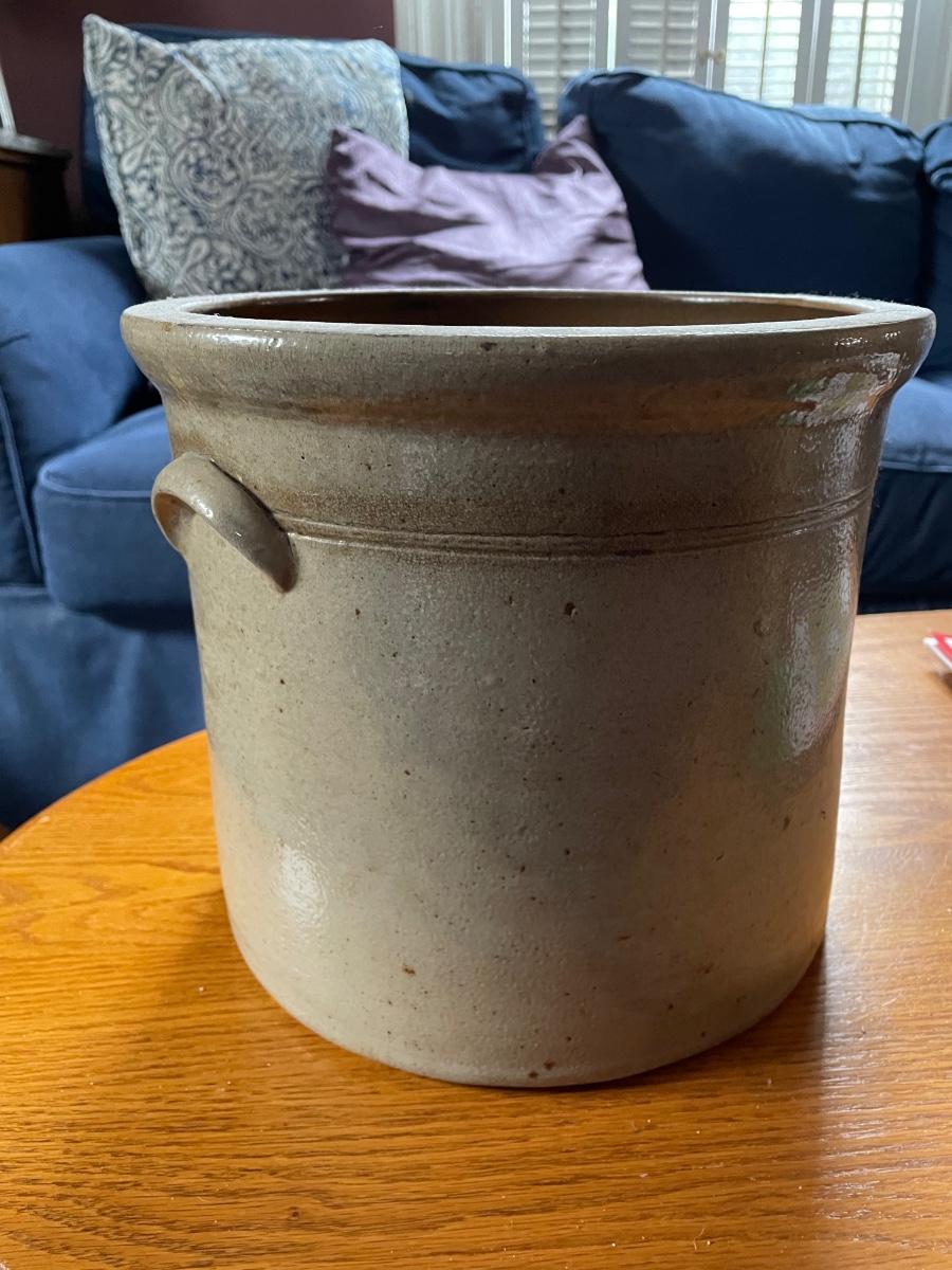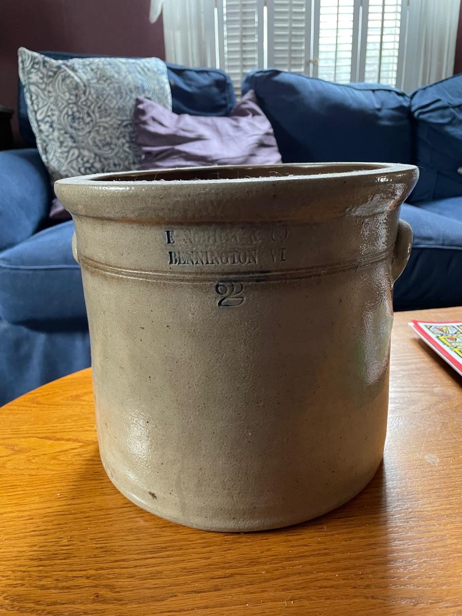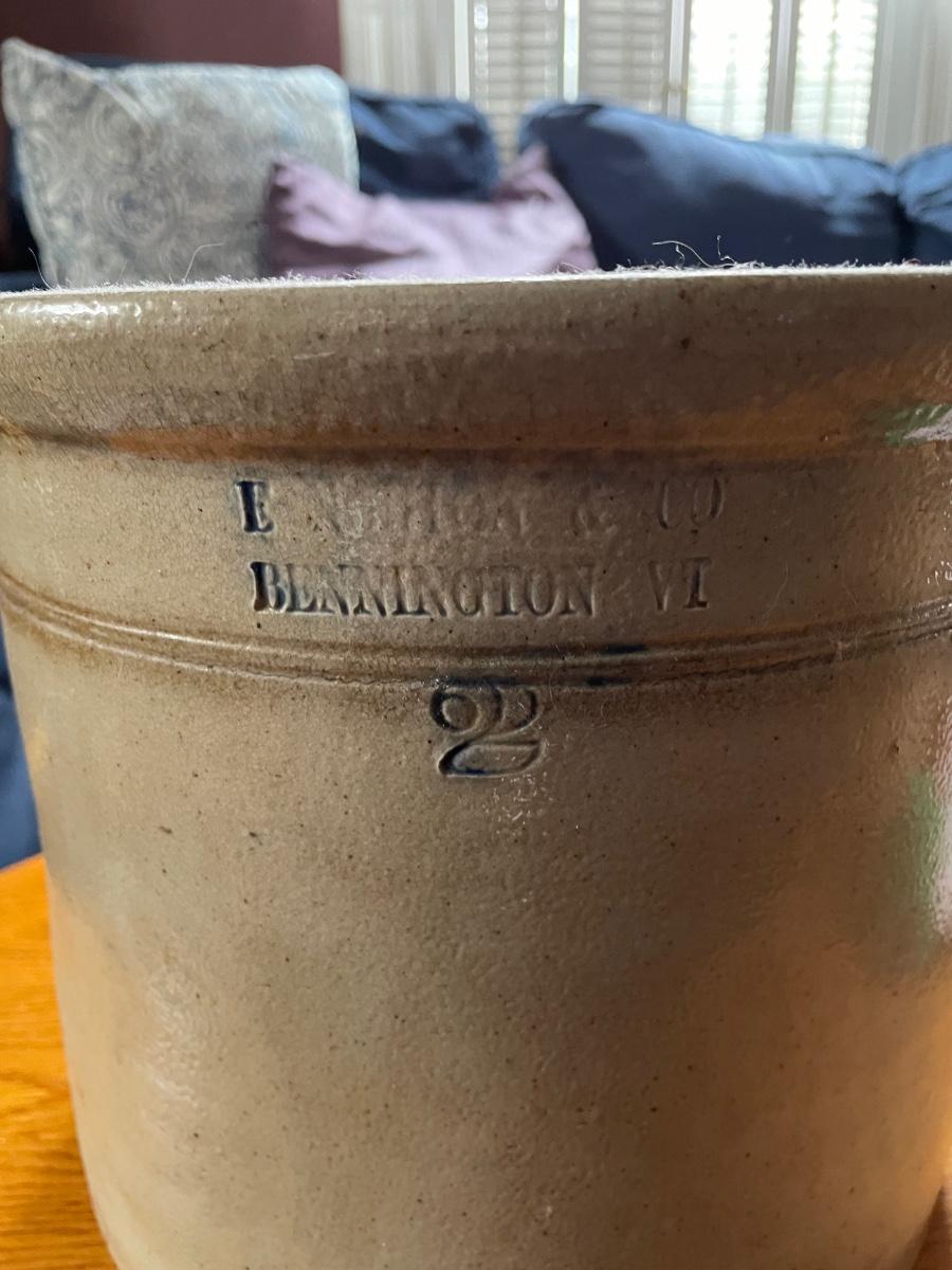 2 gallon crock measuring 9” high from Bennington, VT. No lid.