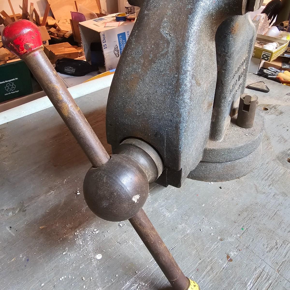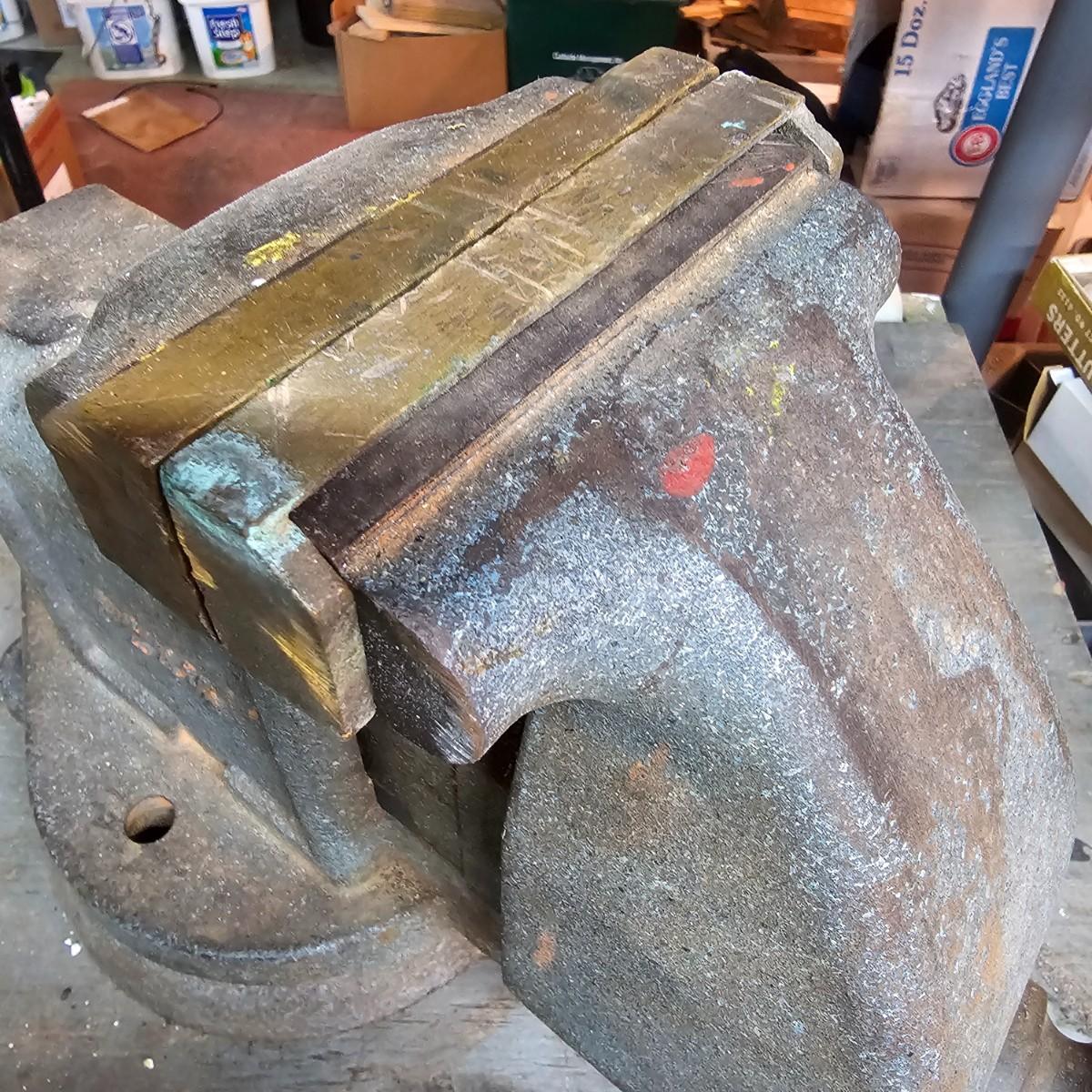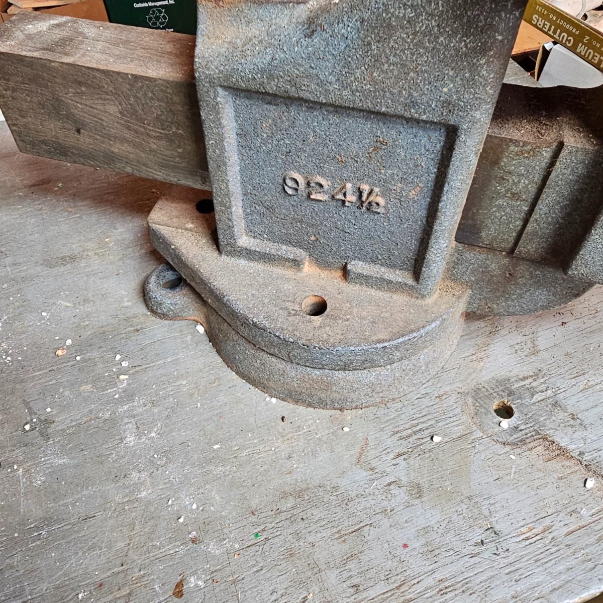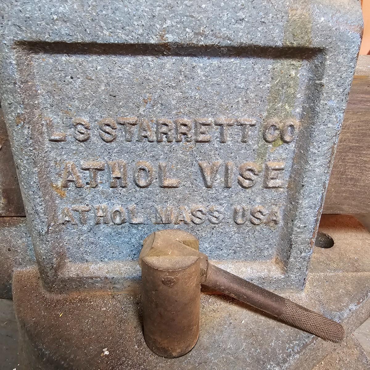 Heavy duty bench vise by LS Starrett. Vise has swivel base and lock, long handle open/close bar and custom made brass jaw pieces to prevent marring. Vise measures 9" x 19.5" x 11.5"H, includes mounting bolts to secure to bench. Also has flat surface behind body for tapping or flattening. See photos for details. Local pickup only.