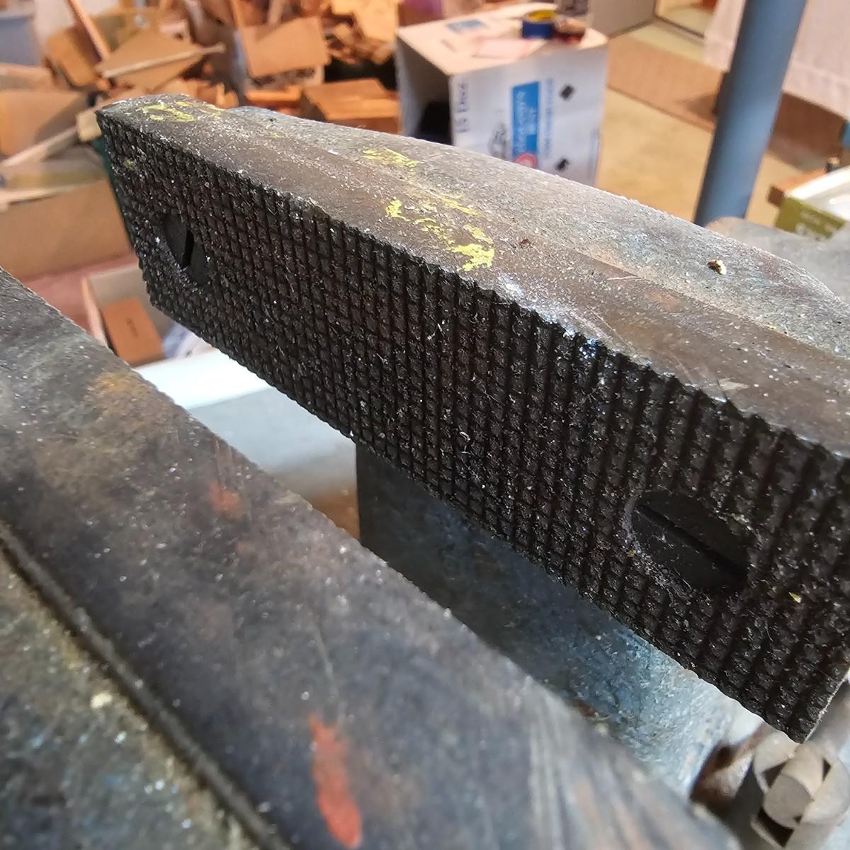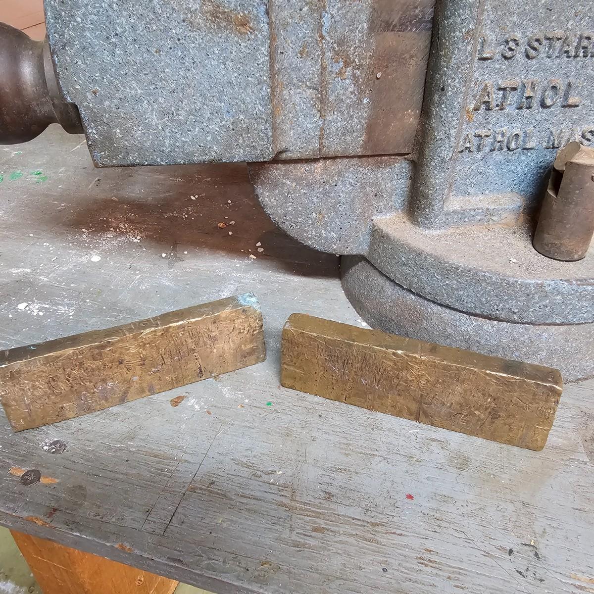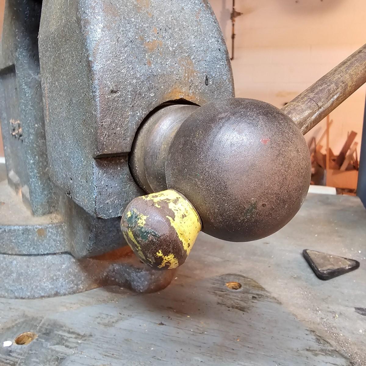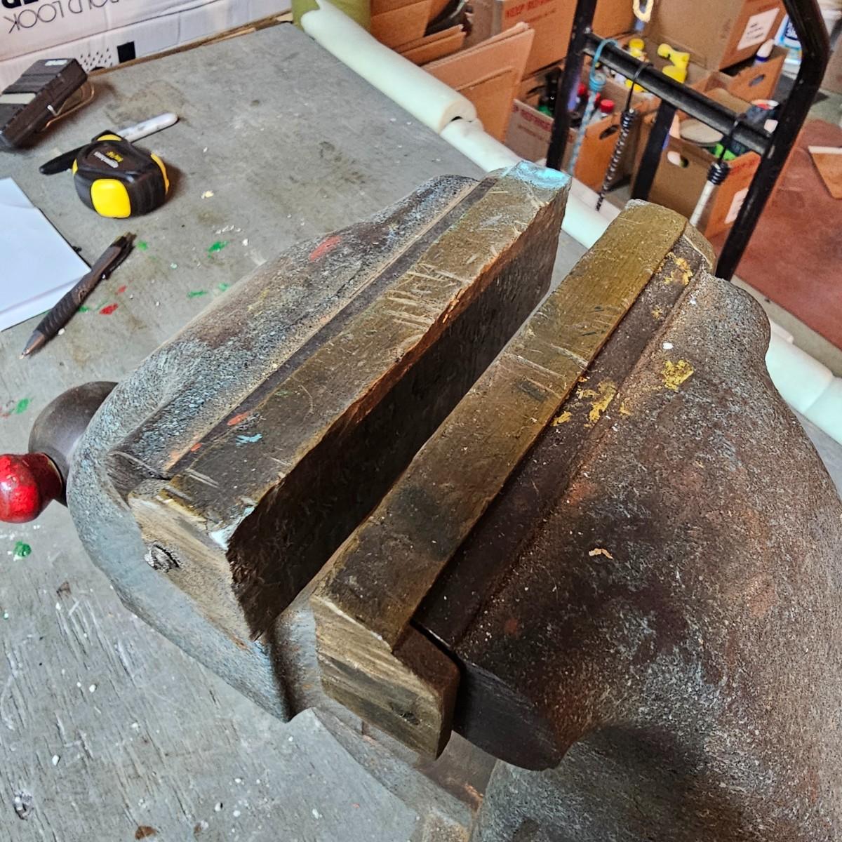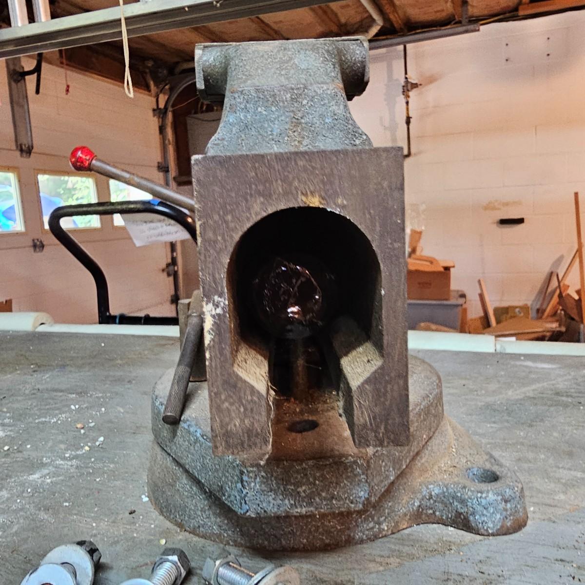 Heavy duty bench vise by LS Starrett. Vise has swivel base and lock, long handle open/close bar and custom made brass jaw pieces to prevent marring. Vise measures 9" x 19.5" x 11.5"H, includes mounting bolts to secure to bench. Also has flat surface behind body for tapping or flattening. See photos for details. Local pickup only.