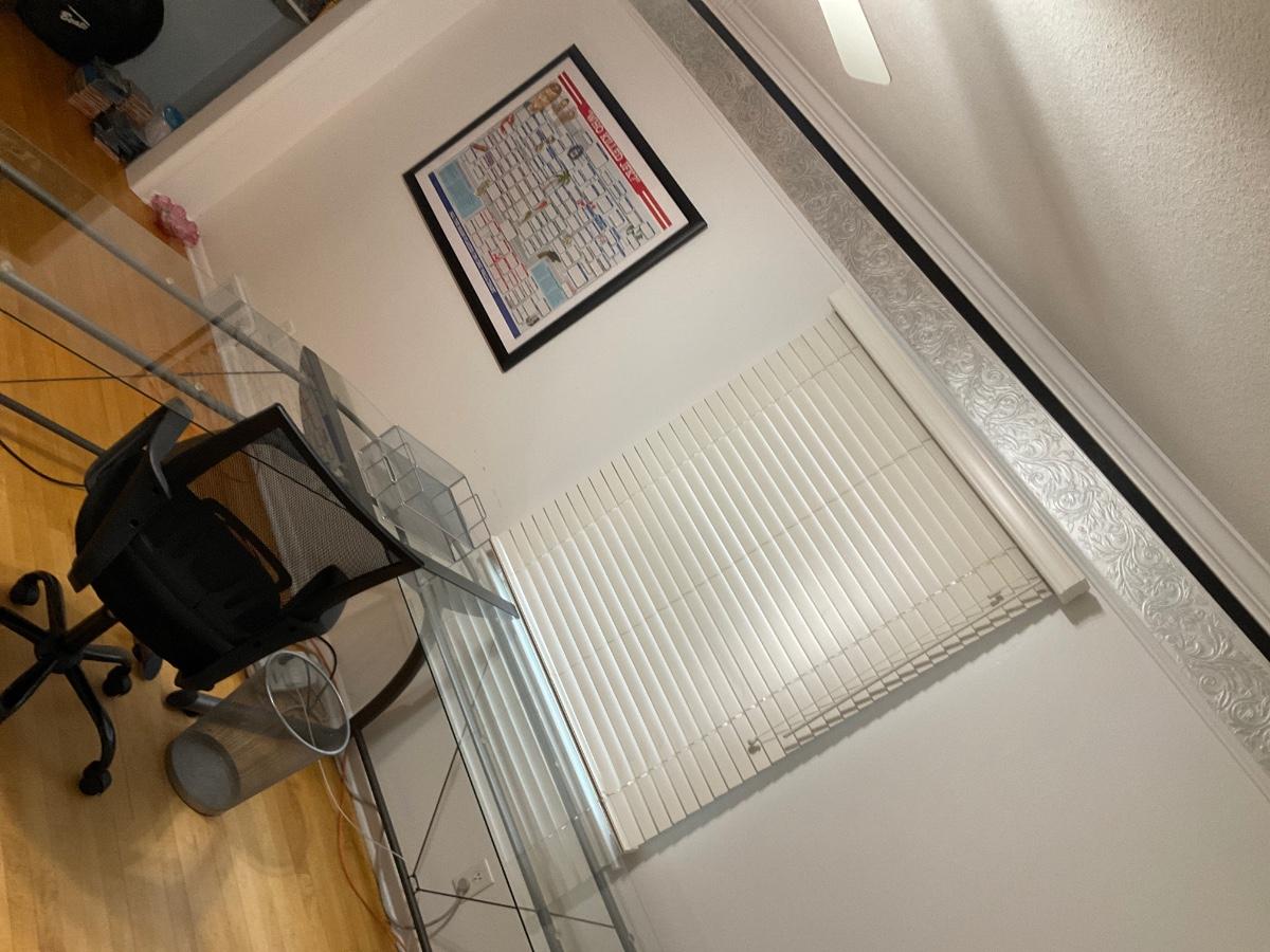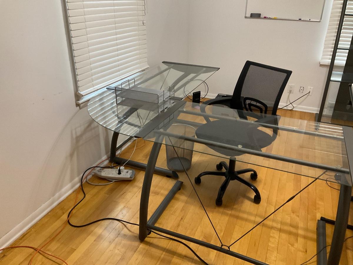 Modern Glass and metal L shaped desk includes office chair, metal file holder, and metal waste basket.