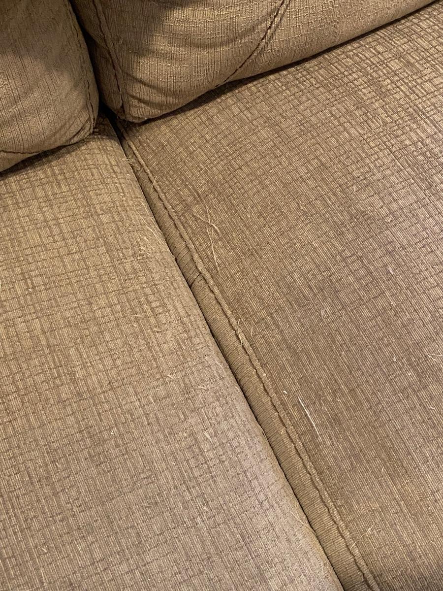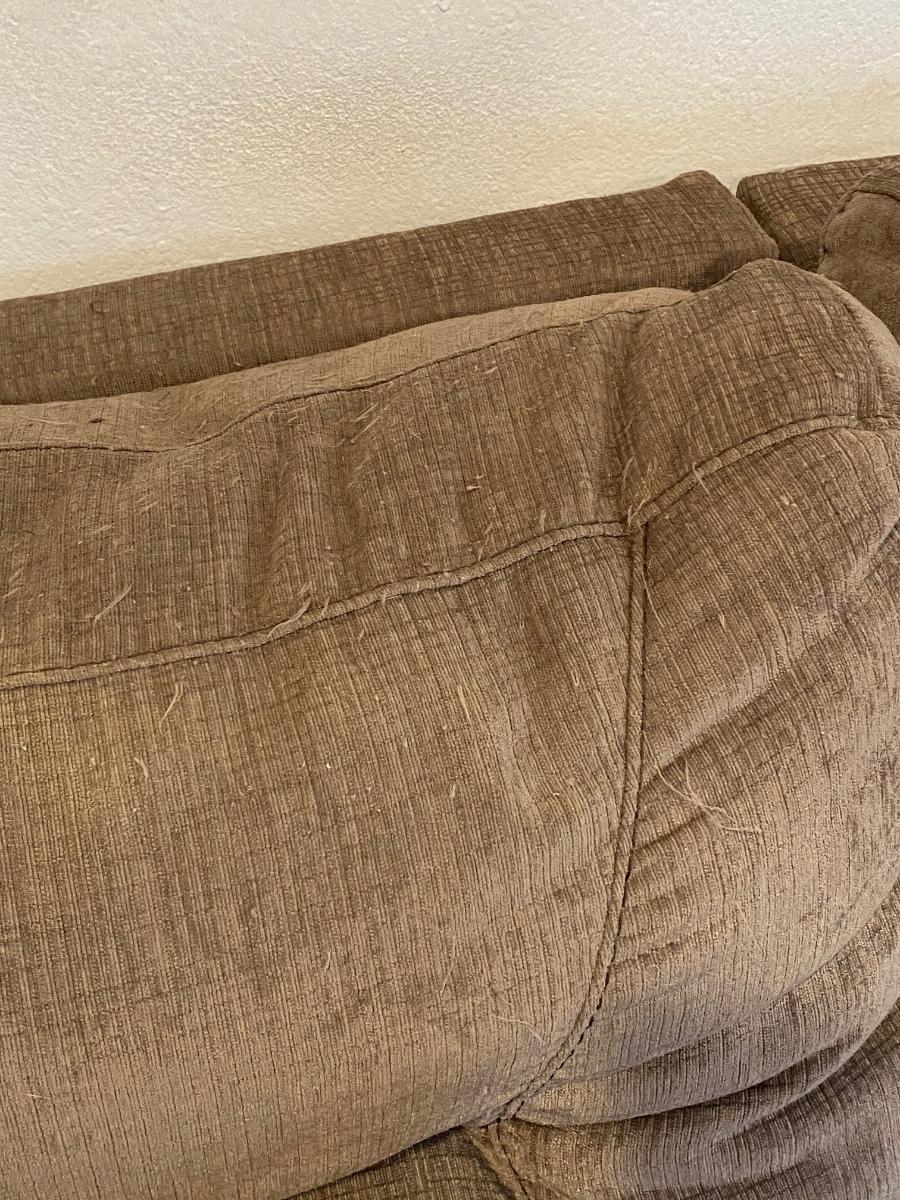 L shaped corner couch. Has recliner seats at each end. Could not get recliners to recline but I did not sit down on seat. There is pull handles at the ends (photo) that assist with recliner mechanism. In fair condition. Beige brown color. Previous owner had pets, but did not notice any spots or stains. About 5' to 6' from end to corner.