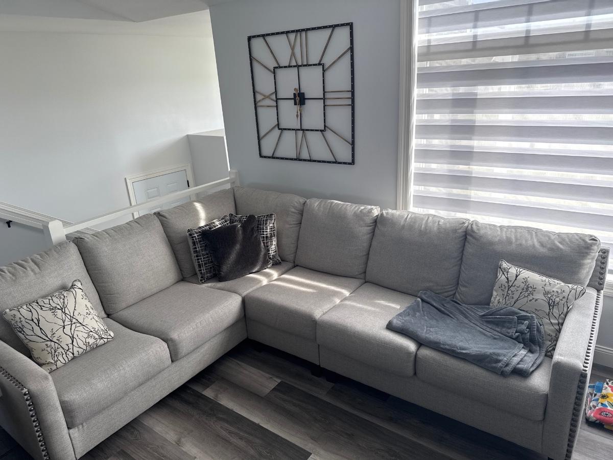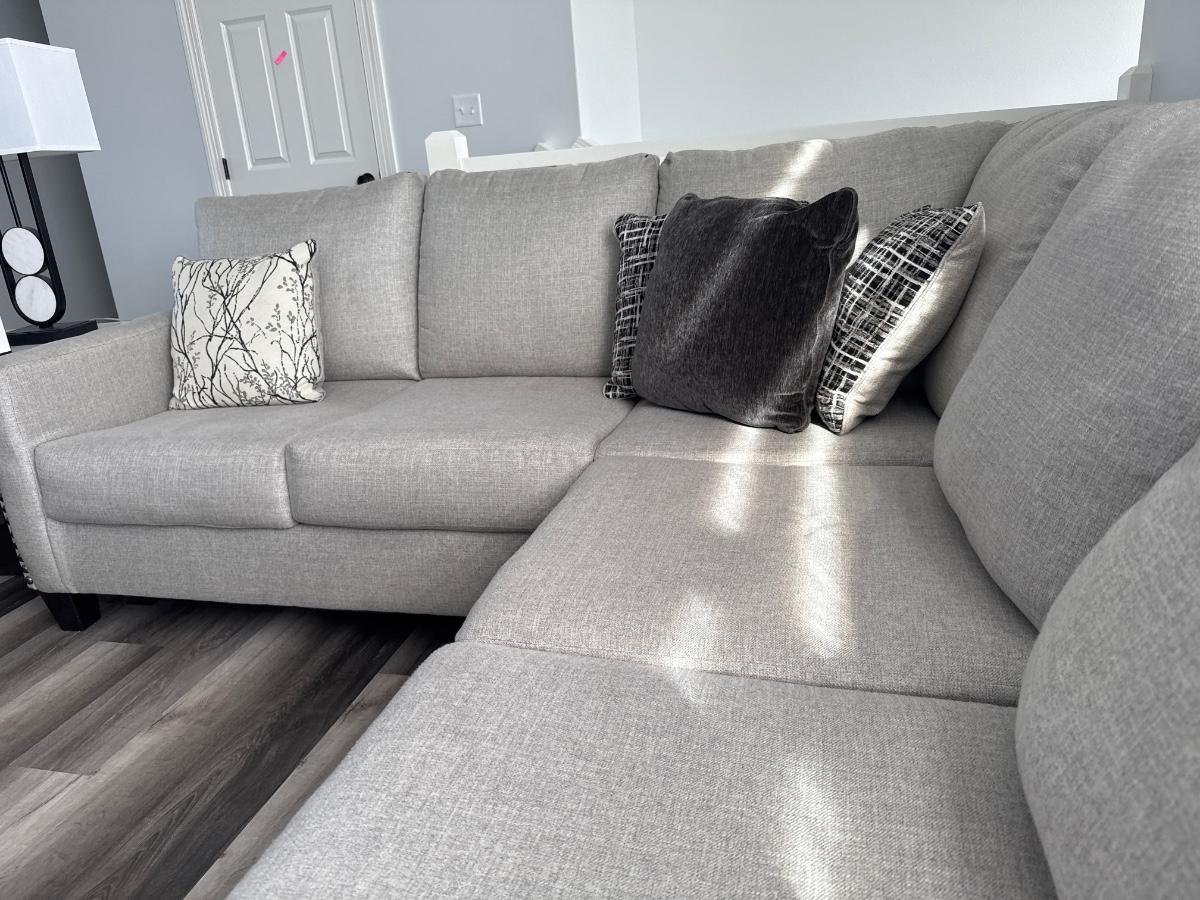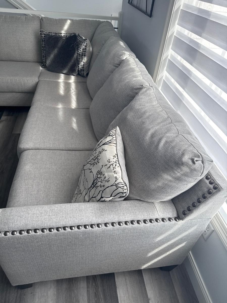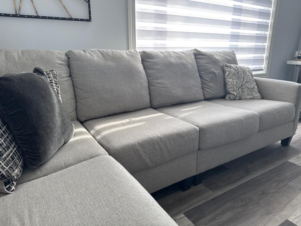 L Shaped Couch is modern and is in great shape. No visible stains. Dimensions are long side is 10 ft long and short side was 93” long.