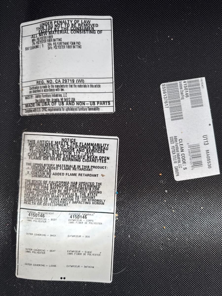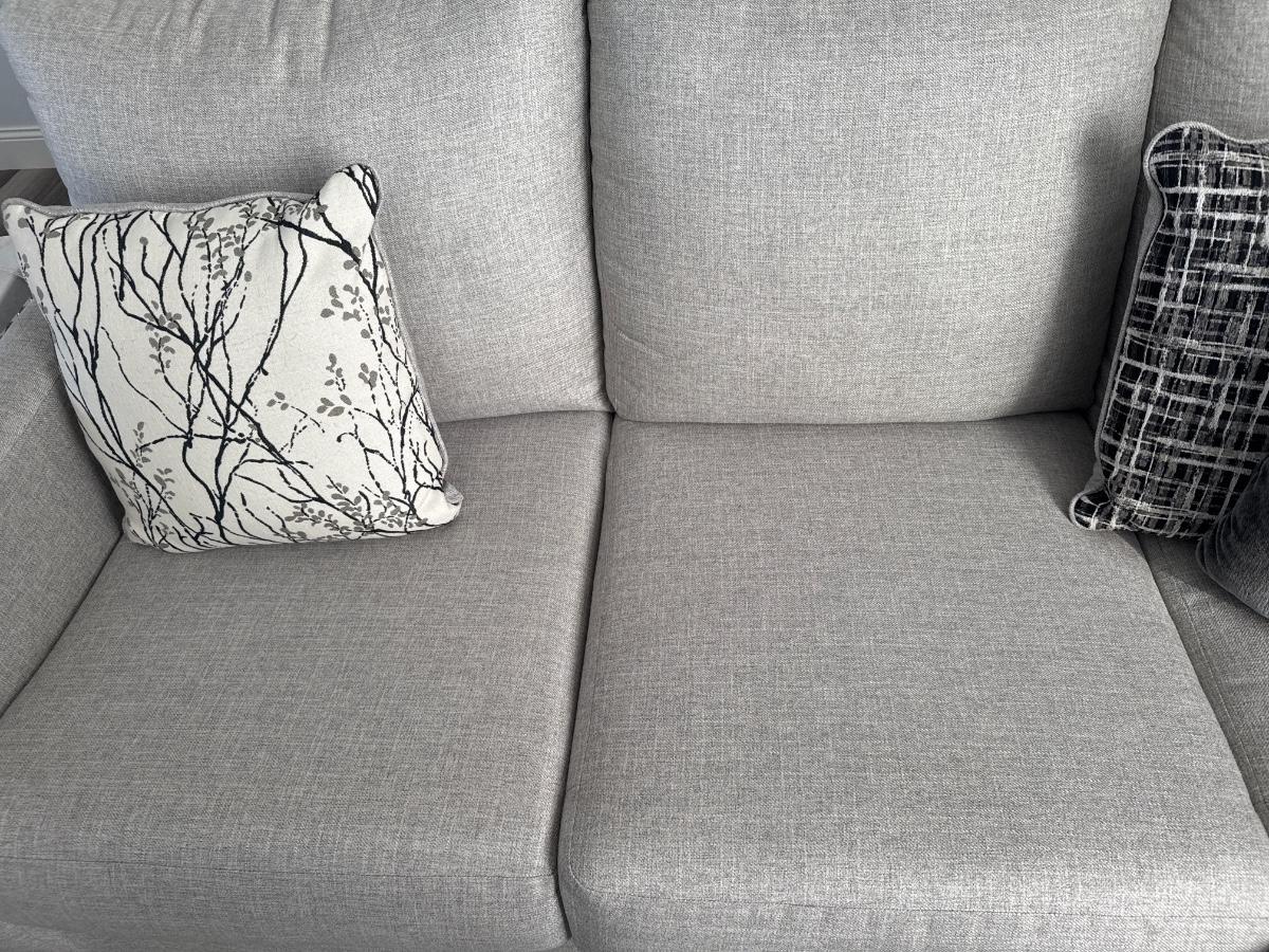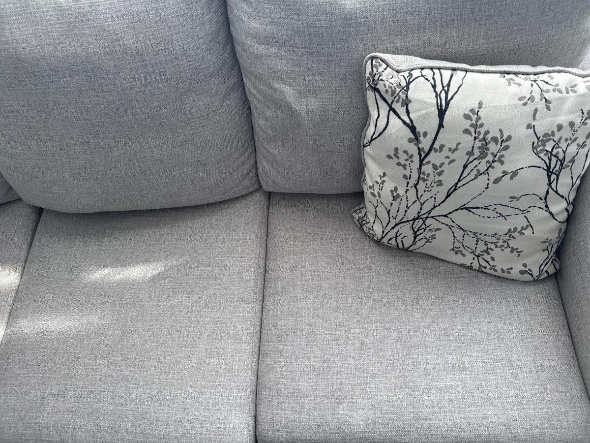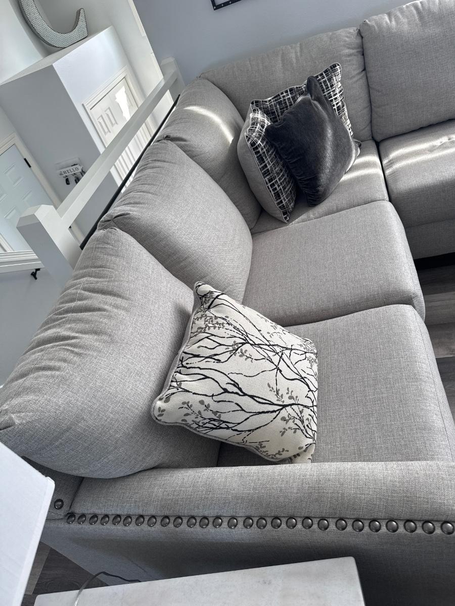 L Shaped Couch is modern and is in great shape. No visible stains. Dimensions are long side is 10 ft long and short side was 93” long.