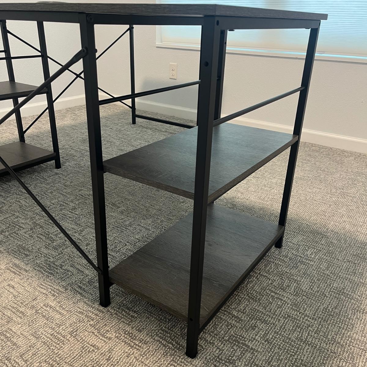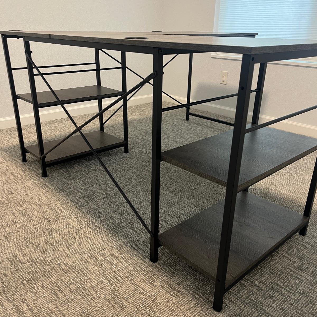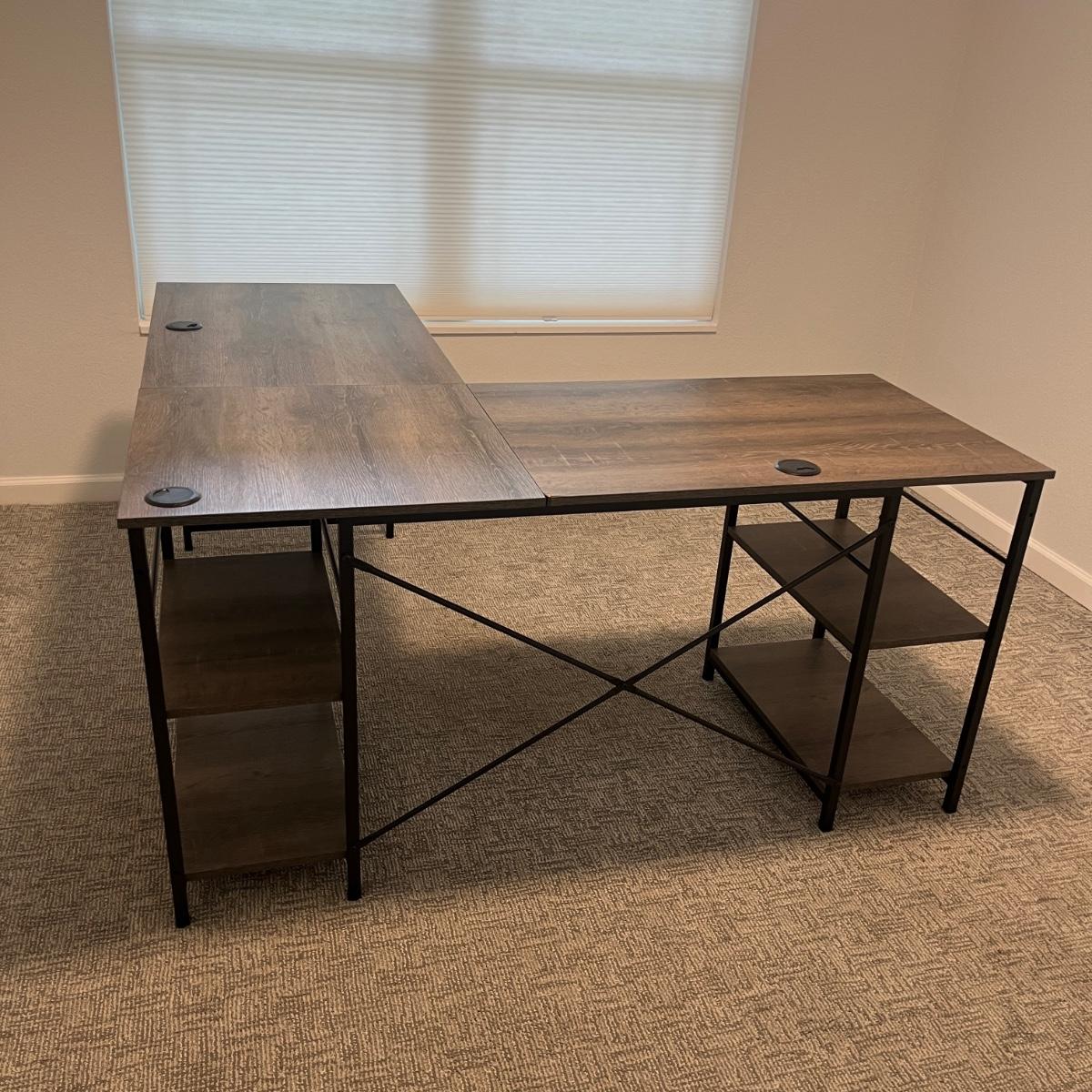 Lot includes a l shaped desk with shelves. Desk is a metal frame with pressed board tops. One top has damage and scratches, see pictures.