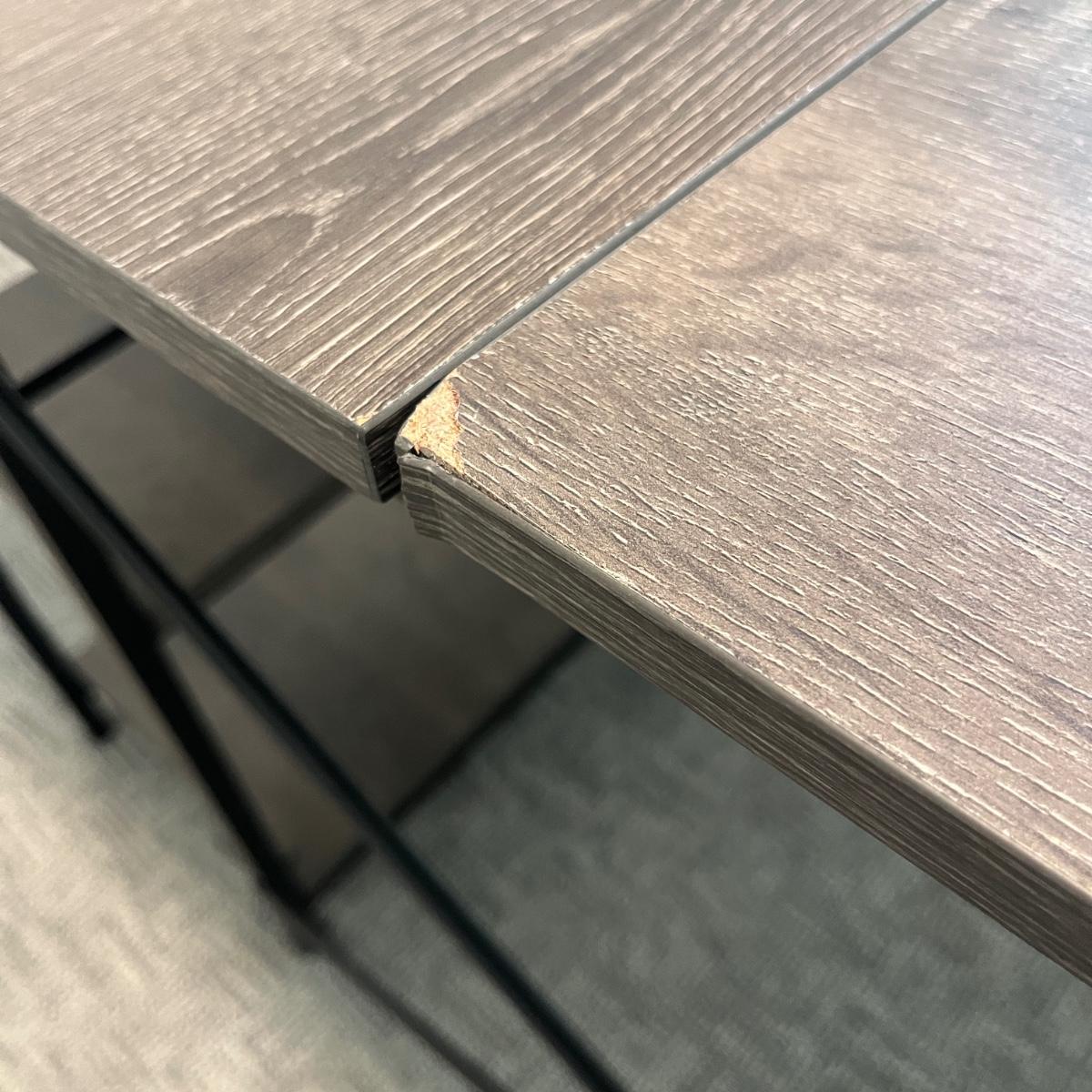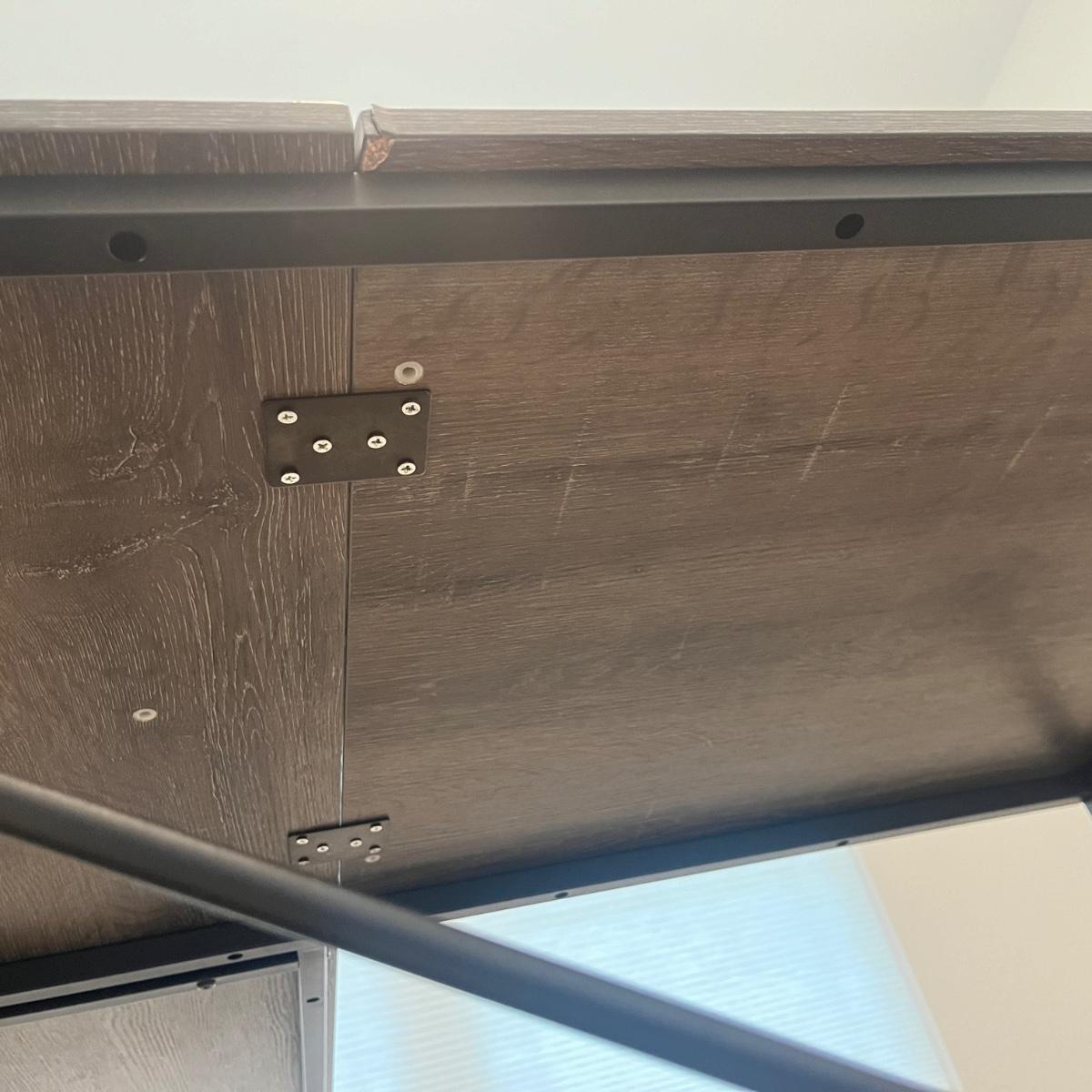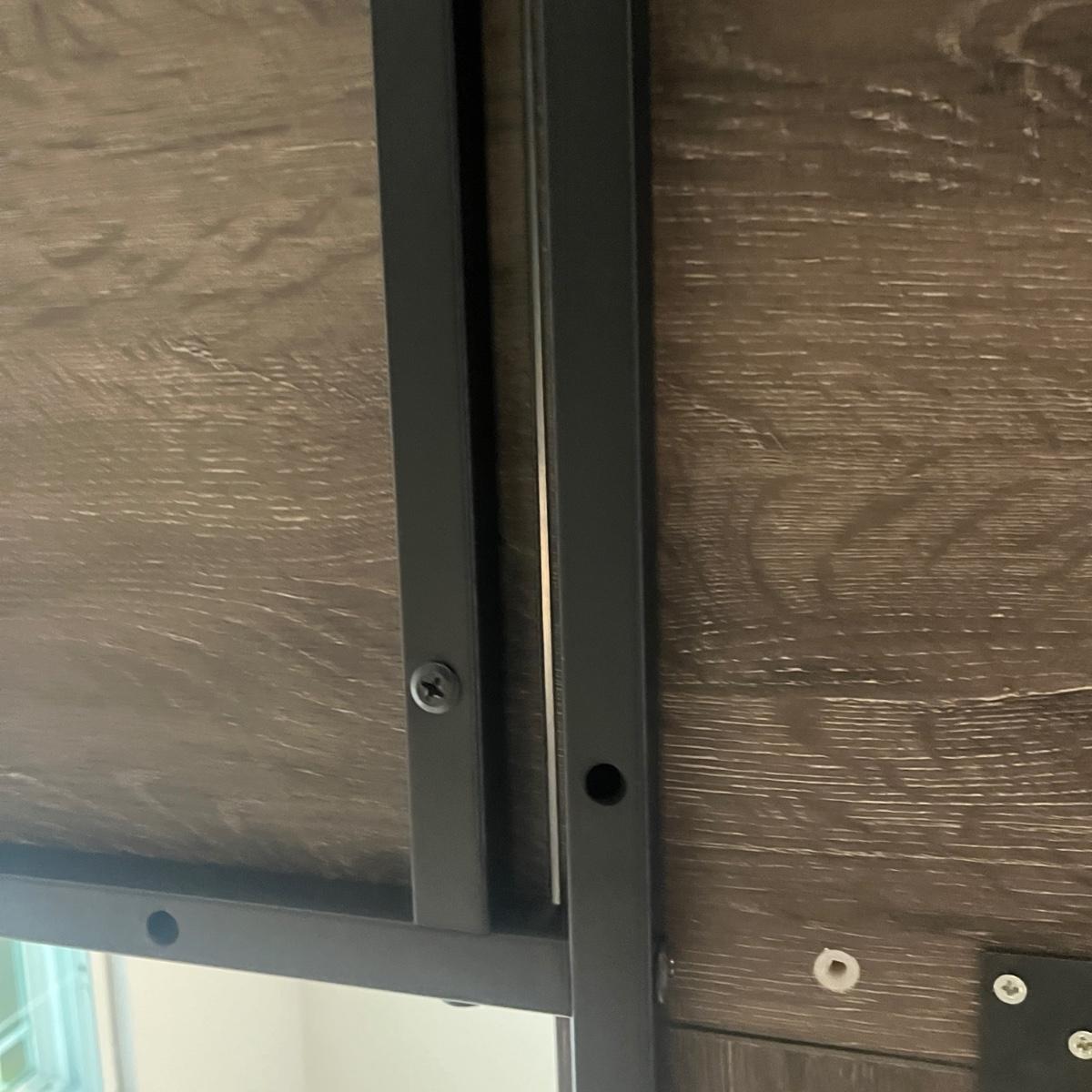 Item will need to be taken apart to remove from home and is down one flight of stairs. It is located in a basement, with a walk out door. The path to the driveway has the possibility of being muddy during pick up. Desk measures 24” x 60” x 24” x 36” with a height of 29”.
