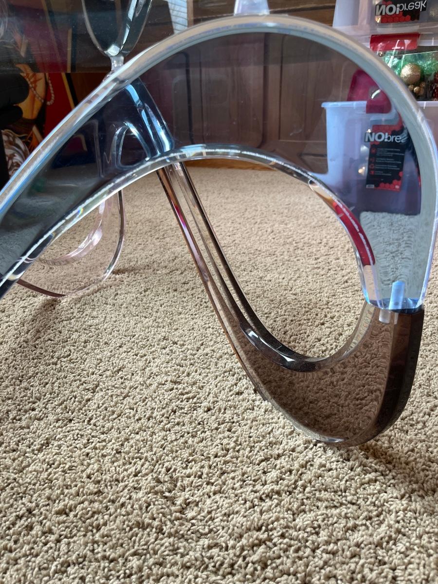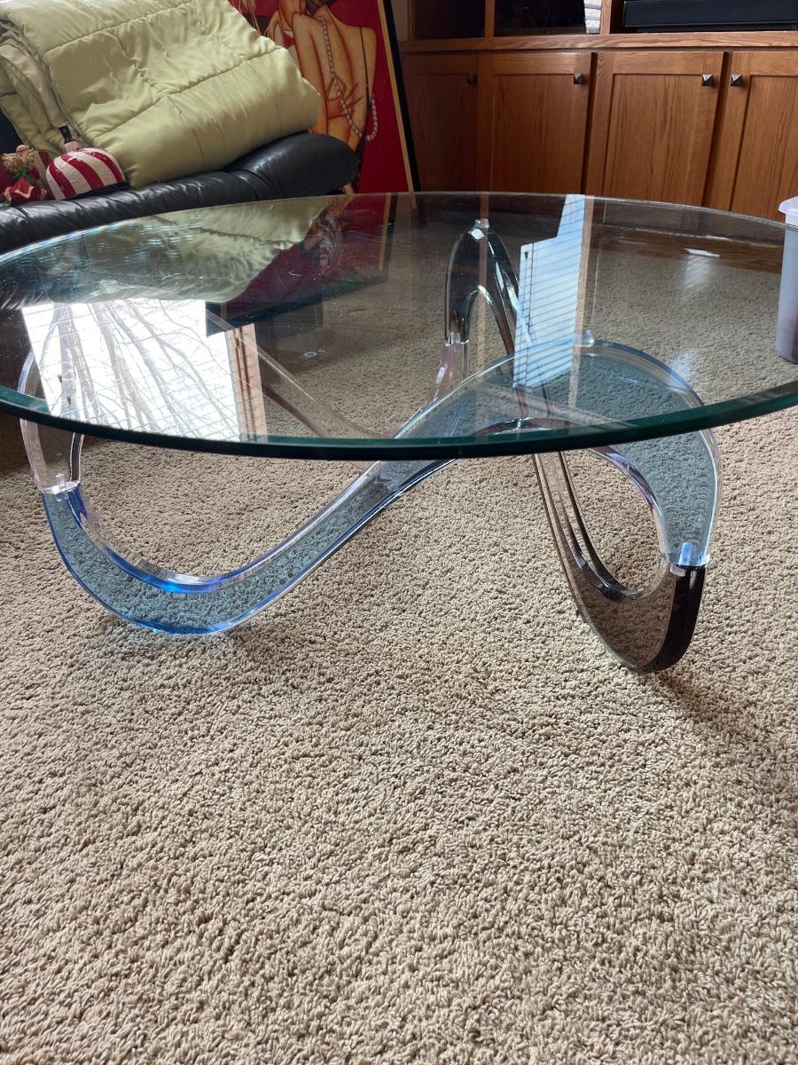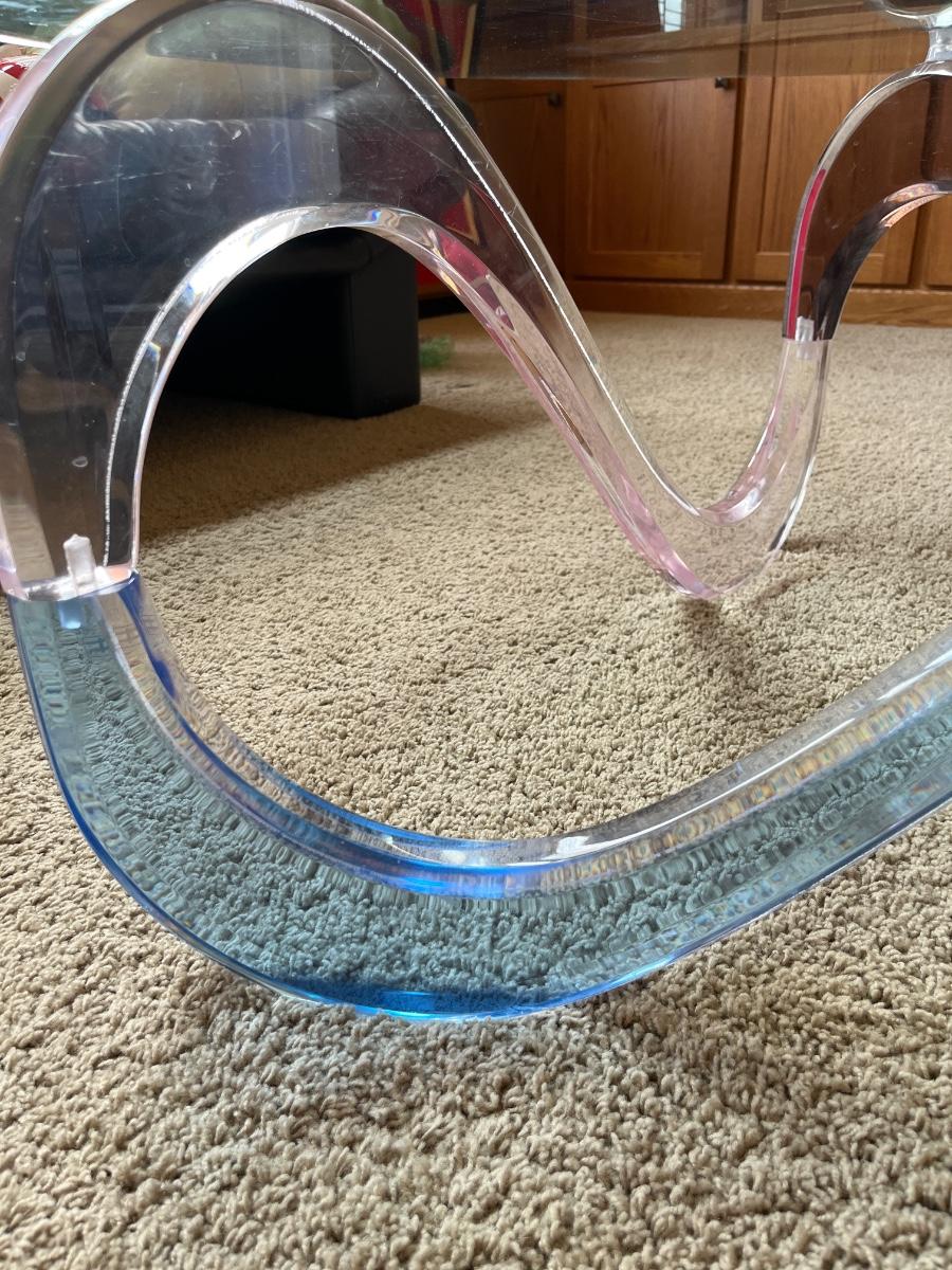 Gorgeous! Base is acrylic with blue, brown, pinkish tones. Glass too (a few light scratches). 42” round x 16” high. See pics
