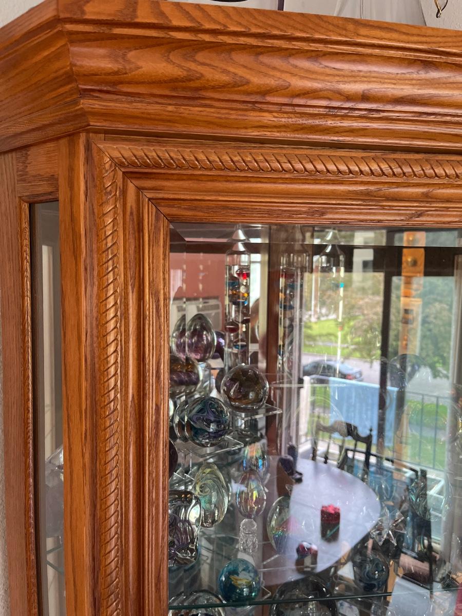 Beautiful oak corner hutch! Contents not included. 32”w x 80” h x 21”d