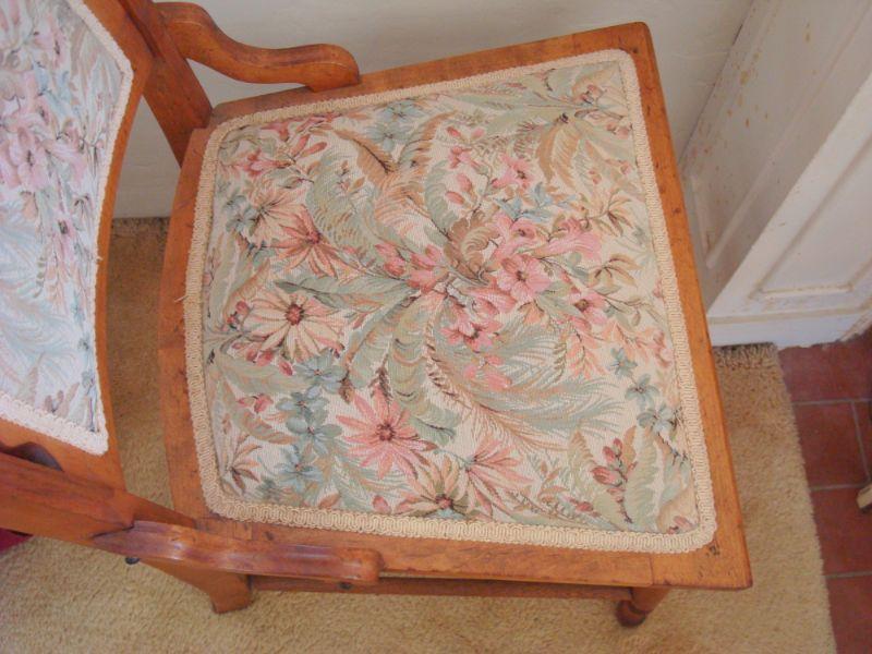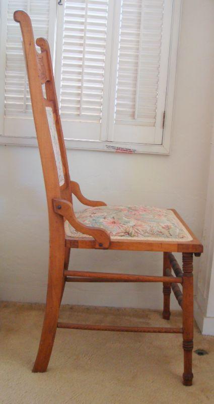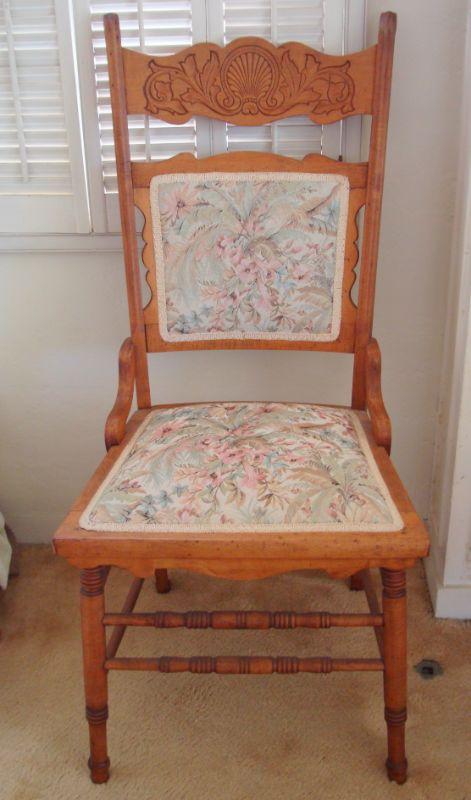 Nice pressback with vintage looking back and seat cushions. This item is 40'' tall with a seat that is 19'' x 16''