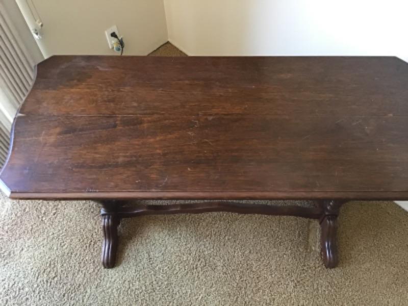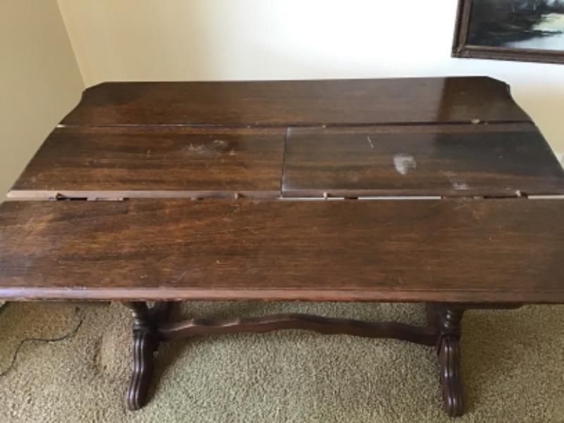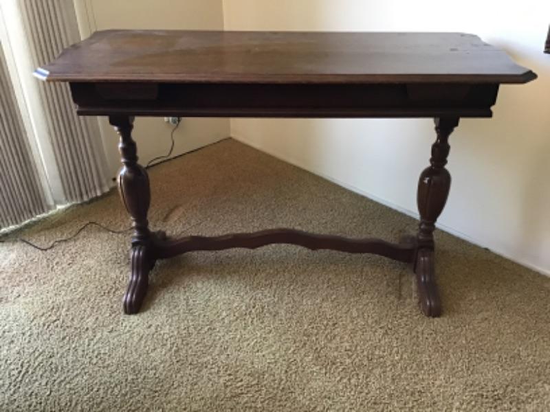 Vintage library table, side table with pull out Leaf. Measures approximately 48 inches wide 20 inches deep without the leaf, 30 inches tall
