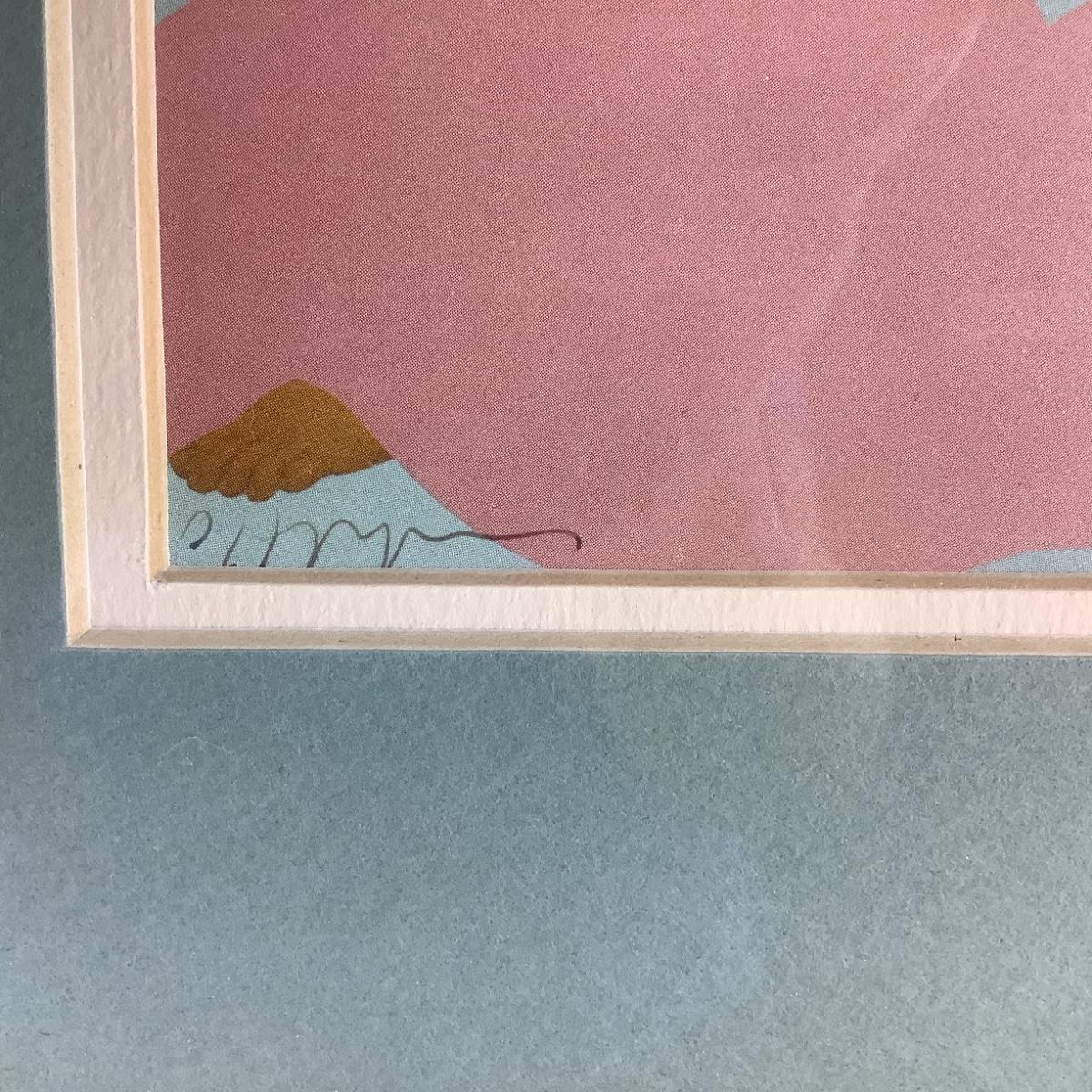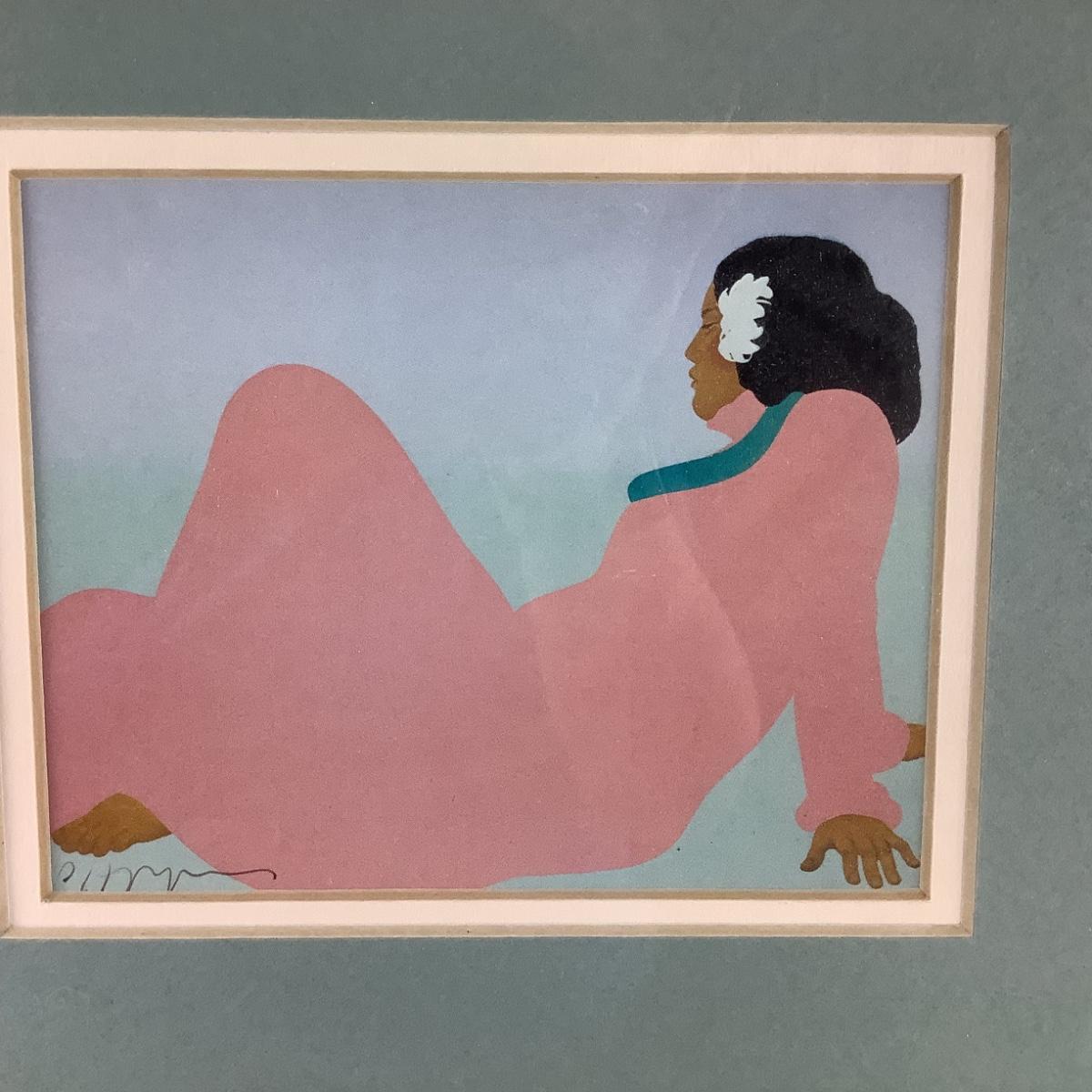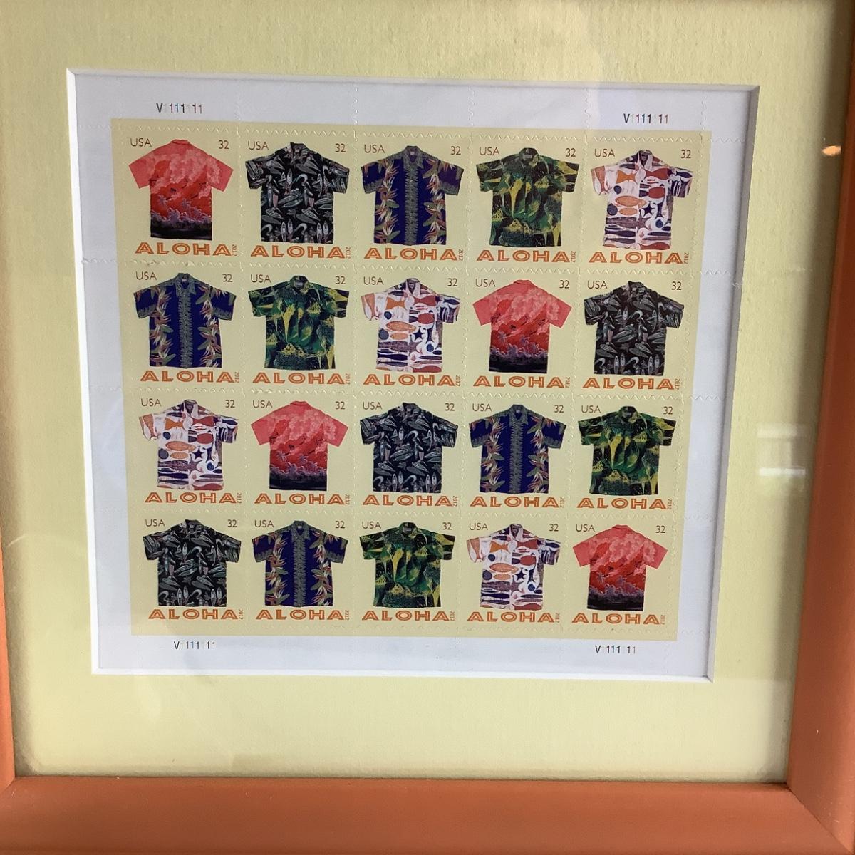 Framed and matted Peggy Hopper Signed Artwork with Framed Aloha Shirt Stamps