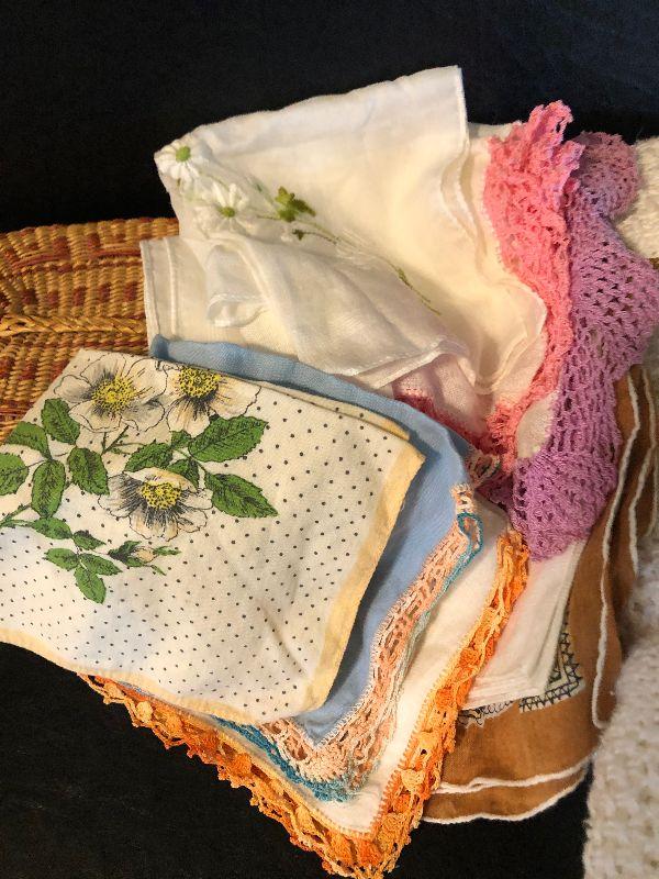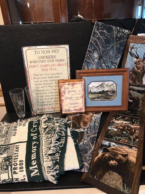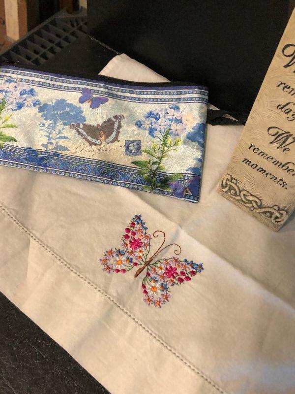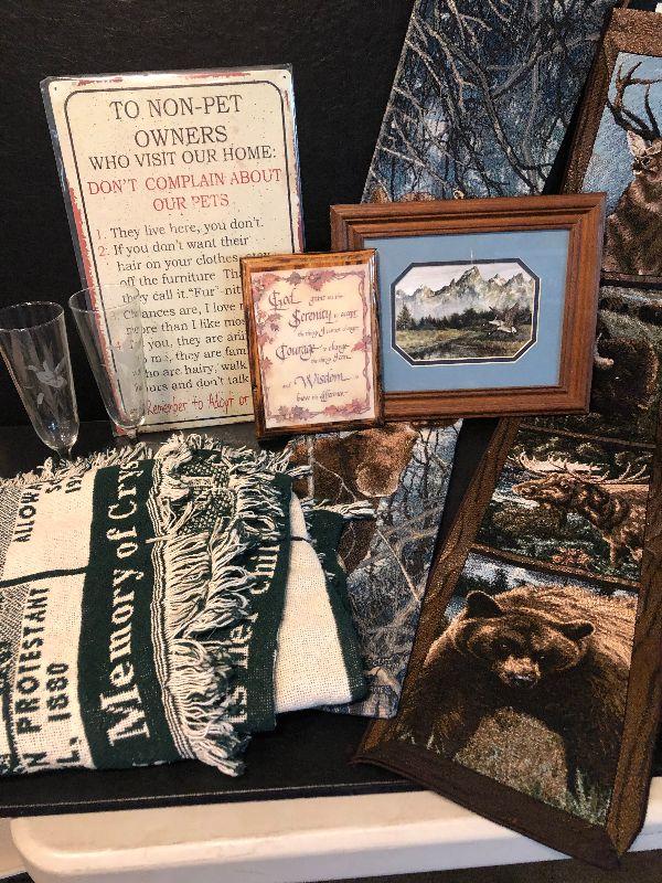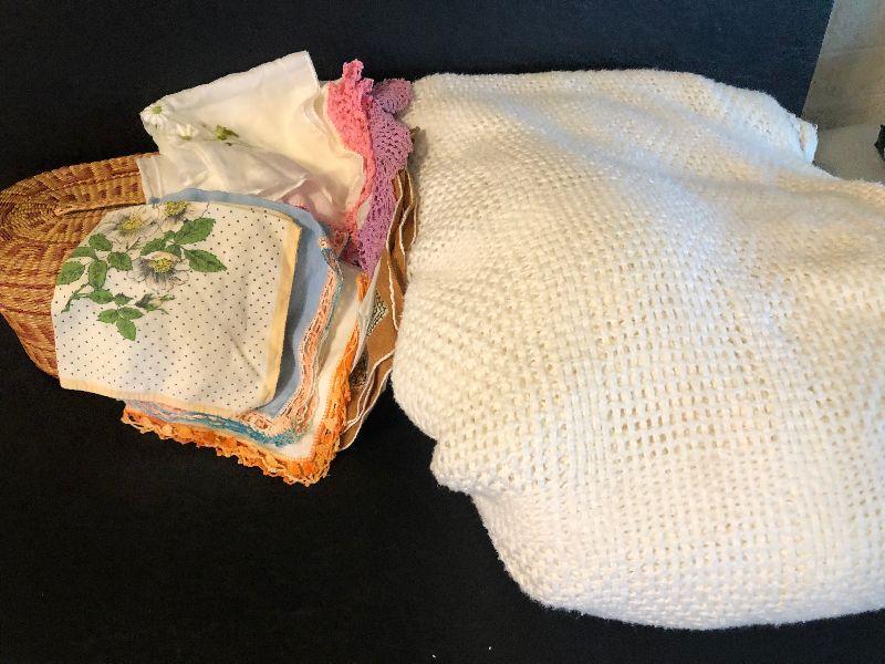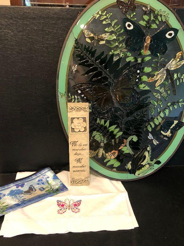 L108: Large Lot of Butterfly wall art, unique lidded basket, Salem Throw, vintage hankies & Much Much More