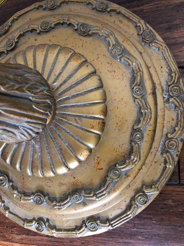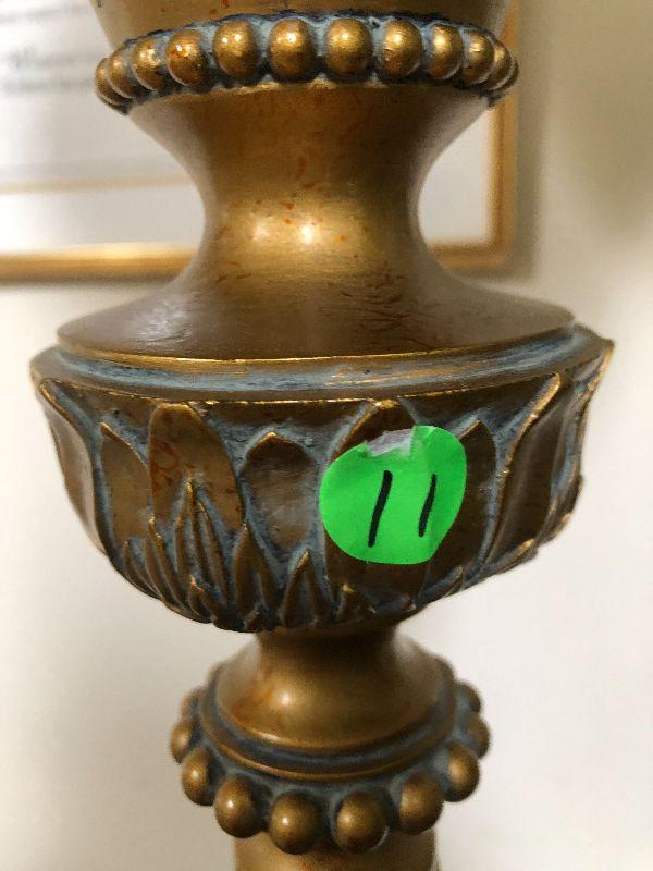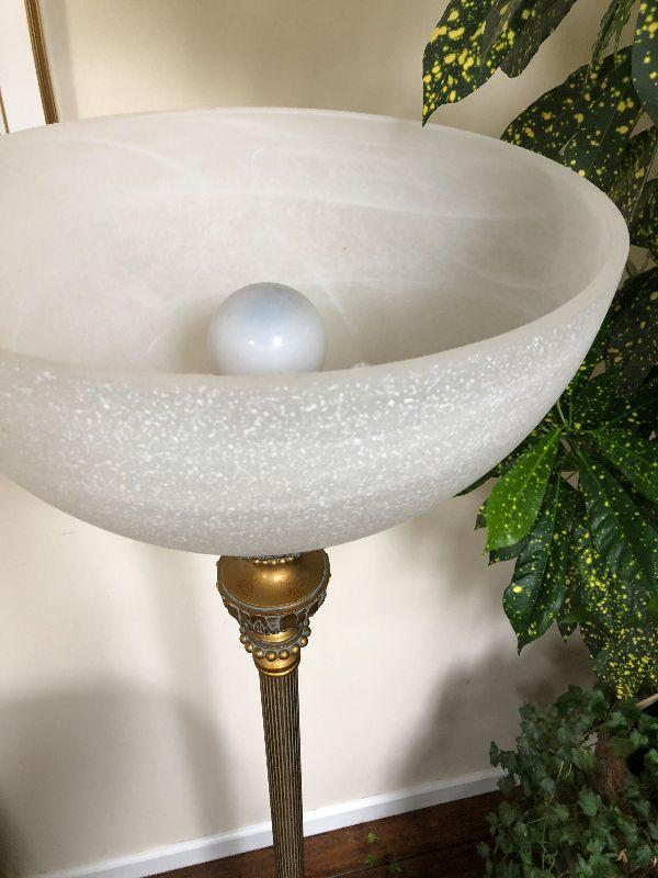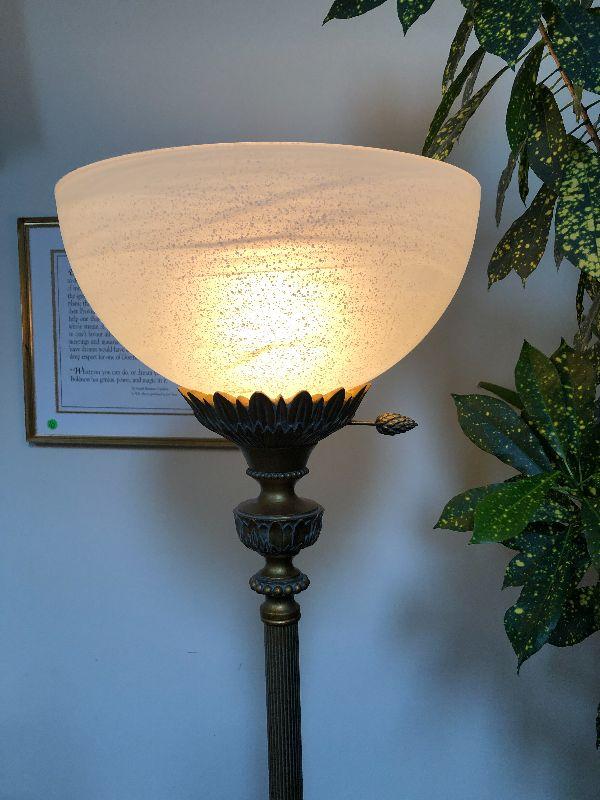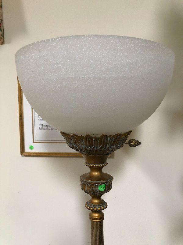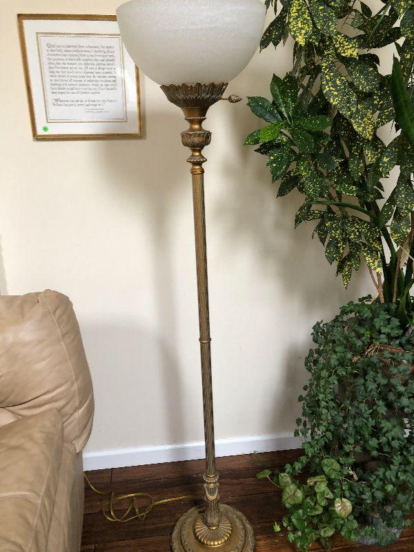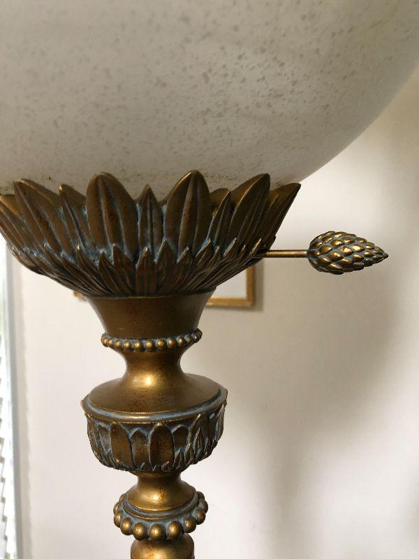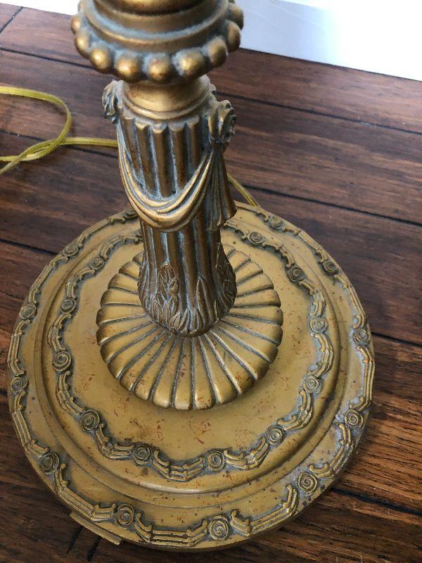 Metal and cast plaster base gold lamp with white Frosted shade. Please see all pictures for condition and measurements if taken. All items are sold as found and if furniture, you will need to be able to move yourself. Thank you for looking and have fun bidding! As always, thank you for being a Treasure Me Hunter!