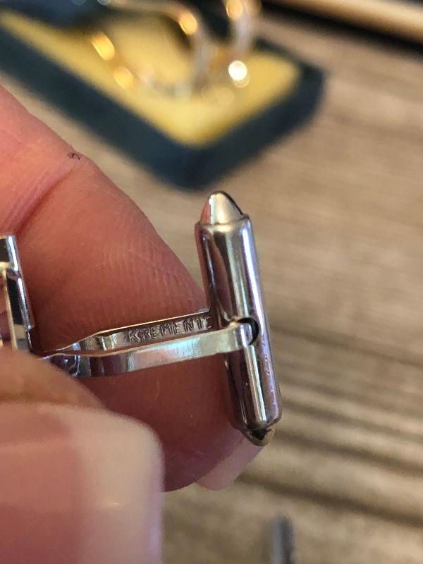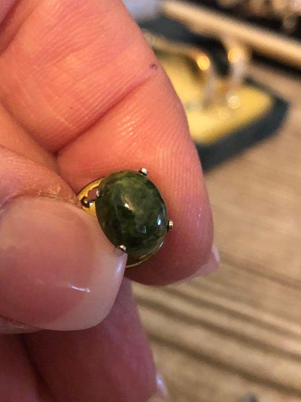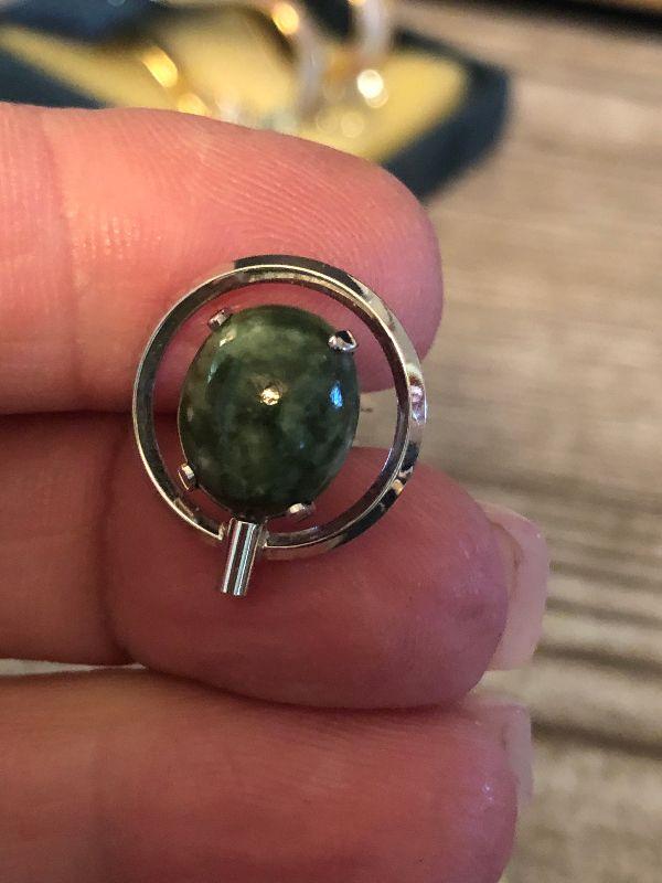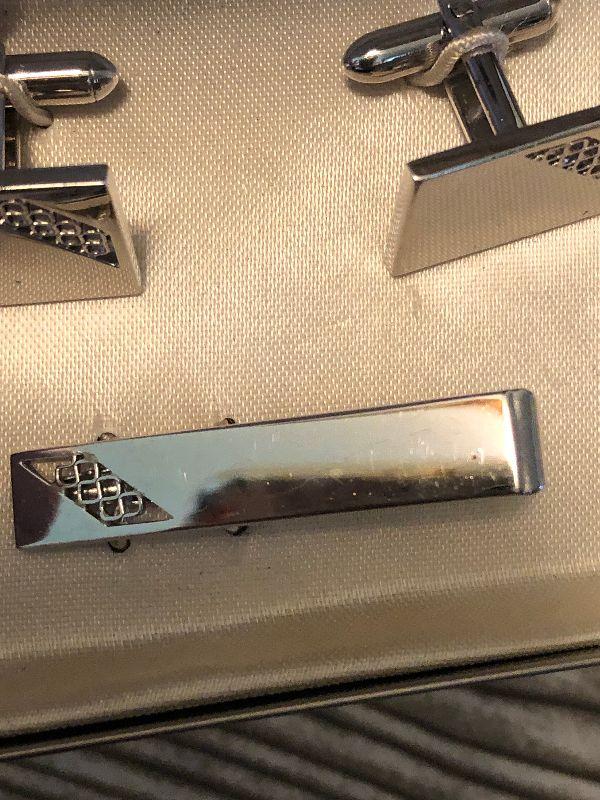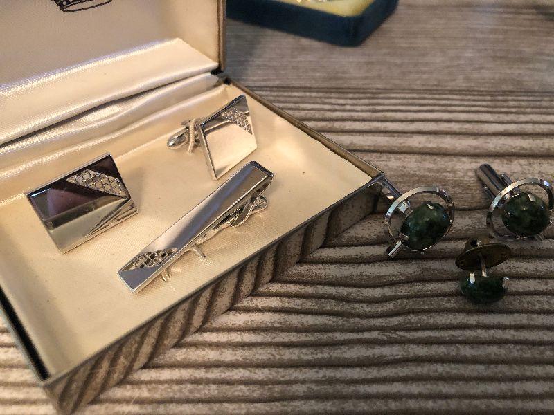 Men's silver cufflinks and tie tac by Swank. Silver and greeen cufflinks and lapel pin.